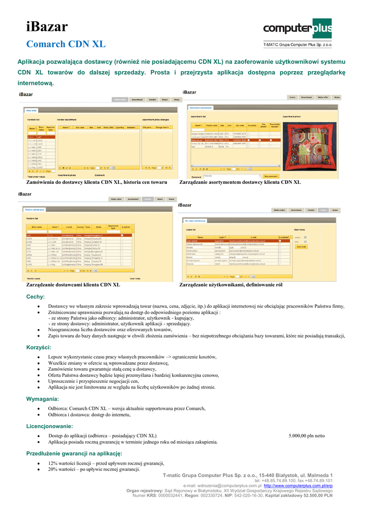 iBazar Comarch CDN XL Aplikacja pozwalająca dostawcy (również nie posiadającemu CDN XL) na zaoferowanie użytkownikowi systemu CDN XL towarów do dalszej sprzedaży. Prosta i przejrzysta aplikacja dostępna poprzez przeglądarkę internetową. Zamówienia do dostawcy klienta CDN XL, historia cen towaru Zarządzanie asortymentem dostawcy klienta CDN XL Zarządzanie dostawcami klienta CDN XL Zarządzanie użytkownikami, definiowanie ról Cechy: Dostawcy we własnym zakresie wprowadzają towar (nazwa, cena, zdjęcie, itp.) do aplikacji internetowej nie obciążając pracowników Państwa firmy, Zróżnicowane uprawnienia pozwalają na dostęp do odpowiedniego poziomu aplikacji : - ze strony Państwa jako odbiorcy: administrator, użytkownik - kupujący, - ze strony dostawcy: administrator, użytkownik aplikacji - sprzedający. Nieograniczona liczba dostawców oraz oferowanych towarów, Zapis towaru do bazy danych następuje w chwili złożenia zamówienia – bez niepotrzebnego obciążania bazy towarami, które nie posiadają transakcji, Korzyści: Lepsze wykorzystanie czasu pracy własnych pracowników –> ograniczenie kosztów, Wszelkie zmiany w ofercie są wprowadzane przez dostawcę, Zamówienie towaru gwarantuje stałą cenę u dostawcy, Oferta Państwa dostawcy będzie lepiej przemyślana i bardziej konkurencyjna cenowo, Uproszczenie i przyspieszenie negocjacji cen, Aplikacja nie jest limitowana ze względu na liczbę użytkowników po żadnej stronie. Wymagania: Odbiorca: Comarch CDN XL – wersja aktualnie supportowana przez Comarch, Odbiorca i dostawca: dostęp do internetu, Licencjonowanie: Dostęp do aplikacji (odbiorca – posiadający CDN XL) Aplikacja posiada roczną gwarancję w terminie jednego roku od miesiąca zakupienia. 5.000,00 pln netto Przedłużenie gwarancji na aplikację: 12% wartości licencji – przed upływem rocznej gwarancji, 20% wartości – po upływie rocznej gwarancji. T-matic Grupa Computer Plus Sp. z o.o., 15-440 Białystok, ul. Malmeda 1 tel. +48.85.74.89.100, fax +48.74.89.101 e-mail: [email protected] http://www.computerplus.com.pl/erp Organ rejestrowy: Sąd Rejonowy w Białymstoku, XII Wydział Gospodarczy Krajowego Rejestru Sądowego Numer KRS: 0000032441, Regon: 002330724, NIP: 542-020-16-30, Kapitał zakładowy 52.500,00 PLN