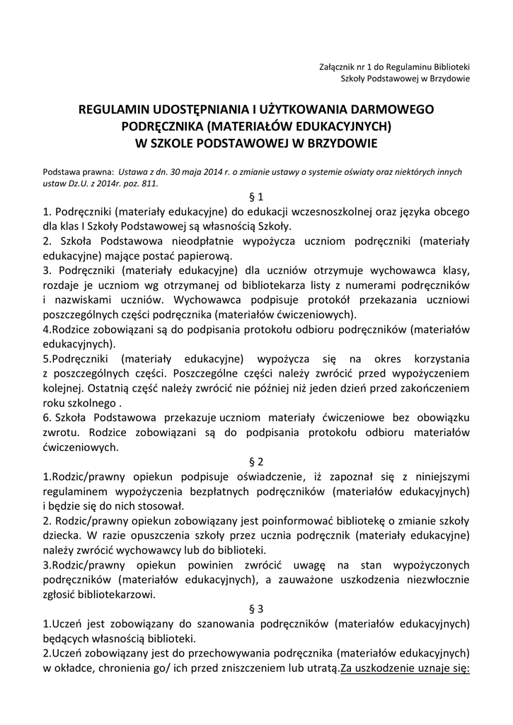 Załącznik nr 1 do Regulaminu Biblioteki Szkoły Podstawowej w Brzydowie REGULAMIN UDOSTĘPNIANIA I UŻYTKOWANIA DARMOWEGO PODRĘCZNIKA (MATERIAŁÓW EDUKACYJNYCH) W SZKOLE PODSTAWOWEJ W BRZYDOWIE Podstawa prawna: Ustawa z dn. 30 maja 2014 r. o zmianie ustawy o systemie oświaty oraz niektórych innych ustaw Dz.U. z 2014r. poz. 811. §1 1. Podręczniki (materiały edukacyjne) do edukacji wczesnoszkolnej oraz języka obcego dla klas I Szkoły Podstawowej są własnością Szkoły. 2. Szkoła Podstawowa nieodpłatnie wypożycza uczniom podręczniki (materiały edukacyjne) mające postać papierową. 3. Podręczniki (materiały edukacyjne) dla uczniów otrzymuje wychowawca klasy, rozdaje je uczniom wg otrzymanej od bibliotekarza listy z numerami podręczników i nazwiskami uczniów. Wychowawca podpisuje protokół przekazania uczniowi poszczególnych części podręcznika (materiałów ćwiczeniowych). 4.Rodzice zobowiązani są do podpisania protokołu odbioru podręczników (materiałów edukacyjnych). 5.Podręczniki (materiały edukacyjne) wypożycza się na okres korzystania z poszczególnych części. Poszczególne części należy zwrócić przed wypożyczeniem kolejnej. Ostatnią część należy zwrócić nie później niż jeden dzień przed zakończeniem roku szkolnego . 6. Szkoła Podstawowa przekazuje uczniom materiały ćwiczeniowe bez obowiązku zwrotu. Rodzice zobowiązani są do podpisania protokołu odbioru materiałów ćwiczeniowych. §2 1.Rodzic/prawny opiekun podpisuje oświadczenie, iż zapoznał się z niniejszymi regulaminem wypożyczenia bezpłatnych podręczników (materiałów edukacyjnych) i będzie się do nich stosował. 2. Rodzic/prawny opiekun zobowiązany jest poinformować bibliotekę o zmianie szkoły dziecka. W razie opuszczenia szkoły przez ucznia podręcznik (materiały edukacyjne) należy zwrócić wychowawcy lub do biblioteki. 3.Rodzic/prawny opiekun powinien zwrócić uwagę na stan wypożyczonych podręczników (materiałów edukacyjnych), a zauważone uszkodzenia niezwłocznie zgłosić bibliotekarzowi. §3 1.Uczeń jest zobowiązany do szanowania podręczników (materiałów edukacyjnych) będących własnością biblioteki. 2.Uczeń zobowiązany jest do przechowywania podręcznika (materiałów edukacyjnych) w okładce, chronienia go/ ich przed zniszczeniem lub utratą.Za uszkodzenie uznaje się: zalanie książki, wyrwaną kartkę, podartą kartkę, rozerwane książki, popisane trwale książki. 3. W podręczniku(materiałach edukacyjnych) nie wolno niczego pisać ani zaznaczać . 4.Na bieżąco należy dokonywać drobnych napraw lub ewentualnej wymiany okładki. §4 1. W przypadku, zniszczenia lub zagubienia podręczników (materiałów edukacyjnych) przez ucznia Dyrektor Szkoły zażąda od rodziców ucznia zwrotu kosztów zakupu podręczników w wysokości określonej przez Ministerstwo Edukacji Narodowej. 2. W przypadku, zniszczenia lub zagubienia podręczników (materiałów edukacyjnych) przez ucznia, zanim zakupiony zostanie nowy podręcznik, uczeń może skorzystać z dodatkowego kompletu podręczników, który będzie znajdował się w bibliotece szkolnej. Dla każdego oddziału klasowego przypada jeden dodatkowy komplet podręczników (materiałów edukacyjnych). 3. W przypadku, gdy uczeń odchodzi ze Szkoły w trakcie trwania roku szkolnego, zobowiązany jest do oddania do biblioteki szkolnej wszystkich wypożyczonych podręczników (materiałów edukacyjnych). 4. W przypadku, gdy uczeń przeniósł się z innej szkoły do Szkoły Podstawowej w Brzydowie w trakcie trwania roku szkolnego, na czas zakupu przez szkołę podręcznika dla niego, korzysta z dodatkowego kompletu podręczników (materiałów edukacyjnych) wypożyczonych z biblioteki szkolnej. §5 1. Treść oświadczenia rodzica/ prawnego opiekuna niniejszego regulaminu: o zapoznaniu się z treścią Oświadczenie Przyjmuję do wiadomości postanowienia powyższego regulaminu. Biorę na siebie pełną odpowiedzialność finansową za wypożyczone przez córkę/syna.......................................................................................................... uczennicę/ucznia klasy............ podręczniki (materiały edukacyjne), będące własnością biblioteki Szkoły Podstawowej w Brzydowie. …………………………………………………… (data) ………………………………………………………. (podpis rodzica/ prawnego opiekuna) 2. Treść protokołu przekazania i odbioru podręczników (materiałów edukacyjnych): Wychowawca klasy ……………… Imię i Nazwisko ………………………………….. w dniu: ………, przekazuję uczennicy/ uczniowi ………………………………………………………………………………….. Podręczniki (materiały edukacyjne) do edukacji wczesnoszkolnej część: …………………….. oraz do języka …………………………………………… ………………………………………………………. (podpis nauczyciela) Ja, (Imię i Nazwisko rodzica) ………………………………….. rodzic/ prawny opiekun ucznia:……………………………………………………………………………..klasy: ……………………………… potwierdzam odbiór podręcznika (materiałów edukacyjnych) do edukacji wczesnoszkolnej część: …………………….. oraz podręcznika do języka …………………………………………… …………………………………………………… (data) ………………………………………………………. (podpis rodzica/ prawnego opiekuna) 3. Treść protokołu przekazania i odbioru materiałów ćwiczeniowych: Uwaga: Materiały ćwiczeniowe stanowią własność ucznia. Nie wymagają zwrotu. Wychowawca klasy ……………… Imię i Nazwisko ………………………………….. w dniu: ………, przekazuję uczennicy/ uczniowi ………………………