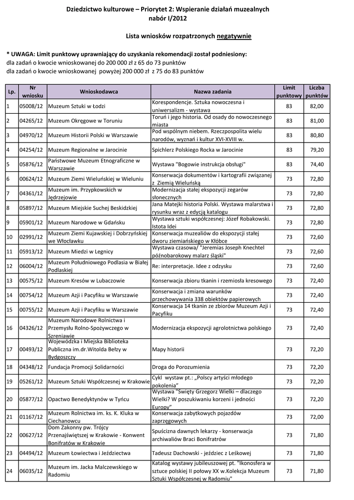 Dziedzictwo kulturowe – Priorytet 2: Wspieranie działań muzealnych nabór I/2012 Lista wniosków rozpatrzonych negatywnie * UWAGA: Limit punktowy uprawniający do uzyskania rekomendacji został podniesiony: dla zadań o kwocie wnioskowanej do 200 000 zł z 65 do 73 punktów dla zadań o kwocie wnioskowanej powyżej 200 000 zł z 75 do 83 punktów Lp. Nr wniosku Wnioskodawca 1 05008/12 Muzeum Sztuki w Łodzi 2 04265/12 Muzeum Okręgowe w Toruniu 3 04970/12 Muzeum Historii Polski w Warszawie 4 04254/12 Muzeum Regionalne w Jarocinie 5 05876/12 6 Nazwa zadania Korespondencje. Sztuka nowoczesna i uniwersalizm - wystawa Toruń i jego historia. Od osady do nowoczesnego miasta Pod wspólnym niebem. Rzeczpospolita wielu narodów, wyznań i kultur XVI-XVIII w. Limit Liczba punktowy punktów 83 82,00 83 81,00 83 80,80 Spichlerz Polskiego Rocka w Jarocinie 83 79,20 Wystawa "Bogowie instrukcja obsługi" 83 74,40 00624/12 Muzeum Ziemi Wieluńskiej w Wieluniu 73 72,80 7 04361/12 73 72,80 8 05897/12 73 72,80 9 05901/12 73 72,80 10 02991/12 73 72,60 11 05913/12 73 72,60 12 06004/12 73 72,60 13 00575/12 Muzeum Kresów w Lubaczowie 73 72,40 14 00754/12 Muzeum Azji i Pacyfiku w Warszawie 73 72,40 15 00755/12 Muzeum Azji i Pacyfiku w Warszawie 73 72,40 Modernizacja ekspozycji agrolotnictwa polskiego 73 72,40 Mapy historii 73 72,20 Droga do Porozumienia 73 72,20 73 72,20 73 72,20 73 72,00 Spuścizna dawnych lekarzy - konserwacja archiwaliów Braci Bonifratrów 73 71,80 16 17 Państwowe Muzeum Etnograficzne w Warszawie Konserwacja dokumentów i kartografii związanej z Ziemią Wieluńską Muzeum im. Przypkowskich w Modernizacja stałej ekspozycji zegarów Jędrzejowie słonecznych Jana Matejki historia Polski. Wystawa malarstwa i Muzeum Miejskie Suchej Beskidzkiej rysunku wraz z edycją katalogu Wystawa sztuki współczesnej: Józef Robakowski. Muzeum Narodowe w Gdańsku Istota Idei Muzeum Ziemi Kujawskiej i Dobrzyńskiej Konserwacja muzealiów do ekspozycji stałej we Włocławku dworu ziemiańskiego w Kłóbce Wystawa czasowa/ "Jeremias Joseph Knechtel Muzeum Miedzi w Legnicy późnobarokowy malarz śląski" Muzeum Południowego Podlasia w Białej Re: interpretacje. Idee z odzysku Podlaskiej Muzeum Narodowe Rolnictwa i 04326/12 Przemysłu Rolno-Spożywczego w Szreniawie Wojewódzka i Miejska Biblioteka 00493/12 Publiczna im.dr.Witolda Bełzy w Bydgoszczy 18 04348/12 Fundacja Promocji Solidarności 19 05261/12 Muzeum Sztuki Współczesnej w Krakowie 20 05877/12 Opactwo Benedyktynów w Tyńcu 21 01167/12 22 Muzeum Rolnictwa im. ks. K. Kluka w Ciechanowcu Dom Zakonny pw. Trójcy 00627/12 Przenajświętszej w Krakowie - Konwent Bonifratów w Krakowie Konserwacja zbioru tkanin i rzemiosła kresowego Konserwacja i zmiana warunków przechowywania 338 obiektów papierowych Konserwacja 14 tkanin ze zbiorów Muzeum Azji i Pacyfiku Cykl wystaw pt.: „Polscy artyści młodego pokolenia” Wystawa "Święty Grzegorz Wielki – dlaczego Wielki? W poszukiwaniu korzeni i jedności Europy” Konserwacja zabytkowych pojazdów zaprzęgowych 23 04494/12 Muzeum Łowiectwa i Jeździectwa Tadeusz Dachowski - jeździec z Leśkowej 73 71,80 24 Muzeum im. Jacka Malczewskiego w 06035/12 Radomiu Katalog wystawy jubileuszowej pt. "Ikonosfera w sztuce polskiej II połowy XX w.Kolekcja Muzeum Sztuki Współczesnej w Radomiu" 73 71,80 Konserwacja zabytkowych kobiecych pojazdów zimowych ze zbiorów Muzeum – Zamku w Łańcucie. Organizacja wystawy po konserwatorskiej Konserwacja spuścizny Manufaktury Tkackiej ŁAD - I etap 25 02008/12 Muzeum-Zamek w Łańcucie 26 01246/12 Muzeum Historyczne m. st. Warszawy 27 04263/12 Muzeum Marii Konopnickiej w Żarnowcu Poleciały pieśni moje 28 04290/12 29 04944/12 Muzeum Archeologiczne w Krakowie 30 04392/12 Muzeum Zamkowe w Pszczynie 31 02323/12 Polska Akademia Umiejętności 32 Muzeum Górnictwa Węglowego w Zabrzu 71,75 73 71,60 73 71,60 73 71,60 73 71,60 73 71,50 73 71,40 73 71,40 73 71,40 73 71,40 73 71,40 73 71,40 Wystawa Sztuki Polskiej 73 71,40 Myśli i słowa - konserwacja starodruków 73 71,20 Modernizacja wystaw stałych poświęconych kulturze górniczej Organizacja wystawy czasowej pn. "Kultura badeńska- manieryzm polskiego neolitu" Zakup gablot Konserwacja zbiorów specjalnych: rękopisów, str. druków, rycin, map Konserwacja zagrzybiałych inkunabułów z 02336/12 Archiwum Archidiecezjalne w Szczecinie Kamienia Pomorskiego Wojewódzka Biblioteka Publiczna Książnica Kopernikańska w Toruniu 33 02441/12 34 04147/12 Muzeum Wsi Kieleckiej w Kielcach 35 04282/12 Muzeum Obozów Jenieckich 36 04294/12 Muzeum Kinematografii w Łodzi 37 04946/12 38 73 Muzeum Sztuki Nowoczesnej w Warszawie Muzeum Ziemi Chełmskiej im. Wiktora 02333/12 Ambroziewicza w Chełmie Ratujemy Dziedzictwo Zakup wyposażenia do pracowni konserwatorskiej Parku Etnograficznego w Rewitalizacja ekspozycji głównej Muzeum Obozów Jenieckich Modernizacja wystawy stałej " Od negatywu do kopii" 39 04279/12 Muzeum Archeologiczne w Gdańsku Modernizacja wystawy stałej Muzeum Archeologicznego w Gdańsku przy ul. Mariackiej 25/26 - etap I 73 71,20 40 05546/12 Fundacja AVE Portrety wspomnień 73 71,20 41 04791/12 Muzeum Miasta Łodzi Andrzej Kruetz - Majewski (1934-2011) wspomnienie. Dialog Majewski - Dejmek 73 71,00 42 01133/12 Konserwacja wentylatora kopalnianego w Zabrzu 73 70,80 43 04253/12 Muzeum Narodowe w Gdańsku 73 70,80 44 05972/12 Muzeum Wsi Lubelskiej w Lublinie 73 70,80 45 00788/12 Konserwacja rękopisów 73 70,60 46 02970/12 Fundacja dla Śląska Konserwacja Śląskiej Kolekcji Sztuki Współczesnej 73 70,60 47 04310/12 Fundacja Filmowa Se-ma-for Modernizacja Muzeum Bajki Se-ma-for 73 70,60 48 05336/12 73 70,60 49 04317/12 Muzeum Okręgowe w Tarnowie 73 70,50 50 04640/12 73 70,40 73 70,20 73 70,20 73 70,20 73 70,00 51 52 Zabytkowa Kopalnia Węgla Kamiennego "Guido" Muzeum im ks. dr Władysława Łęgi w Grudziadzu Muzeum Ziemi Puckiej im. Floriana Ceynowy w Pucku Muzeum Lubuskie im. Jana Dekerta w Gorzowie W