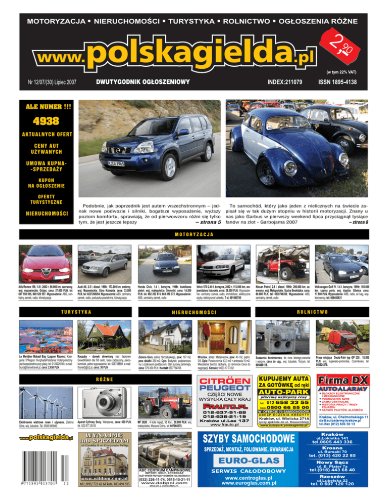 ALE NUMER !!! 4938 AK TU A LNYC H O F ERT C ENY A U T U ŻYWA NYC H U M O WA K U P NA-S P R ZED A ŻY KUPON NA OGŁOSZENIE OFERTY TURYSTYCZNE NI ER U C H O M O ŚCI Podobnie, jak poprzednik jest autem wszechstronnym – jednak nowe podwozie i silniki, bogatsze wyposażenie, wyższy poziom komfortu, sprawiają, że od pierwowzoru różni się tylko tym, że jest jeszcze lepszy – strona 5 To samochód, który jako jeden z nielicznych na świecie zapisał się w tak dużym stopniu w historii motoryzacji. Znany u nas jako Garbus w pierwszy weekend lipca przyciągnął tysiące fanów na zlot - Garbojama 2007 – strona 8 MOTORYZACJA Alfa Romeo 156, 1.8 l, 2002 r, 90.000 km, czerwony, woj. mazowieckie, Grójec, cena: 27.000 PLN, tel. 607 559 505, 609 520 557. Wyposażenie: ABS, centralny zamek, radio, klimatyzacja Audi A6, 2.5 l, diesel, 1998r, 173.000 km, srebrny, woj. Mazowieckie, Góra Kalwaria, cena: 33.000 PLN, tel: 0227268284, Wyposażenie: ABS, centralny zamek, radio, poduszka powietrzna, klimatyzacja TURYSTYKA Le Meridien Makadi Bay /Lagoon Rooms/, Kategoria: 5*Region: HurghadaPołożenie: Hotel położony jest bezpośrednio przy plaży, tel: 0124226140, e-mail: [email protected], cena: 2.650 PLN Honda Civic, 1.4 l, benzyna, 1998r, butelkowa zieleń, woj. małopolskie, Słomniki, cena: 14.200 PLN, tel. 662 252 674, 663 810 372. Wyposażenie: ABS, centralny zamek, radio NIERUCHOMOŒCI Kaszuby - domek drewniany nad Jeziorem Gowidlińskim dla 5/6 osób, taras zadaszony, piecokominek, pełne wyposażenie, tel: 506738889, e-mail: [email protected], cena: 30 PLN Zielona Góra, adres: Skrzetuskiego, pow: 167 m2, pow. działki: 255 m2, Opis: Budynek podpiwniczony z użytkowym poddaszem. Stan surowy zamknięty. cena: 379.000 PLN. Kontakt 0607734766 RÓ¯NE Elektrownie wiatrowe nowe i używane, Zielona Góra, woj. lubuskie. Tel. 0508 845840. Volvo V70 2.40 l, benzyna, 2002 r, 113.000 km, województwo lubuskie, cena: 28.000 PLN. Wyposażenie: centralny zamek, radio, immobilizer, elektryczne szyby, elektryczne lusterka. T el. 691985785 Aparat Cyfrowy Sony, Warszawa, cena: 639 PLN, tel. 022 877 28 55 . MF 2620 , 4 koła napęd, 95 KM , 30.000 PLN, woj. małopolskie, Mszana Dolna, tel: 607068575. Wrocław, adres: Metalowców, pow: 43 m2, piętro: 3/5, Opis: Powierzchnia: 43,3 m2 + antresola 10 m2. Mieszkanie bardzo zadbane, po remoncie Cena do negocjacji. Kontakt.: 0503 17 73 82 Nissan Patrol, 2.8 l, diesel, 1990r, 290.000 km, czerwony, woj. Małopolskie, Sucha Beskidzka, cena: 60.000 PLN, tel: 0338746350, Wyposażenie: ABS, centralny zamek, radio Volkswagen Golf IV, 1.4 l, benzyna, 1999r, 185.000 km, czarna perła, woj. śląskie, Gliwice, cena: 17.900 PLN, Wyposażenie: ABS, radio, air bag, wsp. kierownicy, tel: 606450631 ROLNICTWO Suszarnia kontenerowa, do runa leśnego,owoców i warzyw, cena do uzg., woj. lubuskie, Torzym, tel: 609486115. Prasa rolująca Deutz-Fahr typ GP 220 , 18.500 PLN, woj. kujawsko-pomorskie, Czernikowo, tel: 050824278.