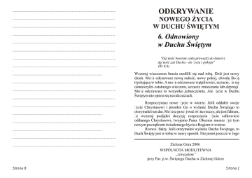 ................................................................................................................... .................................................................................................................. ................................................................................................................... .................................................................................................................. ................................................................................................................... 6. Odnowiony w Duchu Świętym .................................................................................................................. ................................................................................................................... .................................................................................................................... . .................................................................................................... .................................................................................................................. ................................................................................................................... .................................................................................................................. .................................................................................................................. .................................................................................................... ................................................................................................................... .................................................................................................... "Dążność bowiem ciała prowadzi do śmierci, dążność zaś Ducha - do życia i pokoju" (Rz 8,6) Wczoraj wieczorem bracia modlili się nad tobą. Dziś jest nowy dzień. Może odczuwasz nową radość, nowy pokój, chwałę Bożą tryskającą w tobie. A może odczuwasz wątpliwości, uczucie, że się ośmieszyłeś ostatniego wieczoru, uczucie zmieszania lub depresji. Może odczuwasz to wszystko jednocześnie. Ale życie w Duchu Świętym nie opiera się na odczuciach. Rozpoczynasz nowe życie w wierze. Jeśli oddałeś swoje życie Chrystusowi i prosiłeś Go o wylanie Ducha Świętego to otrzymałeś ten dar. Możesz przeżywać różne rzeczy, ale jest faktem, że wczoraj podjąłeś decyzję rozpoczęcia życia całkowicie oddanego Chrystusowi, twojemu Panu. Obecnie musisz żyć tym nowym początkiem świadomego bycia z Bogiem w wierze. Rozważ fakty. Jeśli otrzymałeś wylanie Ducha Świętego, to Duch Święty jest w tobie w nowy sposób. Nie jesteś jeszcze w Jego ................................................................................................................... .................................................................................................................. Strona 8 Strona 1 pełnym posiadaniu. Musisz jeszcze nadal wzrastać w Duchu Świętym. Lecz On jest już w tobie w nowy sposób. Szatan także interesuje się tobą w nowy sposób. Ponieważ teraz masz więcej duchowej mocy, jesteś dla niego bardziej niebezpieczny i chciałby cię powstrzymać. Taktyka numer jeden, którą posługuje się szatan polegać będzie na usilnym przekonywaniu ciebie, że nic się nie wydarzyło, że to nie był żaden "chrzest w Duchu", że to nie było prawdziwe, że to tylko uczucia. Być może będzie cię tak okłamywał abyś przypadkiem nie wykorzystał tej mocy, którą otrzymałeś. Taktyka numer dwa jest wręcz odwrotna. Polega ona na przekonywaniu ciebie, że skoro masz już Ducha Świętego, to jesteś doskonały. Wszystkie twoje problemy zniknęły i nie potrzebujesz już niczego, ani też nikogo więcej. Szatan będzie się starał wmówić w ciebie, że już nie potrzebujesz się modlić, ani uczyć się jak żyć w Duchu Świętym, że już nie potrzebujesz pomocy innych chrześcijan. Gdy zauważysz, że szereg takich myśli przychodzi ci do głowy, miej się na baczności. Szatan gotuje ci upadek. Nie lękaj się! Z prostotą zaufaj Bogu. Odrzuć wszelkie wątpliwości i obawy. Niech twoje wnętrze napełni się pokojem, radością i chwałą Bożą. W pokorze zacznij uczyć się od Boga i od twoich sióstr i braci jak żyć w Duchu Świętym. Pamiętaj, że jesteś dopiero na początku drogi. Nie pozwól by niepokoił cię dar języków. Jeżeli ostatniego wieczoru nie modliłeś się językami to po prostu czekaj, a może to nastąpi. To może się zdarzyć w każdej chwili. Jeżeli mówiłeś coś wczoraj, to mimo, że nie jesteś pewny, powtarzaj te dźwięki. Jeżeli jest to dar języków, będzie on wzrastał i rozwijał się. Módl się darem języków każdego dnia. Jego wartość dla ciebie będzie wzrastać. W tym tygodniu proś Maryję: Pomóż mi, Matko, rozpoznać i wykorzystać wszystkie dary ofiarowane mi przez Ducha Świętego. Pomóż, by dzięki współpracy z łaską obficie przejawiły się w moim życiu owoce Ducha Świętego. Matko Kościoła, dopomóż mi bardziej odnaleźć wspólnotę Kościoła Strona 2 Studium Pisma św.: Dwa rozdziały, które będziemy czytać w tym tygodniu mówią o pielęgnowaniu życia Bożego, które zostało nam dane: J 15; Ga 5 Przeżyłeś modlitwę o nowe wylanie Ducha Świętego. Zapisz swoje refleksje: ................................................................................................................... .................................................................................................................. ................................................................................................................... .................................................................................................................. ..........................