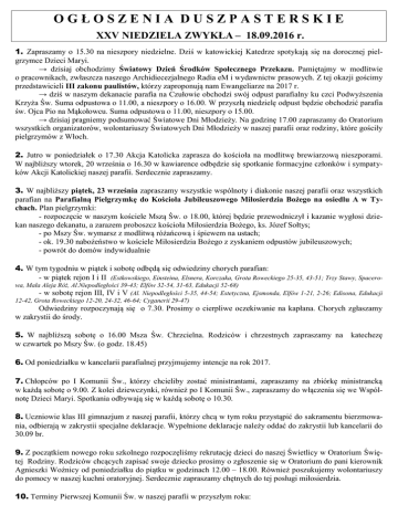OGŁOSZENIA DUSZPASTERSKIE XXV NIEDZIELA ZWYKŁA – 18.09.2016 r. 1. Zapraszamy o 15.30 na nieszpory niedzielne. Dziś w katowickiej Katedrze spotykają się na dorocznej pielgrzymce Dzieci Maryi. → dzisiaj obchodzimy Światowy Dzień Środków Społecznego Przekazu. Pamiętajmy w modlitwie o pracownikach, zwłaszcza naszego Archidiecezjalnego Radia eM i wydawnictw prasowych. Z tej okazji gościmy przedstawicieli III zakonu paulistów, którzy zaproponują nam Ewangeliarze na 2017 r. → dziś w naszym dekanacie parafia na Czułowie obchodzi swój odpust parafialny ku czci Podwyższenia Krzyża Św. Suma odpustowa o 11.00, a nieszpory o 16.00. W przyszłą niedzielę odpust będzie obchodzić parafia św. Ojca Pio na Mąkołowcu. Suma odpustowa o 11.00, nieszpory o 15.00. → dzisiaj pragniemy podsumować Światowe Dni Młodzieży. Na godzinę 17.00 zapraszamy do Oratorium wszystkich organizatorów, wolontariuszy Światowych Dni Młodzieży w naszej parafii oraz rodziny, które gościły pielgrzymów z Włoch. 2. Jutro w poniedziałek o 17.30 Akcja Katolicka zaprasza do kościoła na modlitwę brewiarzową nieszporami. W najbliższy wtorek, 20 września o 16.30 w kawiarence odbędzie się spotkanie formacyjne członków i sympatyków Akcji Katolickiej naszej parafii. Serdecznie zapraszamy. 3. W najbliższy piątek, 23 września zapraszamy wszystkie wspólnoty i diakonie naszej parafii oraz wszystkich parafian na Parafialną Pielgrzymkę do Kościoła Jubileuszowego Miłosierdzia Bożego na osiedlu A w Tychach. Plan pielgrzymki: - rozpoczęcie w naszym kościele Mszą Św. o 18.00, której będzie przewodniczył i kazanie wygłosi dziekan naszego dekanatu, a zarazem proboszcz kościoła Miłosierdzia Bożego, ks. Józef Sołtys; - po Mszy Św. wymarsz z modlitwą różańcową i śpiewem na ustach; - ok. 19.30 nabożeństwo w kościele Miłosierdzia Bożego z zyskaniem odpustów jubileuszowych; - powrót do domów indywidualnie 4. W tym tygodniu w piątek i sobotę odbędą się odwiedziny chorych parafian: - w piątek rejon I i II (Estkowskiego, Einsteina, Elsnera, Korczaka, Grota Roweckiego 25-35, 43-51; Trzy Stawy, Spacerowa, Mała Aleja Róż, Al.Niepodległości 39-43; Elfów 32-54, 31-63, Edukacji 52-68) - w sobotę rejon III, IV i V (Al. Niepodległości 5-35, 44-54; Estetyczna, Ejsmonda, Elfów 1-21, 2-26; Edisona, Edukacji 12-42, Grota Roweckiego 12-20, 24-32, 46-64; Cyganerii 29-47) Odwiedziny rozpoczynają się o 7.30. Prosimy o cierpliwe oczekiwanie na kapłana. Chorych zgłaszamy w zakrystii do środy. 5. W najbliższą sobotę o 16.00 Msza Św. Chrzcielna. Rodziców i chrzestnych zapraszamy na katechezę w czwartek po Mszy Św. (o godz. 18.45) 6. Od poniedziałku w kancelarii parafialnej przyjmujemy intencje na rok 2017. 7. Chłopców po I Komunii Św., którzy chcieliby zostać ministrantami, zapraszamy na zbiórkę ministrancką w każdą sobotę o 9.00. Z kolei dziewczynki, również po I Komunii Św., zapraszamy do włączenia się we Wspólnotę Dzieci Maryi. Spotkania odbywają się w każdą sobotę o 10.30. 8. Uczniowie klas III gimnazjum z naszej parafii, którzy chcą w tym roku przystąpić do sakramentu bierzmowania, odbierają w zakrystii specjalne deklaracje. Wypełnione deklaracje należy oddać do zakrystii lub kancelarii do 30.09 br. 9. Z początkiem nowego roku szkolnego rozpoczęliśmy rekrutację dzieci do naszej Świetlicy w Oratorium Świętej Rodziny. Rodziców chcących zapisać swoje dziecko prosimy o zgłoszenie się w Oratorium do pani kierownik Agnieszki Woźnicy od poniedziałku do piątku w godzinach 12.00 – 18.00. Również poszukujemy wolontariuszy do pomocy w naszej kuchni oratoryjnej. Serdecznie zapraszamy chętnych do tej posługi miłosierdzia. 10. Terminy Pierwszej Komunii Św. w naszej parafii w przyszłym roku: → dzieci naszej parafii: środa, 3 maja, w Uroczystość NMP Królowej Polski o godz. 12.00; → dzieci ze szkoły Społecznego Towarzystwa Oświaty: niedziela, 7 maja, godz. 12.00; Prosimy, aby rodzice którzy chcą posłać swoje dziecko do Pierwszej Komunii Św. w naszej parafii, w najbliższym tygodniu w kancelarii parafialnej odbierali deklarację przystąpienia do przygotowań. Także zapraszamy do kancelarii rodziców, którzy chcieliby posłać swoje dziecko do Wczesnej Komunii Św. 11. Zapraszamy na Parafialną Pielgrzymkę do Ziemi Świętej, która odbędzie się od 11-18.02.2017 r. Szczegółowe informacje znajdują na plakacie. Zapisy u ks. Macieja. 12. W parafii św.Jana Chrzciciela w Tychach rozpoczyna się kolejna edycja Kursu Alfa. Kurs jest serią dziesięciu cotygodniowych spotkań, które pokazują, że CHRZEŚCIJAŃSTWO TO PRZEDE WSZYSTKIM OSOBISTA RELACJA I WIĘŹ Z CHRYSTUSEM. Jednocześnie kurs odpowiada na podstawowe pytania dotyczące modlitwy, wiary, dotyka tematów darów Ducha Świętego oraz Bożego działania w życiu człowieka. Pierwsze spotkanie w środę, 28 września o godz. 19.30 w kawiarence parafialnej parafii św. Jana Chrzciciela. 13. Po Mszy Św. przed kościołem można nabywać prasę katolicką! W Gościu Niedzielnym, m.in. artykuł: Czy Polacy mieszkający w Anglii mają się czego bać? Reportaż z Harlow, gdzie niedawno zamordowano naszego rodaka! 14. Dziękujemy tym, którzy wysprzątali nasz kościół i przygotowali na dzisiejszą niedzielną liturgię. 15. Serdecznie dziękujemy za dzisiejszy dar materialny na Wydział Teologiczny Uniwersytetu Śląskiego. W przyszłą niedzielę kolekta specjalna na remont dachu naszego kościoła i oratorium. 16. Dziś przed kościołem uczniowie Liceum "Kruczkowskiego" zbierają podpisy poparcia wniosku „OAZA ZDROWIA – DLA WSZYSTKICH” finansowanego z budżetu partycypacyjnego Urzędu Miasta Tychy.