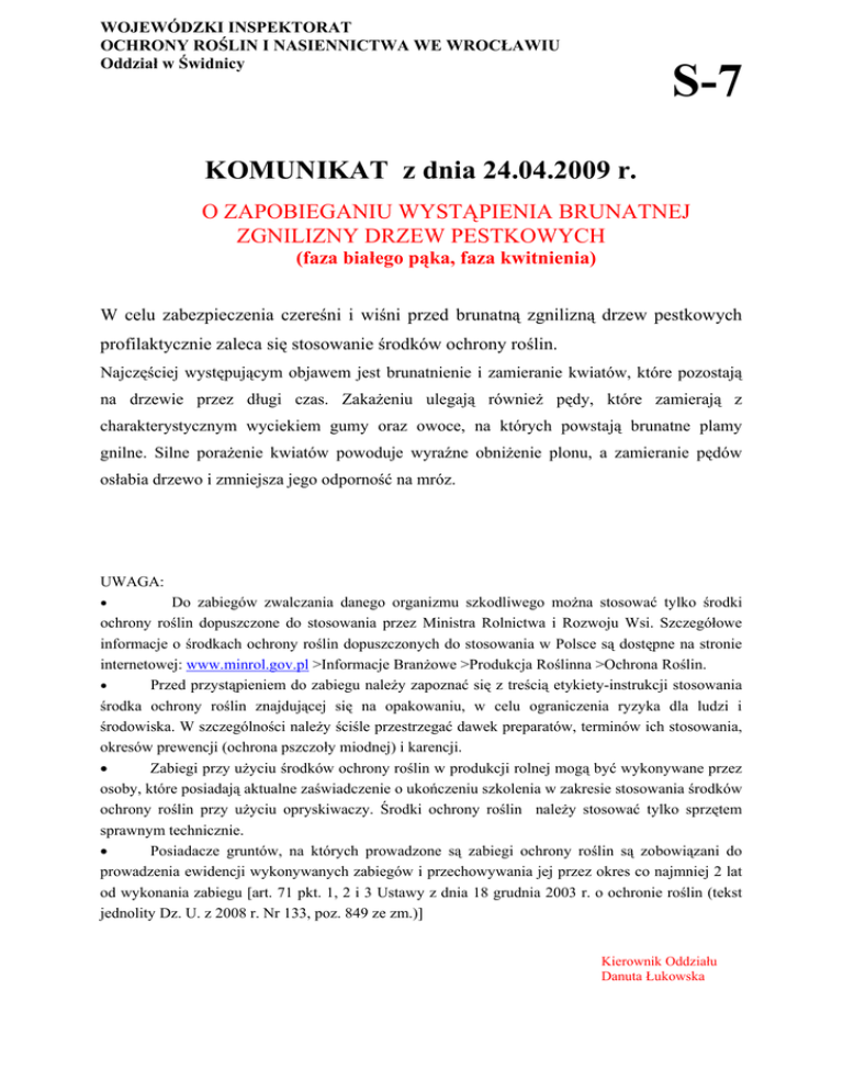 WOJEWÓDZKI INSPEKTORAT OCHRONY ROŚLIN I NASIENNICTWA WE WROCŁAWIU Oddział w Świdnicy S-7 KOMUNIKAT z dnia 24.04.2009 r. O ZAPOBIEGANIU WYSTĄPIENIA BRUNATNEJ ZGNILIZNY DRZEW PESTKOWYCH (faza białego pąka, faza kwitnienia) W celu zabezpieczenia czereśni i wiśni przed brunatną zgnilizną drzew pestkowych profilaktycznie zaleca się stosowanie środków ochrony roślin. Najczęściej występującym objawem jest brunatnienie i zamieranie kwiatów, które pozostają na drzewie przez długi czas. Zakażeniu ulegają również pędy, które zamierają z charakterystycznym wyciekiem gumy oraz owoce, na których powstają brunatne plamy gnilne. Silne porażenie kwiatów powoduje wyraźne obniżenie plonu, a zamieranie pędów osłabia drzewo i zmniejsza jego odporność na mróz. UWAGA: • Do zabiegów zwalczania danego organizmu szkodliwego można stosować tylko środki ochrony roślin dopuszczone do stosowania przez Ministra Rolnictwa i Rozwoju Wsi. Szczegółowe informacje o środkach ochrony roślin dopuszczonych do stosowania w Polsce są dostępne na stronie internetowej: www.minrol.gov.pl >Informacje Branżowe >Produkcja Roślinna >Ochrona Roślin. • Przed przystąpieniem do zabiegu należy zapoznać się z treścią etykiety-instrukcji stosowania środka ochrony roślin znajdującej się na opakowaniu, w celu ograniczenia ryzyka dla ludzi i środowiska. W szczególności należy ściśle przestrzegać dawek preparatów, terminów ich stosowania, okresów prewencji (ochrona pszczoły miodnej) i karencji. • Zabiegi przy użyciu środków ochrony roślin w produkcji rolnej mogą być wykonywane przez osoby, które posiadają aktualne zaświadczenie o ukończeniu szkolenia w zakresie stosowania środków ochrony roślin przy użyciu opryskiwaczy. Środki ochrony roślin należy stosować tylko sprzętem sprawnym technicznie. • Posiadacze gruntów, na których prowadzone są zabiegi ochrony roślin są zobowiązani do prowadzenia ewidencji wykonywanych zabiegów i przechowywania jej przez okres co najmniej 2 lat od wykonania zabiegu [art. 71 pkt. 1, 2 i 3 Ustawy z dnia 18 grudnia 2003 r. o ochronie roślin (tekst jednolity Dz. U. z 2008 r. Nr 133, poz. 849 ze zm.)] Kierownik Oddziału Danuta Łukowska