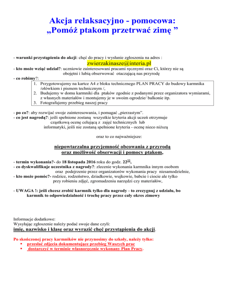 Akcja relaksacyjno - pomocowa: „Pomóż ptakom przetrwać zimę ” - warunki przystąpienia do akcji: chęć do pracy i wysłanie zgłoszenia na adres : [email protected] - kto może wziąć udział?: uczniowie zainteresowani pracami ręcznymi oraz Ci, którzy nie są obojętni i lubią obserwować otaczającą nas przyrodę - co robimy?: 1. Przygotowujemy na kartce A4 z bloku technicznego PLAN PRACY do budowy karmnika /ołówkiem i pismem technicznym /, 2. Budujemy w domu karmniki dla ptaków zgodnie z podanymi przez organizatora wymiarami, z własnych materiałów i montujemy je w swoim ogrodzie/ balkonie itp. 3. Fotografujemy przebieg naszej pracy - po co?: aby rozwijać swoje zainteresowania, i pomagać „pierzastym”. - co jest nagrodą?: jeśli spełnione zostaną wszystkie kryteria akcji uczeń otrzymuje cząstkową ocenę celującą z zajęć technicznych lub informatyki, jeśli nie zostaną spełnione kryteria - ocenę nieco niższą oraz to co najważniejsze: niepowtarzalna przyjemność obcowania z przyrodą oraz możliwość obserwacji i pomocy ptakom, - termin wykonania?- do 18 listopada 2016 roku do godz. 2222, - co dyskwalifikuje uczestnika z nagrody?: zlecenie wykonania karmnika innym osobom oraz podejrzenie przez organizatorów wykonania pracy niesamodzielnie, - kto może pomóc?- rodzice, rodzeństwo, dziadkowie, wujkowie, babcie i ciocie ale tylko przy robieniu zdjęć, zgromadzeniu narzędzi czy materiałów, - UWAGA !: jeśli chcesz zrobić karmnik tylko dla nagrody - to zrezygnuj z udziału, bo karmnik to odpowiedzialność i trochę pracy przez cały okres zimowy Informacje dodatkowe: Wysyłając zgłoszenie należy podać swoje dane czyli: imię, nazwisko i klasę oraz wyrazić chęć przystąpienia do akcji. Po skończonej pracy karmników nie przynosimy do szkoły, należy tylko: przesłać zdjęcia dokumentujące przebieg Waszych prac dostarczyć w terminie własnoręcznie wykonany Plan Pracy.