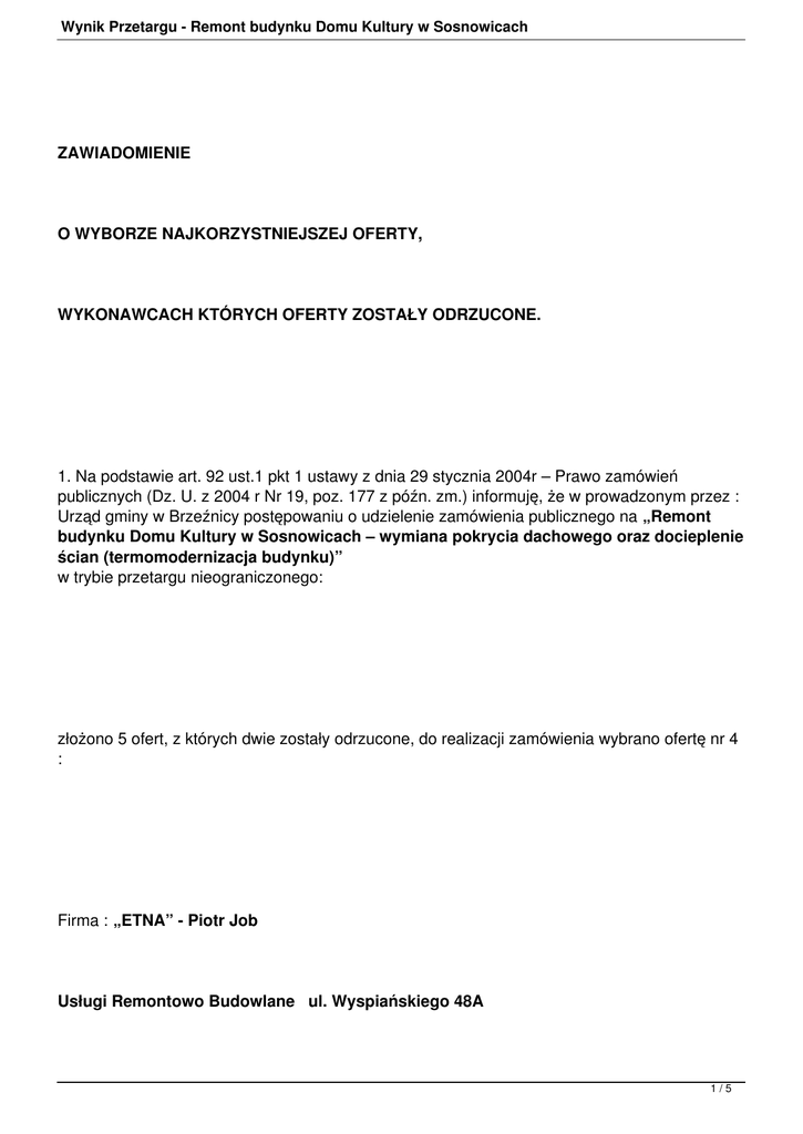 Wynik Przetargu - Remont budynku Domu Kultury w Sosnowicach ZAWIADOMIENIE O WYBORZE NAJKORZYSTNIEJSZEJ OFERTY, WYKONAWCACH KTÓRYCH OFERTY ZOSTAŁY ODRZUCONE. 1. Na podstawie art. 92 ust.1 pkt 1 ustawy z dnia 29 stycznia 2004r – Prawo zamówień publicznych (Dz. U. z 2004 r Nr 19, poz. 177 z późn. zm.) informuję, że w prowadzonym przez : Urząd gminy w Brzeźnicy postępowaniu o udzielenie zamówienia publicznego na „Remont budynku Domu Kultury w Sosnowicach – wymiana pokrycia dachowego oraz docieplenie ścian (termomodernizacja budynku)” w trybie przetargu nieograniczonego: złożono 5 ofert, z których dwie zostały odrzucone, do realizacji zamówienia wybrano ofertę nr 4 : Firma : „ETNA” - Piotr Job Usługi Remontowo Budowlane ul. Wyspiańskiego 48A 1/5 Wynik Przetargu - Remont budynku Domu Kultury w Sosnowicach 32-050 SKAWINA za cene brutto : 176.745,96 Jest to oferta spełniająca warunki SIWZ i otrzymała – 100 pkt. OFERTA NR 1 Firmy : „LIDER PLUS” s.c. Mariusz Szarawara, Anna Zawadzka oś. Kazimierzowskie 7/273, 31-839 KRAKÓW Otrzymała na podstawie kryteriów przyjętych w SIWZ – 92,77 pkt. OFERTA NR 3 Firmy : 2/5 Wynik Przetargu - Remont budynku Domu Kultury w Sosnowicach „THERMO-BUD” Tadeusz Pawela Spółka Jawna ul. Leszczyńskiej 10, 32-600 OŚWIĘCIM Otrzymała na podstawie kryteriów przyjętych w SIWZ – 88,37 pkt. 2. Na podstawie art. 92 ust. 1 pkt 2 ustawy – Prawo zamówień publicznych zawiadamiający zawiadamia, że zostały odrzucone oferty następujących wykonawców : OFERTA NR 2 Firmy : „ROGOWSKI” Usługi Remontowo Budowlane Strzelce 19, 28-220 OLEŚNICA Uzasadnienie : 3/5 Wynik Przetargu - Remont budynku Domu Kultury w Sosnowicach Przyczyną odrzucenia oferty jest fakt, iż oferta nie odpowiada treści Specyfikacji Istotnych Warunków Zamówienia. Zamawiający w SIWZ wymagał dołączenia do oferty kosztorysu ofertowego opracowanego na podstawie przedmiaru robót. Wykonawca powyższego wymogu nie dopełnił albowiem w załączonym do oferty kosztorysie ofertowym są nieprawidłowości. Wprowadzone przez oferenta zmiany powodują znaczne obniżenie jakości materiałów określonych w SIWZ i nie są rozwiązaniami równoważnymi. Uzasadnienie prawne : Oferta podlega odrzuceniu na podstawie art. 89 ust. 1 pkt. 2 ustawy z 29 stycznia. Prawo zamówień Publicznych. OFERTA NR 5 Firmy : „EURO - DOM” Usługi Remontowo Budowlane ul. Pogodna 2 , Brzezinka, 34-120 ANDRYCHÓW 4/5 Wynik Przetargu - Remont budynku Domu Kultury w Sosnowicach Uzasadnienie : Przyczyną odrzucenia oferty jest fakt, iż oferta nie odpowiada treści Specyfikacji Istotnych Warunków Zamówienia. Zamawiający w SIWZ wymagał dołączenia do oferty kosztorysu ofertowego opracowanego na podstawie przedmiaru robót. Wykonawca powyższego wymogu nie dopełnił albowiem w załączonym do oferty kosztorysie ofertowym są nieprawidłowości. Wprowadzone przez oferenta zmiany powodują znaczne obniżenie jakości materiałów określonych w SIWZ i nie są rozwiązaniami równoważnymi. Uzasadnienie prawne : Oferta podlega odrzuceniu na podstawie art. 89 ust. 1 pkt. 2 ustawy z 29 stycznia. Prawo zamówień Publicznych. 5/5