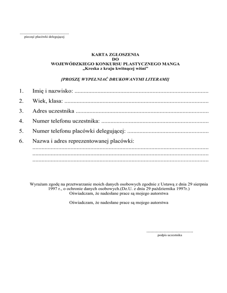 ........................................... pieczęć placówki delegującej KARTA ZGŁOSZENIA DO WOJEWÓDZKIEGO KONKURSU PLASTYCZNEGO MANGA „Kreska z kraju kwitnącej wiśni” [PROSZĘ WYPEŁNIAĆ DRUKOWANYMI LITERAMI] 1. Imię i nazwisko: ....................................................................................... 2. Wiek, klasa: .............................................................................................. 3. Adres uczestnika ....................................................................................... 4. Numer telefonu uczestnika: ...................................................................... 5. Numer telefonu placówki delegującej: ..................................................... 6. Nazwa i adres reprezentowanej placówki: ................................................................................................................... ................................................................................................................... ................................................................................................................... Wyrażam zgodę na przetwarzanie moich danych osobowych zgodnie z Ustawą z dnia 29 sierpnia 1997 r., o ochronie danych osobowych.(Dz.U. z dnia 29 października 1997r.) Oświadczam, że nadesłane prace są mojego autorstwa Oświadczam, że nadesłane prace są mojego autorstwa ................................... podpis uczestnika