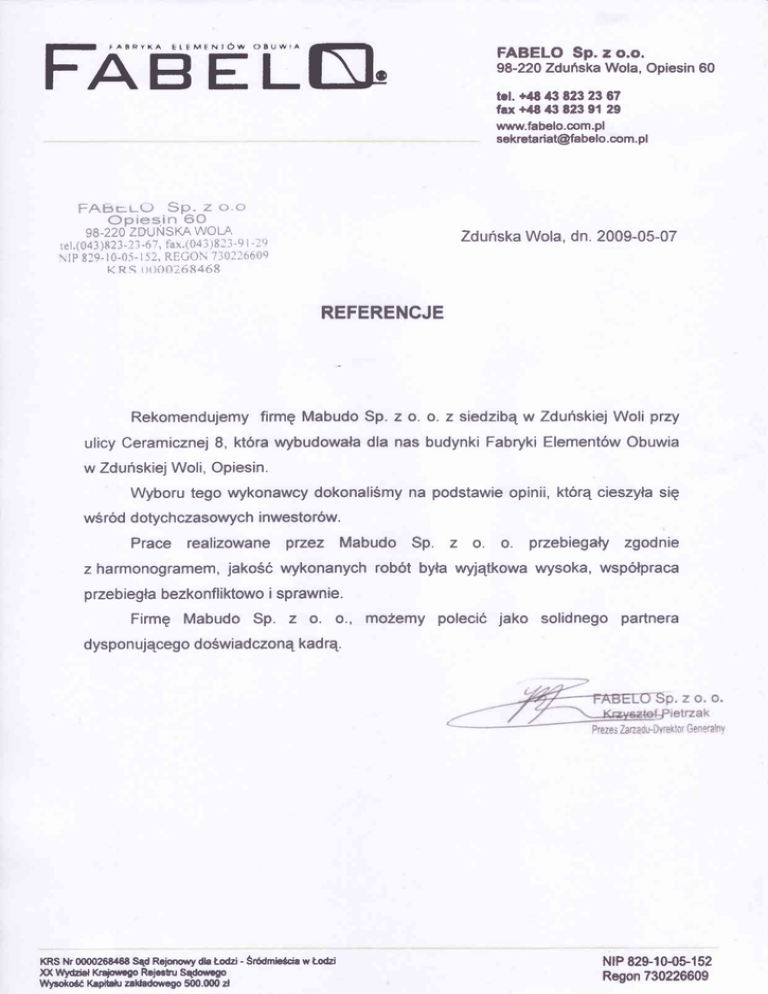 FIA'H"'E"LNt SP. z o-o FAtreuQ Opies.in 60 e8-220ZDUNSKAWOI-A, I-2e 23'67,fax.(043)82i-9 tel,(043)823I 52,RECON730226609 NtPE29-t0-05KRSo()()0268468 FABELO Sp. z o.o. 98-220ZdutlskaWola,Opiesin60 tcf. +4E13 823 23 87 far +43 '|3 E2391 29 www.fabelo.com.pl pl [email protected]. ZduriskaWola,dn. 2009-05-07 REFERENCJE RekomendujemyfirmEMabudoSp. z o. o. z siedzibqw ZduiskiejWoli przy 8, kt6rawybudowaladla nas budynkiFabrykiElement6wObuwia ulicyCeramicznej Woli,Opiesin. w Zduriskiej Wyborutego wykonawcydokonali5myna podstawieopinii,ktorq cieszylasiq inwestor6w. w6roddotychczasowych Prace realizowane przez Mabudo Sp. z o. o. przebiegatyzgodnie jako6c wykonanychrobot byta wyjqtkowawysoka,wspolpraca z harmonogramem, przebiegtabezkonfliktowo i sprawnie. Firmq Mabudo Sp. z o. o., mo2emy polecic jako solidnego partnera kadrq. dysponujqcegodo6wiadczonq S4dRejonorydb todzi- Sddmir*dawLodzi KRSNrd10026E46E nwytsil fn#wegoRejettuS$owego d l|wsofto6d K4ib|rl zakhdowego 500.000 NtP829-10-05-152 Regon730226609