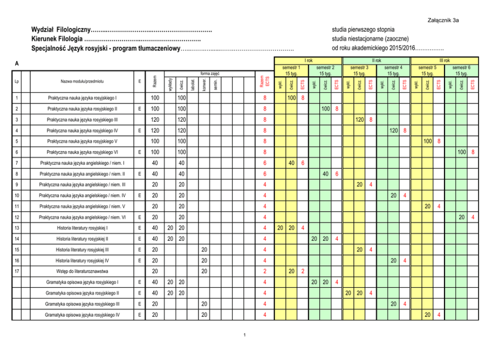 Załącznik 3a Wydział Filologiczny……...…………………..…………………………. Kierunek Filologia ………………………..…………………………. Specjalność Język rosyjski - program tłumaczeniowy…...…….…......…….…………………………. studia pierwszego stopnia studia niestacjonarne (zaoczne) od roku akademickiego 2015/2016…………….………… 12 Praktyczna nauka języka angielskiego / niem. VI 13 100 8 40 40 6 40 40 6 20 20 4 20 20 4 20 20 4 E 20 20 4 Historia literatury rosyjskiej I E 40 20 20 4 14 Historia literatury rosyjskiej II E 40 20 20 4 15 Historia literatury rosyjskiej III E 20 20 4 16 Historia literatury rosyjskiej IV E 20 20 4 17 Wstęp do literaturoznawstwa 20 20 2 E E Gramatyka opisowa języka rosyjskiego I E 40 20 20 4 Gramatyka opisowa języka rosyjskiego II E 40 20 20 4 Gramatyka opisowa języka rosyjskiego III E 20 20 4 Gramatyka opisowa języka rosyjskiego IV E 20 20 4 1 ECTS Praktyczna nauka języka angielskiego / niem. V 100 E ćwicz. 11 8 wykł. Praktyczna nauka języka angielskiego / niem. IV 100 semestr 6 15 tyg. ECTS 10 100 ćwicz. Praktyczna nauka języka angielskiego / niem. III 8 wykł. 9 120 semestr 5 15 tyg. ECTS Praktyczna nauka języka angielskiego / niem. II 120 E wykł. 8 8 III rok semestr 4 15 tyg. ECTS Praktyczna nauka języka angielskiego / niem. I 120 ćwicz. 7 120 wykł. Praktyczna nauka języka rosyjskiego VI 8 semestr 3 15 tyg. ECTS 6 100 ćwicz. Praktyczna nauka języka rosyjskiego V 100 E wykł. 5 8 II rok semestr 2 15 tyg. ECTS Praktyczna nauka języka rosyjskiego IV 100 ćwicz. 4 100 wykł. Praktyczna nauka języka rosyjskiego III Razem ECTS 3 semin. Praktyczna nauka języka rosyjskiego II konwer. 2 labolat. Praktyczna nauka języka rosyjskiego I ćwicz. 1 E wykłady Nazwa modułu/przedmiotu Razem Lp forma zajęć semestr 1 15 tyg. ćwicz. I rok A 100 8 100 8 120 8 120 8 100 8 100 8 40 6 40 6 20 4 20 4 20 4 20 20 20 4 20 20 4 20 20 4 20 4 20 4 2 20 20 4 20 20 4 20 4 4 Załącznik 3a E 20 20 2 20 20 2 18 Gramatyka opisowa języka polskiego 19 Wstęp do językoznawstwa 20 Historia Rosji E 20 21 Gramatyka konfrontatywna E 20 22 Wiedza o Rosji E 20 23 Przedmiot do wyboru 1 24 Gram. historyczna / Historia języka rosyjskiego 25 Tłumaczenie specjalistyczne I E 20 Tłumaczenie specjalistyczne II E Rosyjski język biznesu 20 3 2 20 20 2 3 20 2 2 20 2 20 3 20 3 20 20 3 E 20 20 2 Lingwistyczne podstawy przekładu I E 20 20 4 Lingwistyczne podstawy przekładu II E 20 20 6 27 Tłumaczenie konsekutywne i symultaniczne E 20 20 3 28 Przedmiot do wyboru 2 26 20 3 20 20 20 20 20 20 20 3 20 3 20 2 20 5 2 4 20 6 20 4 2 0 Przedmiot do wyboru 4 20 E 20 20 4 20 Seminaroium dyplomowe I 20 20 4 33 Seminaroium dyplomowe II 20 20 5 34 Technologia informacyjna 20 1440 120 RAZEM A: 20 1040 20 0 240 40 0 0 0 20 20 172 60 200 28 40 240 30 20 220 30 Razem Razem ECTS 2 semestr 1 15 tyg. 0 220 30 0 240 29 II rok semestr 2 15 tyg. 4 2 I rok forma zajęć 6 20 2 PRAKTYKI I ZAJĘCIA TERENOWE E/Z 4 6 32 Nazwa modułu/przedmiotu 20 20 0 Tlumaczenie pisemne Lp 3 4 Przedmiot do wyboru 3 Retoryka / Czytamy poezję B 20 0 Teoria komunikacji jęz./Lit. ros. i jej konteksty kulturowe 30 2 0 Stylistyka / Kultura języka 29 20 20 semestr 3 15 tyg. 0 200 25 III rok semestr 4 15 tyg. semestr 5 15 tyg. semestr 6 15 tyg. 0 0 0 0 0 0 0 0 0 0 0 0 0 0 0 I rok Wychowanie fizyczne 9 9 1 4 Moduł ogólnouczelniany (nauki społeczne) 20 20 69 40 29 RAZEM C: RAZEM SEMESTRY (A+B+C) 1 509 160 0 0 1 069 0 0 0 0 0 8 0 240 40 0 0 0 180 20 280 0 20 2 20 3 2 9 0 0 semestr 6 15 tyg. 1 3 0 0 semestr 5 15 tyg. 2 20 ECTS ECTS 0 semestr 4 15 tyg. ECTS 3 ćwicz. 2 wykł. 20 0 III rok semestr 3 15 tyg. ECTS 20 ćwicz. Gramatyka języka SCS / łacińskiego wykł. 2 20 semestr 2 15 tyg. ECTS 20 ćwicz. Wiedza ogólna (wybór) semin. 1 labolat. Nazwa modułu/przedmiotu ćwicz. Lp 0 II rok semestr 1 15 tyg. wykł. Razem ECTS konwer. wykłady E/Z forma zajęć 0 ECTS 0 ćwicz. 0 INNE WYMAGANIA Razem C 0 wykł. 0 RAZEM B: ECTS 0 ćwicz. 0 wykł. 3 ECTS 0 ECTS 0 ćwicz. 2 wykł. 0 E/Z ECTS 0 Nazwa modułu/przedmiotu ECTS Razem ECTS 1 Lp ECTS Razem Załącznik 3a 2 30 0 0 280 0 30 0 0 240 OGÓŁEM 0 30 0 0 220 0 30 0 9 249 1 30 40 0 240 5 30 1 509 Studia kończą się nadaniem tytułu zawodowego licencjata na kierunku Filologia …………….…………………. w specjalności Język rosyjski - program tłumaczeniowy …………….………… Plan studiów zatwierdzony przez Radę Wydziału w dniu ………....…… Otrzymują: 1. Dział Kształcenia 2. Instytut 3. Dziekanat ..................................................................... (pieczęć i podpis Dyrektora Instytutu) 3 ..................................................................... (pieczęć i podpis Dziekana)