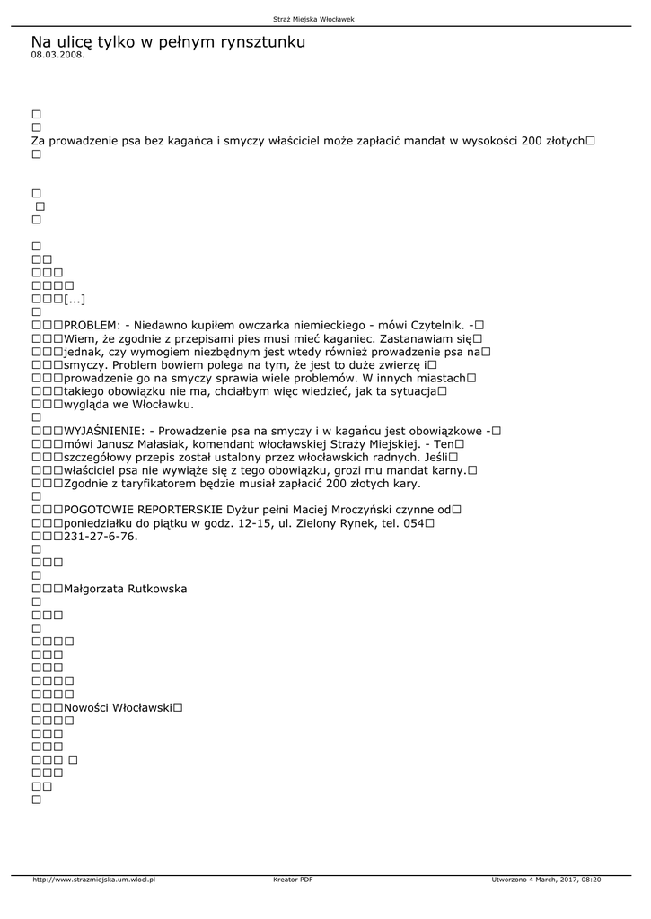Straż Miejska Włocławek Na ulicę tylko w pełnym rynsztunku 08.03.2008. Za prowadzenie psa bez kagańca i smyczy właściciel może zapłacić mandat w wysokości 200 złotych [...] PROBLEM: - Niedawno kupiłem owczarka niemieckiego - mówi Czytelnik. - Wiem, że zgodnie z przepisami pies musi mieć kaganiec. Zastanawiam się jednak, czy wymogiem niezbędnym jest wtedy również prowadzenie psa na smyczy. Problem bowiem polega na tym, że jest to duże zwierzę i prowadzenie go na smyczy sprawia wiele problemów. W innych miastach takiego obowiązku nie ma, chciałbym więc wiedzieć, jak ta sytuacja wygląda we Włocławku. WYJAŚNIENIE: - Prowadzenie psa na smyczy i w kagańcu jest obowiązkowe - mówi Janusz Małasiak, komendant włocławskiej Straży Miejskiej. - Ten szczegółowy przepis został ustalony przez włocławskich radnych. Jeśli właściciel psa nie wywiąże się z tego obowiązku, grozi mu mandat karny. Zgodnie z taryfikatorem będzie musiał zapłacić 200 złotych kary. POGOTOWIE REPORTERSKIE Dyżur pełni Maciej Mroczyński czynne od poniedziałku do piątku w godz. 12-15, ul. Zielony Rynek, tel. 054 231-27-6-76. Małgorzata Rutkowska Nowości Włocławski http://www.strazmiejska.um.wlocl.pl Kreator PDF Utworzono 4 March, 2017, 08:20
