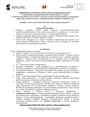 Regulamin uczestnictwa kadr sektora usług społecznych w szkoleniach/warsztatach/kursach realizowanych w ramach „Programu specjalistycznych szkoleń w zakresie rozwoju interpersonalnego i komunikacji społecznej, przygotowywania i realizacji projektów miękkich” (zadania nr 4) projektu „Uniwersytet Łódzki dla kadr sektora usług społecznych” §1 Postanowienia ogólne 1. Niniejszy regulamin określa zasady rekrutacji uczestniczek/uczestników szkoleń/warsztatów/kursów oraz zasady uczestnictwa w projekcie pt. „Uniwersytet Łódzki dla kadr sektora usług społecznych”, zwanym dalej Projektem. 2. Niniejszy regulamin opracowano zgodnie z umową o dofinansowanie projektu UDAPOKL.04.01.01-00-157/10-00 z dnia 06.12.2010r. 3. Każda osoba ubiegająca się o udział w Projekcie zobowiązana jest zapoznać się z treścią niniejszego Regulaminu i może rozpocząć udział w Projekcie po uprzednim potwierdzeniu na piśmie jego otrzymania. § 2 Definicje Użyte w Regulaminie pojęcia oznaczają: 1. Projekt – Projekt „Uniwersytet Łódzki dla kadr sektora usług społecznych” 2. Biuro Projektu/ Organizacja programu specjalistycznych szkoleń w zakresie rozwoju interpersonalnego i komunikacji społecznej, przygotowywania i realizacji projektów miękkich – Wydział Nauk o Wychowaniu UŁ, ul. Pomorska 46/48, 91-408 Łódź, budynek B, czynne w dni robocze od poniedziałku do piątku w godzinach od 14.30 do 17.30. 3. UŁ - Uniwersytet Łódzki, Projektodawca. 4. Kandydat/ Kandydatka – osoba ubiegająca się o zakwalifikowanie do udziału w Projekcie na podstawie zasad określonych w Regulaminie uczestnictwa w Projekcie. 5. Uczestnik/Uczestniczka – Kandydat/ Kandydatka, który spełnia wymogi określone w Regulaminie uczestnictwa w Projekcie i który został zakwalifikowany do udziału Projekcie. 6. PEFS – Podsystem Monitorowania Europejskiego Funduszu Społecznego. 7. Sektor usług społecznych – to sektor szeroko rozumianej edukacji, administracji publicznej, pomocy społecznej, ochrony zdrowia. 8. Usługi społeczne - działalność społecznie użyteczna nakierowana wprost na człowieka, zarówno na jego potrzeby materialne jak i duchowe. Efektem świadczenia usług społecznych nie są bezpośrednio majątkowe, fizyczne wartości użytkowe. Rezultat tak określonej działalności ma zatem charakter niematerialny i może nim być np.: wiedza, kwalifikacje zawodowe, informacja, porada. 9. Formy wsparcia, o których mowa w niniejszym Regulaminie – szkolenia/warsztaty/kursy w ramach programu specjalistycznych szkoleń w zakresie przedsiębiorczości, marketingu i zarządzania; programu specjalistycznych szkoleń w zakresie rozwoju interpersonalnego i komunikacji społecznej, przygotowywania i realizacji projektów miękkich; programu specjalistycznych kursów w zakresie zastosowań informatycznych oraz elementy praktyczne w ramach programów szkoleń/kursów. Uniwersytet Łódzki dla kadr sektora usług społecznych Projekt współfinansowany ze środków Unii Europejskiej w ramach Europejskiego Funduszu Społecznego 1. 2. 3. 4. 5. 6. 7. 1. • 2. • • • • • 3. 4. §3 Ogólne założenia Projektu Projekt „Uniwersytet Łódzki dla kadr sektora usług społecznych” realizowany jest przez Uniwersytet Łódzki (zwany dalej Projektodawcą), w ramach Programu Operacyjnego Kapitał Ludzki, Działania 4.1. Wzmocnienie i rozwój potencjału dydaktycznego uczelni oraz zwiększenie liczby absolwentów kierunków o kluczowym znaczeniu dla gospodarki opartej na wiedzy, Poddziałania 4.1.1. Wzmocnienie potencjału dydaktycznego uczelni Projekt obejmuje swym zasięgiem – całą Polskę. Okres realizacji projektu: od 01.11.2010 do 31.10.2012 r. Projekt współfinansowany jest ze środków Unii Europejskiej w ramach Europejskiego Funduszu Społecznego (EFS). Udział w szkoleniu jest nieodpłatny. Celem głównym Projektu jest rozwój pozycji Uniwersytetu Łódzkiego jako regionalnego lidera rynku kształcenia ustawicznego kadr sektora usług społecznych. Projektem zarządza Wydział Nauk o Wychowaniu Uniwersytetu Łódzkiego. §4 Warunki uczestnictwa Uczestniczką/uczestnikiem szkolenia może zostać: osoba (spoza społeczności akademickiej) zatrudniona w szeroko pojętym sektorze usług społecznych (edukacji, pomocy społecznej, administracji publicznej, ochronie zdrowia) zainteresowana pogłębianiem swojej wiedzy i podwyższaniem kwalifikacji. Zgodnie z założeniami projektu preferowane będą: a) kobiety (działania wyrównujące, wspierające równość płci, które będą służyły poprawie sytuacji kobiet na rynku pracy); b) osoby w wieku 45+; c) osoby, które brały udział/ deklarujące udział w wielu formach wsparcia oferowanych w ramach projektu (min. w jednej edycji szkoleń lub praktyk). Warunkiem uczestnictwa w projekcie po spełnieniu warunków określonych w § 4 pkt. 1 niniejszego regulaminu, jest wypełnienie i przesłanie pocztą tradycyjną lub elektroniczną (scanem podpisu) lub złożenie w biurze projektu, w wyznaczonym terminie: formularza rekrutacyjnego, kompletnie wypełnionego (opatrzonego datą i podpisanego); deklaracji uczestnictwa w projekcie; oświadczenia uczestnika projektu o wyrażeniu zgody na przetwarzanie danych osobowych; poświadczenia pracodawcy uczestnika; kserokopii dowodu osobistego. Formularz rekrutacyjny dostępny jest na stronie internetowej Projektu, Wydziału Nauk o Wychowaniu, Uniwersytetu Łódzkiego, a także w Biurze Projektu. Przyjmowane będą jedynie kompletne, poprawnie wypełnione zgłoszenia na właściwym formularzu rekrutacyjnym, opatrzone datą i własnoręcznym podpisem potencjalnej uczestniczki/uczestnika. Uniwersytet Łódzki dla kadr sektora usług społecznych Projekt współfinansowany ze środków Unii Europejskiej w ramach Europejskiego Funduszu Społecznego 5. Za moment zgłoszenia przyjmuje się chwilę, w której złożone zostały wszystkie wymagane dokumenty. 6. Decyzja o zakwalifikowan