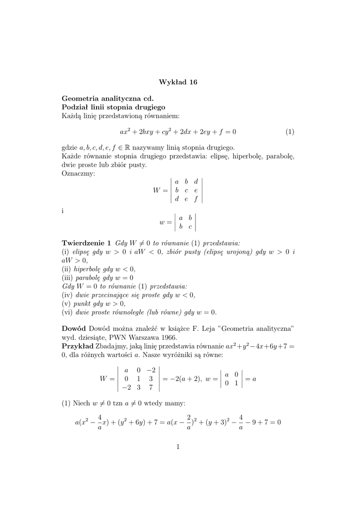 Wykład 16 Geometria analityczna cd. Podział linii stopnia drugiego Każdą linię przedstawioną równaniem: ax2 + 2bxy + cy 2 + 2dx + 2ey + f = 0 (1) gdzie a, b, c, d, e, f ∈ R nazywamy linią stopnia drugiego. Każde równanie stopnia drugiego przedstawia: elipsę, hiperbolę, parabolę, dwie proste lub zbiór pusty. Oznaczmy: a b d W = b c e d e f i a b w = b c Twierdzenie 1 Gdy W 6= 0 to równanie (1) przedstawia: (i) elipsę gdy w > 0 i aW < 0, zbiór pusty (elipsę urojoną) gdy w > 0 i aW > 0, (ii) hiperbolę gdy w < 0, (iii) parabolę gdy w = 0 Gdy W = 0 to równanie (1) przedstawia: (iv) dwie przecinające się proste gdy w < 0, (v) punkt gdy w > 0, (vi) dwie proste równoległe (lub równe) gdy w = 0. Dowód Dowód można znaleźć w książce F. Leja ”Geometria analityczna” wyd. dziesiąte, PWN Warszawa 1966. Przykład Zbadajmy, jaką linię przedstawia równanie ax2 +y 2 −4x+6y +7 = 0, dla różnych wartości a. Nasze wyróżniki są równe: a 0 −2 a 0 W = 0 1 3 = −2(a + 2), w = 0 1 −2 3 7 =a (1) Niech w 6= 0 tzn a 6= 0 wtedy mamy: 2 4 4 a(x2 − x) + (y 2 + 6y) + 7 = a(x − )2 + (y + 3)2 − − 9 + 7 = 0 a a a 1 stąd: 4 2(2 + a) 2 a(x − )2 + (y + 3)2 = + 2 = a a a Krzywe stopnia drugiego nazywamy też krzywymi stożkowymi gdyż powstają one z przecięcia stożka trójwymiarowego różnymi płaszczyznami. 2
