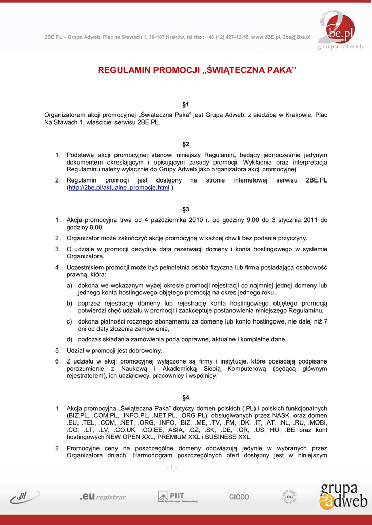 2BE.PL – Grupa Adweb, Plac na Stawach 1, 30-107 Kraków, tel./fax: +48 (12) 427-12-55, www.2BE.pl, [email protected] REGULAMIN PROMOCJI „ŚWIĄTECZNA PAKA” §1 Organizatorem akcji promocyjnej „Świąteczna Paka” jest Grupa Adweb, z siedzibą w Krakowie, Plac Na Stawach 1, właściciel serwisu 2BE.PL. §2 1. Podstawę akcji promocyjnej stanowi niniejszy Regulamin, będący jednocześnie jedynym dokumentem określającym i opisującym zasady promocji. Wykładnia oraz interpretacja Regulaminu należy wyłącznie do Grupy Adweb jako organizatora akcji promocyjnej. 2. Regulamin promocji jest dostępny (http://2be.pl/aktualne_promocje.html ). na stronie internetowej serwisu 2BE.PL §3 1. Akcja promocyjna trwa od 4 października 2010 r. od godziny 9.00 do 3 stycznia 2011 do godziny 8.00. 2. Organizator może zakończyć akcję promocyjną w każdej chwili bez podania przyczyny. 3. O udziale w promocji decyduje data rezerwacji domeny i konta hostingowego w systemie Organizatora. 4. Uczestnikiem promocji może być pełnoletnia osoba fizyczna lub firma posiadająca osobowość prawną, która: a) dokona we wskazanym wyżej okresie promocji rejestracji co najmniej jednej domeny lub jednego konta hostingowego objętego promocją na okres jednego roku, b) poprzez rejestrację domeny lub rejestrację konta hostingowego objętego promocją potwierdzi chęć udziału w promocji i zaakceptuje postanowienia niniejszego Regulaminu, c) dokona płatności rocznego abonamentu za domenę lub konto hostingowe, nie dalej niż 7 dni od daty złożenia zamówienia, d) podczas składania zamówienia poda poprawne, aktualne i kompletne dane. 5. Udział w promocji jest dobrowolny. 6. Z udziału w akcji promocyjnej wyłączone są firmy i instytucje, które posiadają podpisane porozumienie z Naukową i Akademicką Siecią Komputerową (będącą głównym rejestratorem), ich udziałowcy, pracownicy i wspólnicy. §4 1. Akcja promocyjna „Świąteczna Paka” dotyczy domen polskich (.PL) i polskich funkcjonalnych (BIZ.PL, .COM.PL, .INFO.PL, .NET.PL, .ORG.PL), obsługiwanych przez NASK, oraz domen .EU, .TEL, .COM, .NET, .ORG, .INFO, .BIZ, .ME, .TV, .FM, .DK, .IT, .AT, .NL, .RU, .MOBI, .CO, .LT, .LV, .CO.UK, .CO.EE, ASIA, .CZ, .SK, .DE, .GR, .US, HU, .BE oraz kont hostingowych NEW OPEN XXL, PREMIUM XXL i BUSINESS XXL. 2. Promocyjne ceny na poszczególne domeny obowiązują jedynie w wybranych przez Organizatora dniach. Harmonogram poszczególnych ofert dostępny jest w niniejszym -1- 2BE.PL – Grupa Adweb, Plac na Stawach 1, 30-107 Kraków, tel./fax: +48 (12) 427-12-55, www.2BE.pl, [email protected] regulaminie promocji oraz na stronie http://2be.pl/aktualne_promocje.html . internetowej Organizatora pod adresem 3. Ceny promocyjne rejestracji domeny na okres jednego roku wynoszą odpowiednio: a) 2,90 zł netto za domeny polskie i polskie funkcjonalne w okresie: od 4 października 2010 od godziny 9.00 do 18 października 2010 do godziny 8.00, od 8 listopada 2010 od godziny 9.00 do 15 listopada 2010 do godziny 8.00, od 6 grudnia 2010 od godziny 9.00 do 13 grudnia 2010 do godziny 8.00. od 27 grudnia 2010 od godziny 9.00 do 3 stycznia 2011 do godziny 8.00. b) 2,90 zł netto za domeny europejskie (.EU) w okresie: od 2 listopada 2010 od godziny 9.00 do 8 listopada 2010 do godziny 8.00, od 29 listopada 2010 od godziny 9.00 do 6 grudnia 2010 do godziny 8.00, od 13 grudnia 2010 od godziny 9.00 do 20 grudnia 2011 do godziny 8.00 c) 25 zł netto za domeny .COM w okresie: od 18 października 2010 od godziny 9.00 do 25 października 2010 do godziny 8.00, od 22 listopada 2010 od godziny 9.00 do 29 listopada 2010 do godziny 8.00, od 20 grudnia 2010 od godziny 9.00 do 27 grudnia 2011 do godziny 8.00. d) 39 zł netto za domeny .TEL w okresie: od 25 października 2010 od godziny 9.00 do 2 listopada 2010 do godziny 8.00, od 15 listopada 2010 od godziny 9.00 do 22 listopada 2010 do godziny 8.00. od 6 grudnia 2010 od godziny 9.00 do 3 stycznia 2011 do godziny 8.00 e) 39 zł netto za domeny .RU w okresie: f) od 4 października 2010 od godziny 9.00 do 3 stycznia 2011 do godziny 8.00 29 zł netto za domeny .MOBI w okresie: od 4 października 2010 od godziny 9.00 do 3 stycznia 2011 do godziny 8.00 g) 45 zł netto za domeny .IT w okresie: od 11 października 2010 od godziny 9.00 do 3 stycznia 2011 do godziny 8.00 h) 89 zł netto za domeny .TV w okresie: i) 79 zł netto za domeny .CO w okresie: j) od 18 października 2010 od godziny 9.00 do 3 stycznia 2011 do godziny 8.00 od 18 października 2010 od godziny 9.00 do 3 stycznia 2011 do godziny 8.00 29 zł netto za domeny .DE w okresie: od 25 października 2010 od godziny 9.00 do 3 stycznia 2011 do godziny 8.00 k) 49 zł netto za domeny .US w okresie: l) od 25 października 2010 od godziny 9.00 do 3 stycznia 2011 do godziny 8.00 44 zł netto za domeny .ASIA w okresie: od 2 listopada 2010 od godziny 9.00 do 3 stycznia 2011 do godziny 8.00 m) 22 zł netto za domeny .INFO w okresie: -2- 2BE.PL – Grupa Adweb, Plac na Stawach 1, 30-107 Kraków, tel./fax: +48 (12) 427-12-55, www.2BE.pl, [email protected] od 8 listopada 2010 od godziny 9.00 do 3 stycznia 2011 do godziny 8.00 n) 24 zł netto za domeny .ORG w okresie: od 8 listopada 2010 od godziny 9.00 do 3 stycznia 2011 do godziny 8.00 o) 19 zł netto za domeny .NET w okresie: od 8 listopada 2010 od godziny 9.00 do 3 stycznia 2011 do godziny 8.00 p) 24 zł netto za domeny .BIZ w okresie: od 8 listopada 2010 od godziny 9.00 do 3 stycznia 2011 do godziny 8.00 q) 39 zł netto za domeny .BE w okresie: r) od 15 listopada 2010 od godziny 9.00 do 3 stycznia 2011 do godziny 8.00 49 zł netto za domeny .HU w okresie: od 15 listopada 2010 od godziny 9.00 do 3 stycznia 2011 do godziny 8.00 s) 39 zł netto za domeny .CO.UK w okresie: t) od 22 listopada 2010 od godziny 9.00 do 3 stycznia 2011 do godziny 8.00 59 zł netto za domeny .AT w okresie: od 29 listopada 2010 od godziny 9.00 do 3 stycznia 2011 do godziny 8.00 u) 45 zł netto za domeny .NL w okresie