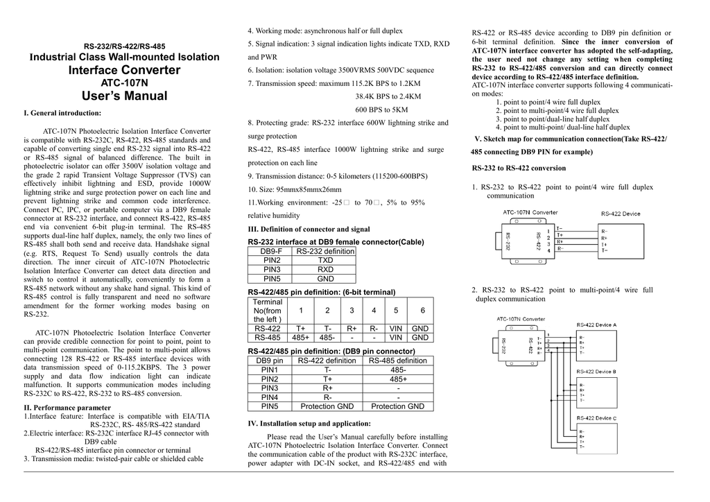 4. Working mode: asynchronous half or full duplex RS-232/RS-422/RS-485 Industrial Class Wall-mounted Isolation Interface Converter ATC-107N 5. Signal indication: 3 signal indication lights indicate TXD, RXD and PWR 6. Isolation: isolation voltage 3500VRMS 500VDC sequence 7. Transmission speed: maximum 115.2K BPS to 1.2KM User’s Manual 38.4K BPS to 2.4KM 600 BPS to 5KM I. General introduction: 8. Protecting grade: RS-232 interface 600W lightning strike and ATC-107N Photoelectric Isolation Interface Converter is compatible with RS-232C, RS-422, RS-485 standards and capable of converting single end RS-232 signal into RS-422 or RS-485 signal of balanced difference. The built in photoelectric isolator can offer 3500V isolation voltage and the grade 2 rapid Transient Voltage Suppressor (TVS) can effectively inhibit lightning and ESD, provide 1000W lightning strike and surge protection power on each line and prevent lightning strike and common code interference. Connect PC, IPC, or portable computer via a DB9 female connector at RS-232 interface, and connect RS-422, RS-485 end via convenient 6-bit plug-in terminal. The RS-485 supports dual-line half duplex, namely, the only two lines of RS-485 shall both send and receive data. Handshake signal (e.g. RTS, Request To Send) usually controls the data direction. The inner circuit of ATC-107N Photoelectric Isolation Interface Converter can detect data direction and switch to control it automatically, conveniently to form a RS-485 network without any shake hand signal. This kind of RS-485 control is fully transparent and need no software amendment for the former working modes basing on RS-232. ATC-107N Photoelectric Isolation Interface Converter can provide credible connection for point to point, point to multi-point communication. The point to multi-point allows connecting 128 RS-422 or RS-485 interface devices with data transmission speed of 0-115.2KBPS. The 3 power supply and data flow indication light can indicate malfunction. It supports communication modes including RS-232C to RS-422, RS-232 to RS-485 conversion. II. Performance parameter 1.Interface feature: Interface is compatible with EIA/TIA RS-232C, RS- 485/RS-422 standard 2.Electric interface: RS-232C interface RJ-45 connector with DB9 cable RS-422/RS-485 interface pin connector or terminal 3. Transmission media: twisted-pair cable or shielded cable surge protection RS-422 or RS-485 device according to DB9 pin definition or 6-bit terminal definition. Since the inner conversion of ATC-107N interface converter has adopted the self-adapting, the user need not change any setting when completing RS-232 to RS-422/485 conversion and can directly connect device according to RS-422/485 interface definition. ATC-107N interface converter supports following 4 communication modes: 1. point to point/4 wire full duplex 2. point to multi-point/4 wire full duplex 3. point to point/dual-line half duplex 4. point to multi-point/ dual-line half duplex V. Sketch map for communication connection(Take RS-422/ RS-422, RS-485 interface 1000W lightning strike and surge protection on each line 485 connecting DB9 PIN for example) RS-232 to RS-422 conversion 9. Transmission distance: 0-5 kilometers (115200-600BPS) 10. Size: 95mmx85mmx26mm 11.Working environment: -25 to 70 , 5% to 95% 1. RS-232 to RS-422 point to point/4 wire full duplex communication relative humidity III. Definition of connector and signal RS-232 interface at DB9 female connector(Cable) DB9-F RS-232 definition PIN2 TXD PIN3 RXD PIN5 GND RS-422/485 pin definition: (6-bit terminal) Terminal 1 2 3 4 5 No(from the left ) RS-422 T+ TR+ RVIN RS-485 485+ 485VIN 2. RS-232 to RS-422 point to multi-point/4 wire full duplex communication 6 GND GND RS-422/485 pin definition: (DB9 pin connector) DB9 pin RS-422 definition RS-485 definition PIN1 T485PIN2 T+ 485+ PIN3 R+ PIN4 RPIN5 Protection GND Protection GND IV. Installation setup and application: Please read the User’s Manual carefully before installing ATC-107N Photoelectric Isolation Interface Converter. Connect the communication cable of the product with RS-232C interface, power adapter with DC-IN socket, and RS-422/485 end with RS-232 to RS-485 conversion 1. RS-232 to RS-485 point to point /dual-line half duplex product ’s 9V power adapter for po wer suppl y or adopt VIII. power fro m other DC po wer or devic e. Th e power suppl y ATC-107N product shape and size: voltage i s +9--- +24V, curren t 200mA. It c annot co mmon ground with RS-232 interface to avoid a ffectin g the photoelectric isolation effect inside ATC-107N Photoelectric Isolation Interface Converter. 2. Surge grounding protection: Common interface converter has no large energy protector. 2. RS-232 to RS-485 point to multi- point /dual-line half duplex The transient high voltage induced in interface data line tries to release energy to the ground wire via the minimum resistance route of the device and thus can easily cause damage to interface parts. ATC-107N Photoelectric Isolation Interface Converter can provide 1000W lightning strike and surge protection power on each line. The rapid Transient Voltage Suppressor (TVS) can effectively inhibit lightning and ESD. ATC-107N interface converter DB9 pin PIN5 is designed for surge grounding protection. The user shall try to avoid hanging by credible grounding to ensure the safety of communication during operation VII. Trouble shooting 1. Data transmission failure: VI. Power and surge grounding protection 1. External power supply: The inner power supply o f ATC-107N Photoelectric Isolation Interface Converter consists of two parts. RS-232 interface po wer suppl y is obtained b y one o f TX D, D TR, RTS RS-232 signals via DC/D C. (the RS-232 int erf ac e signal level T XD, D TR, RTS s hall not be l ow er than +5 V. In cas e it is l ow er than +5 V, ATC-108N is reco mmende d) RS-422/485 end is external power suppl y. It can adopt the A. check to make sure the RS-232 interface is correctly connected