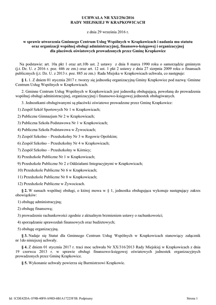 UCHWAŁA NR XXI/256/2016 RADY MIEJSKIEJ W KRAPKOWICACH z dnia 29 września 2016 r. w sprawie utworzenia Gminnego Centrum Usług Wspólnych w Krapkowicach i nadania mu statutu oraz organizacji wspólnej obsługi administracyjnej, finansowo-księgowej i organizacyjnej dla placówek oświatowych prowadzonych przez Gminę Krapkowice Na podstawie: art. 10a pkt 1 oraz art.10b ust. 2 ustawy z dnia 8 marca 1990 roku o samorządzie gminnym (j.t. Dz. U. z 2016 r. poz. 446 ze zm.) oraz art. 12 ust. 1 pkt 2 ustawy z dnia 27 sierpnia 2009 roku o finansach publicznych (j.t. Dz. U. z 2013 r. poz. 885 ze zm.) Rada Miejska w Krapkowicach uchwala, co następuje: § 1. 1. Z dniem 01 stycznia 2017 r. tworzy się jednostkę organizacyjną Gminy Krapkowice pod nazwą: Gminne Centrum Usług Wspólnych w Krapkowicach. 2. Gminne Centrum Usług Wspólnych w Krapkowicach jest jednostką obsługującą, powołaną do prowadzenia wspólnej obsługi administracyjnej, organizacyjnej i finansowo-księgowej jednostek obsługiwanych. 3. Jednostkami obsługiwanymi są placówki oświatowe prowadzone przez Gminę Krapkowice: 1) Zespół Szkół Sportowych Nr 1 w Krapkowicach; 2) Publiczne Gimnazjum Nr 2 w Krapkowicach; 3) Publiczna Szkoła Podstawowa Nr 1 w Krapkowicach; 4) Publiczna Szkoła Podstawowa w Żywocicach; 5) Zespół Szkolno – Przedszkolny Nr 3 w Rogowie Opolskim; 6) Zespół Szkolno – Przedszkolny Nr 4 w Krapkowicach; 7) Zespół Szkolno – Przedszkolny w Kórnicy; 8) Przedszkole Publiczne Nr 1 w Krapkowicach; 9) Przedszkole Publiczne Nr 2 z Oddziałami Integracyjnymi w Krapkowicach; 10) Przedszkole Publiczne Nr 6 w Krapkowicach; 11) Przedszkole Publiczne Nr 8 w Krapkowicach; 12) Przedszkole Publiczne w Żywocicach. § 2. W ramach wspólnej obsługi, o której mowa w § 1, jednostka obsługująca wykonuje następujący zakres obowiązków: 1) obsługę administracyjną; 2) obsługę finansową; 3) prowadzenie rachunkowości zgodnie z aktualnym brzmieniem ustawy o rachunkowości; 4) sporządzanie sprawozdań finansowych oraz budżetowych; 5) obsługę organizacyjną. § 3. Nadaje się Statut dla Gminnego Centrum Usług Wspólnych w Krapkowicach stanowiący załącznik nr 1do niniejszej uchwały. § 4. Z dniem 01 stycznia 2017 r. traci moc uchwała Nr XX/316/2013 Rady Miejskiej w Krapkowicach z dnia 19 czerwca 2013 r. w sprawie obsługi finansowo-księgowej oświatowych jednostek organizacyjnych prowadzonych przez Gminę Krapkowice. § 5. Wykonanie uchwały powierza się Burmistrzowi Krapkowic. Id: 1CDE42DA-1F9B-40F0-A98D-6B1A17225F5B. Podpisany Strona 1 § 6. Uchwała wchodzi w życie z dniem podjęcia i podlega ogłoszeniu na tablicach ogłoszeń oraz w Biuletynie Informacji Publicznej Urzędu Miasta i Gminy w Krapkowicach. Przewodniczący Rady Miejskiej Andrzej Małkiewicz Id: 1CDE42DA-1F9B-40F0-A98D-6B1A17225F5B. Podpisany Strona 2 Załącznik do Uchwały Nr XXI/256/2016 Rady Miejskiej w Krapkowicach z dnia 29 września 2016 r. STATUT GMINNEGO CENTRUM USŁUG WSPÓLNYCH W KRAPKOWICACH I. POSTANOWIENIA OGÓLNE § 1. 1. Gminne Centrum Usług Wspólnych w Krapkowicach, zwane dalej „Centrum", jest gminną jednostką organizacyjną działającą na zasadach jednostki budżetowej. 2. Centrum działa na podstawie powszechnie obowiązujących przepisów prawa oraz niniejszego Statutu, w szczególności: 1) ustawy z dnia 8 marca 1990 roku o samorządzie gminnym (j.t. Dz. U. z 2016 r. poz. 446 ze zm.); 2) ustawy z dnia 21 listopada 2008 roku o pracownikach samorządowych (j.t. Dz. U. z 2016 r. poz. 902); 3) ustawy z dnia 29 września 1994 r. o rachunkowości (j.t. Dz. U. z 2016 r. poz. 1047); 4) ustawy z dnia 27 sierpnia 2009 roku o finansach publicznych (j.t. Dz. U. z 2013 r. poz. 885 ze zm.); 5) ustawy z dnia 7 września 1991 roku o systemie oświaty (j.t. Dz. U. z 2015 r. poz.2156 ze zm.); 6) ustawy z dnia 26 stycznia 1982 r. - Karta Nauczyciela (j.t. Dz. U. 2016 r. poz. 1379). § 2. Siedzibą Centrum jest miasto Krapkowice. II. CELE I ZAKRES DZIAŁANIA § 3. 1. Centrum pełni funkcję jednostki obsługującej placówki oświatowe, zwane dalej jednostkami obsługiwanymi, dla których organem prowadzącym jest Gmina Krapkowice. 2. Wykaz jednostek obsługiwanych: 1) Zespół Szkół Sportowych Nr 1 w Krapkowicach; 2) Publiczne Gimnazjum Nr 2 w Krapkowicach; 3) Publiczna Szkoła Podstawowa Nr 1 w Krapkowicach; 4) Publiczna Szkoła Podstawowa w Żywocicach; 5) Zespół Szkolno – Przedszkolny Nr 3 w Rogowie Opolskim; 6) Zespół Szkolno – Przedszkolny Nr 4 w Krapkowicach; 7) Zespół Szkolno – Przedszkolny w Kórnicy; 8) Przedszkole Publiczne Nr 1 w Krapkowicach; 9) Przedszkole Publiczne Nr 2 z Oddziałami Integracyjnymi w Krapkowicach; 10) Przedszkole Publiczne Nr 6 w Krapkowicach; 11) Przedszkole Publiczne Nr 8 w Krapkowicach; 12) Przedszkole Publiczne w Żywocicach. § 4. Do zadań Centrum należy kompleksowa obsługa administracyjno-organizacyjna, finansowa i rachunkowa: 1) prowadzenie gospodarki finansowej z obowiązującymi przepisami prawa; Centrum oraz jednostek obsługiwanych (placówek) zgodnie 2) prowadzenie ksiąg rachunkowych zgodnie z obowiązującymi przepisami prawa; Id: 1CDE42DA-1F9B-40F0-A98D-6B1A17225F5B. Podpisany Strona 1 3) prowadzenie ewidencji majątkowej w oparciu o dokumenty i dyspozycje dyrektorów placówek oświatowych, w tym dokumentację inwentaryzacyjną; 4) sporządzanie sprawozdań finansowych i budżetowych placówek; 5) doradztwo planowania finansowego, a w szczególności przygotowanie niezbędnych danych do sporządzenia wniosku budżetowego projektu planu finansowego placówek zgodnie z wymogami prawa finansowego; 6) określenie zasad polityki rachunkowości placówek; 7) prowadzenie obsługi kasowej i bankowej placówek; 8) obsługa wypłat wynagrodzeń i innych świadczeń pieniężnych dla pracowników placówek, w tym: przygotowanie list płatniczych, organizowanie wypłaty wynagrodzeń i wystawianie zaświadczeń; 9) analiza poniesionych wydatków na wynagrodzenia 