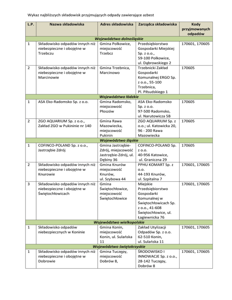 Wykaz najbliższych składowisk przyjmujących odpady zawierające azbest L.P. 1 2 1 2 1 2 3 1 1 Nazwa składowiska Adres składowiska Zarządca składowiska Województwo dolnośląskie Składowisko odpadów innych niż Gmina Polkowice, Przedsiębiorstwo niebezpieczne i obojętne w miejscowość Gospodarki Miejskiej Trzebczu Trzebcz Sp. z o.o., 59-100 Polkowice, ul. Dąbrowskiego 2 Składowisko odpadów innych niż Gmina Trzebnica, Trzebnicki Zakład niebezpieczne i obojętne w Marcinowo Gospodarki Marcinowie Komunalnej ERGO Sp. z o.o., 55-100 Trzebnica, Pl. Piłsudskiego 1 Województwo łódzkie ASA Eko-Radomsko Sp. z o.o. Gmina Radomsko, ASA Eko-Radomsko miejscowość Sp. z o.o. Płoszów 97-500 Radomsko, ul. Narutowicza 5B ZGO AQUARIUM Sp. z o.o., Gmina Rawa ZGO AQUARIUM Sp. z Zakład ZGO w Pukininie nr 140 Mazowiecka, o.o.; ul. Katowicka 20, miejscowość 96 - 200 Rawa Pukinin Mazowiecka Województwo śląskie COFINCO-POLAND Sp. z o.o., Gmina JastrzębieCOFINCO-POLAND Sp. Jastrzębie Zdrój Zdrój, miejscowość z o.o. Jastrzębie-Zdrój, ul. 40-956 Katowice, Dębiny 36 ul. Graniczna 29 Składowisko odpadów innych niż Gmina Knurów PPHU KOMART Sp. z niebezpieczne i obojętne w miejscowość o.o. Knurowie Knurów, 44-193 Knurów, ul. Szybowa 44 ul. Szpitalna 7 Składowisko odpadów innych niż Gmina Miejskie niebezpieczne i obojętne w Świętochłowice, Przedsiębiorstwo Świętochłowicach miejscowość Gospodarki Świętochłowice Komunalnej w Świętochłowicach Sp. z o.o., 41-608 Świętochłowice, ul. Łagiewnicka 76 Województwo wielkopolskie Składowisko odpadów Gmina Konin, Zakład Utylizacji niebezpiecznych w Koninie miejscowość Odpadów Sp. z o.o. Konin, ul. Sulańska 62-510 Konin, 11 ul. Sulańska 11 Województwo świętokrzyskie Składowisko odpadów innych niż Gmina Tuczępy, ŚRODOWISKO I niebezpieczne i obojętne w miejscowość INNOWACJE Sp. z o.o., Dobrowie Dobrów 8, 28-142 Tuczępy, Dobrów 8 Kody przyjmowanych odpadów 170601, 170605 170605 170605 170605 170605 170601, 170605 170601, 170605 170601, 170605 170601, 170605