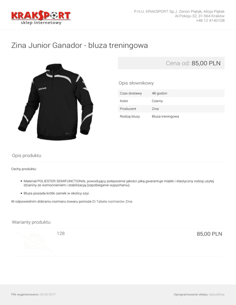 P.H.U. KRAKSPORT Sp.J. Zenon Piętak, Alicja Piętak Al.Pokoju 32, 31-564 Kraków +48 12 4140108 Zina Junior Ganador - bluza treningowa Cena od: 85,00 PLN Opis słownikowy Czas dostawy 48 godzin Kolor Czarny Producent Zina Rodzaj bluzy Bluza treningowa Opis produktu Cechy produktu: Materiał POLIESTER SEMIFUNCTIONAL powodujący polepszenie jakości jaką gwarantuje miękki i elastyczny rodzaj użytej dzianiny ze wzmocnieniem i stabilizacją (zapobieganie wypychaniu). Bluza posiada krótki zamek w okolicy szyi. W odpowiednim dobraniu rozmiaru towaru pomoże Ci Tabela rozmiarów Zina Warianty produktu 128 Plik wygenerowano: 04-03-2017 85,00 PLN Oprogramowanie sklepu: AptusShop P.H.U. KRAKSPORT Sp.J. Zenon Piętak, Alicja Piętak Al.Pokoju 32, 31-564 Kraków +48 12 4140108 XXS Plik wygenerowano: 04-03-2017 Powered by TCPDF (www.tcpdf.org) 85,00 PLN Oprogramowanie sklepu: AptusShop
