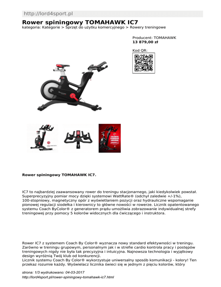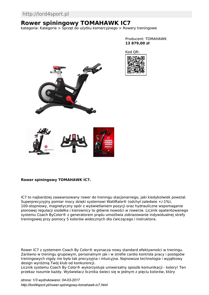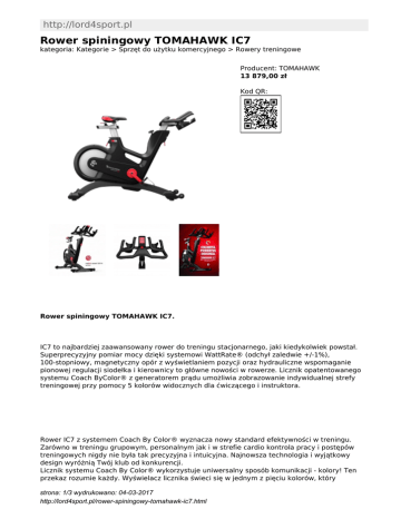 http://lord4sport.pl Rower spiningowy TOMAHAWK IC7 kategoria: Kategorie > Sprzęt do użytku komercyjnego > Rowery treningowe Producent: TOMAHAWK 13 879,00 zł Kod QR: Rower spiningowy TOMAHAWK IC7. IC7 to najbardziej zaawansowany rower do treningu stacjonarnego, jaki kiedykolwiek powstał. Superprecyzyjny pomiar mocy dzięki systemowi WattRate® (odchył zaledwie +/-1%), 100-stopniowy, magnetyczny opór z wyświetlaniem pozycji oraz hydrauliczne wspomaganie pionowej regulacji siodełka i kierownicy to główne nowości w rowerze. Licznik opatentowanego systemu Coach ByColor® z generatorem prądu umożliwia zobrazowanie indywidualnej strefy treningowej przy pomocy 5 kolorów widocznych dla ćwiczącego i instruktora. Rower IC7 z systemem Coach By Color® wyznacza nowy standard efektywności w treningu. Zarówno w treningu grupowym, personalnym jak i w strefie cardio kontrola pracy i postępów treningowych nigdy nie była tak precyzyjna i intuicyjna. Najnowsza technologia i wyjątkowy design wyróżnią Twój klub od konkurencji. Licznik systemu Coach By Color® wykorzystuje uniwersalny sposób komunikacji - kolory! Ten przekaz rozumie każdy. Wyświelacz licznika świeci się w jednym z pięciu kolorów, który strona: 1/3 wydrukowano: 04-03-2017 http://lord4sport.pl/rower-spiningowy-tomahawk-ic7.html odpowiada strefie treningowej ćwiczącego, wyliczonej na podstawie mocy lub tętna. Dzięki temu wiadomo, kiedy zwiększyć lub zmniejszyć intensywność treningu. Dodatkowo dzięki wyświetlaczowi LED na każdym liczniku, instruktor może kontrolować intensywność treningu ćwiczącego.Czujnik WattRate® w rowerze IC7 umożliwia użytkownikowi uzyskanie precyzyjnej i bezpośredniej informacji o mocy oraz pozwala mierzyć intensywność, by efektywniej realizować cele treningowe. Zaawansowana ergometria roweru, jego biomechaniczna wydajność, optymalne możliwości ustawień - każdy detal wpływa na komfort jazdy. Trening nie jest przez to lżejszy, ale na pewno sprawia więcej przyjemności. Opis: Pomiar mocy - WattRate® Licznik Coach By Color® Opór magnetyczny z 300-stopniowym zakresem obrotu Zintegrowany generator prądu Podwójny system napędowy Wspomagana regulacja wysokości sztyc Zabudowana rama Dokładna regulacja ustawień Wygodne uchwyty regulacji Ergonomiczna kierownica Współczynnik Q 155 mm Pedały dwufunkcyjne Szerokie stabilizatory Osłony stabilizatorów Dolna rama w kształcie łuku Specyfikacja: Licznik: Coach By Color® Zasilanie licznika: Zintegrowany generator Opór: magnetyczny Hamulec: dociskowy Koło zamachowe: z tyłu, aluminiowe, równomiernie rozłożona masa Rodzaj napędu: Podwójny - pas ząbkowy i klinowy Stosunek przełożenia: 1:11 Kolor ramy: czarny matowy Materiał ramy: stal Sztyce: aluminiowe, wspomaganie pionowe, bezstopniowa regulacja Współczynnik Q: 155 mm Korby: CrMo 172,5 mm Pedały: dwufunkcyjne Kierownica: ergonomiczna, z miękkiego PVC Regulacja kierownicy: pionowa i pozioma Siodełko: sportowe siodełko unisex Regulacja siodełka: pionowa i pozioma Uchwyt na bidon: podwójny, zintegrowany Płytki ochronne: tworzywo sztuczne, z zaślepkami do rozciągania łydki Max. waga użytkownika: 150 kg Waga: 54 kg Wymiary: 132 x 52 x 102 cm Dodatkowe informacje: Towar na zamówienie przed zakupem prosimy o kontakt strona: 2/3 wydrukowano: 04-03-2017 http://lord4sport.pl/rower-spiningowy-tomahawk-ic7.html Gwarancja 3 lata Nie znalazłeś produktu który Cię interesuje ? Skontaktuj się z nami tel. 32-270-77-22 - postaramy się rozwiązać ten problem strona: 3/3 wydrukowano: 04-03-2017 http://lord4sport.pl/rower-spiningowy-tomahawk-ic7.html