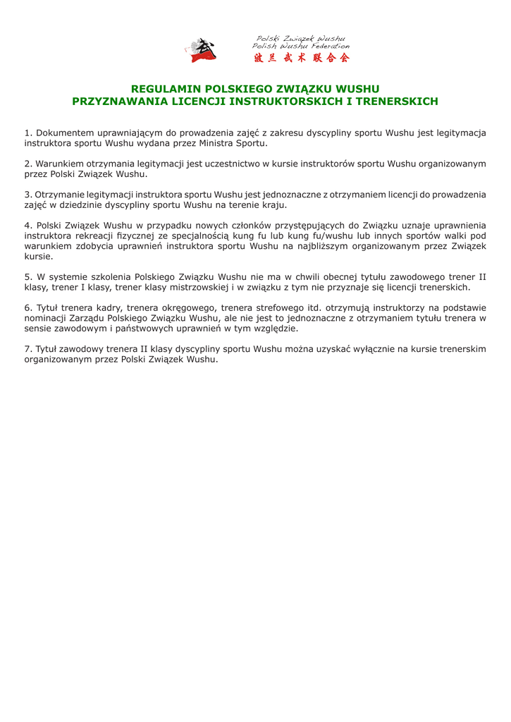 REGULAMIN POLSKIEGO ZWIĄZKU WUSHU PRZYZNAWANIA LICENCJI INSTRUKTORSKICH I TRENERSKICH 1. Dokumentem uprawniającym do prowadzenia zajęć z zakresu dyscypliny sportu Wushu jest legitymacja instruktora sportu Wushu wydana przez Ministra Sportu. 2. Warunkiem otrzymania legitymacji jest uczestnictwo w kursie instruktorów sportu Wushu organizowanym przez Polski Związek Wushu. 3. Otrzymanie legitymacji instruktora sportu Wushu jest jednoznaczne z otrzymaniem licencji do prowadzenia zajęć w dziedzinie dyscypliny sportu Wushu na terenie kraju. 4. Polski Związek Wushu w przypadku nowych członków przystępujących do Związku uznaje uprawnienia instruktora rekreacji fizycznej ze specjalnością kung fu lub kung fu/wushu lub innych sportów walki pod warunkiem zdobycia uprawnień instruktora sportu Wushu na najbliższym organizowanym przez Związek kursie. 5. W systemie szkolenia Polskiego Związku Wushu nie ma w chwili obecnej tytułu zawodowego trener II klasy, trener I klasy, trener klasy mistrzowskiej i w związku z tym nie przyznaje się licencji trenerskich. 6. Tytuł trenera kadry, trenera okręgowego, trenera strefowego itd. otrzymują instruktorzy na podstawie nominacji Zarządu Polskiego Związku Wushu, ale nie jest to jednoznaczne z otrzymaniem tytułu trenera w sensie zawodowym i państwowych uprawnień w tym względzie. 7. Tytuł zawodowy trenera II klasy dyscypliny sportu Wushu można uzyskać wyłącznie na kursie trenerskim organizowanym przez Polski Związek Wushu.