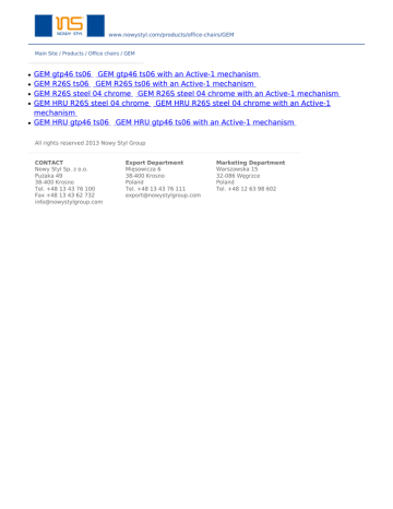 www.nowystyl.com/products/office-chairs/GEM Main Site / Products / Office chairs / GEM ● ● ● ● ● GEM gtp46 ts06 GEM gtp46 ts06 with an Active-1 mechanism GEM R26S ts06 GEM R26S ts06 with an Active-1 mechanism GEM R26S steel 04 chrome GEM R26S steel 04 chrome with an Active-1 mechanism GEM HRU R26S steel 04 chrome GEM HRU R26S steel 04 chrome with an Active-1 mechanism GEM HRU gtp46 ts06 GEM HRU gtp46 ts06 with an Active-1 mechanism All rights reserved 2013 Nowy Styl Group CONTACT Nowy Styl Sp. z o.o. Pużaka 49 38-400 Krosno Tel. +48 13 43 76 100 Fax +48 13 43 62 732 [email protected] Export Department Mięsowicza 6 38-400 Krosno Poland Tel. +48 13 43 76 111 [email protected] Marketing Department Warszawska 15 32-086 Węgrzce Poland Tel. +48 12 63 98 602