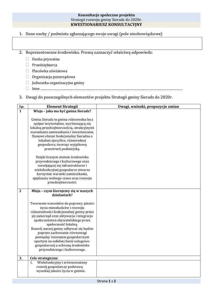 Konsultacje społeczne projektu Strategii rozwoju gminy Sieradz do 2020r. KWESTIONARIUSZ KONSULTACYJNY 1. Dane osoby / podmiotu zgłaszającego swoje uwagi (pole nieobowiązkowe) 2. Reprezentowane środowisko. Proszę zaznaczyć właściwą odpowiedz: Osoba prywatna Przedsiębiorca Placówka oświatowa Organizacja pozarządowa Jednostka organizacyjna gminy Inne …………………………………………………………………………………………………………………… 3. Uwagi do poszczególnych elementów projektu Strategii gminy Sieradz do 2020r. Lp. 1 Element Strategii Uwagi, wnioski, propozycje zmian Wizja – jaka ma być gmina Sieradz? Gmina Sieradz to gmina różnorodna lecz spójne terytorialnie, wyróżniającą się lokalną przedsiębiorczością, atrakcyjnymi warunkami zamieszkania i inwestowania. Stanowi obszar funkcjonalny Sieradza o lokalnej specyfice, różnorodnej gospodarce, tworząc wyjątkową przestrzeń podmiejską. Dzięki licznym atutom środowiska przyrodniczego i kulturowego oraz rozwijającej się infrastrukturze i wielofunkcyjnej gospodarce stwarza korzystne warunki zamieszkania, spędzania wolnego czasu oraz rozwoju przedsiębiorczości. 2 Misja – czym kierujemy się w naszych działaniach? Tworzenie warunków do poprawy jakości życia mieszkańców i rozwoju różnorodności funkcjonalnej gminy przez jej samorząd oraz aktywacja i integracja społeczeństwa obywatelskiego przez społeczność lokalną. Rozwój naszej gminy odbywać się będzie poprzez zachowanie równowagi pomiędzy rozwojem gospodarczym opartym na solidnej bazie usługowogospodarczej a ochroną środowiska przyrodniczego i kulturowego. 3. Cele strategiczne 1. Wielofunkcyjny i zrównoważony rozwój gospodarczy podstawą wysokiej jakości życia w gminie. Strona 1 z 2 Konsultacje społeczne projektu Strategii rozwoju gminy Sieradz do 2020r. 2. Uporządkowana struktura funkcjonalno – przestrzenna. 3. 4 Wzrost dostępności komunikacyjnej oraz rozwój techniczny infrastruktury sieciowej. 4. Społeczność obywatelska i wzrastająca jakość życia mieszkańców. Cele operacyjne DLA I-szego OBSZARU STRATEGICZNEGO - GOSPODARKA 1.1. Kreowanie środowiska sprzyjającego rozwojowi lokalnej przedsiębiorczości. 1.2. Tworzenie warunków sprzyjających inwestowaniu oraz inicjowanie działań w zakresie inwestycji strategicznych. 1.3. Rozwój sektora rolnego w kierunku wielofunkcyjnego rozwoju obszarów wiejskich – rozwój nowoczesnego rolnictwa i pozarolniczego rozwoju wsi. 1.4. Gospodarcze wykorzystanie potencjału przyrodniczego i kulturowego oraz rozwój przemysłów czasu wolnego. DLA II-go OBSZARU STRATEGICZNEGO – PRZESTRZEŃ, INFRASTRUKTURA I ŚRODOWISKO 2.1. Przejrzysta gospodarka gruntami, standard ładu przestrzennego i estetyka przestrzeni. 2.2. Czyste i zadbane środowisko naturalne gminy. 3.1. Rozwój infrastruktury drogowej. 3.2. Rozwój infrastruktury komunalnej. 3.3. Rozwój sieci teleinformatycznej – przeciwdziałanie wykluczeniu cyfrowemu. DLA III-ciego OBSZARU STRATEGICZNEGO – SPOŁECZEŃSTWO I JAKOŚĆ ŻYCIA 4.1. Wspieranie aktywności społecznej i kapitału ludzkiego. 4.2. Rozwój oferty kultury czasu wolnego. 4.3. Rozwój działań w zakresie zapewnienia bezpieczeństwa i porządku publicznego. Strona 2 z 2