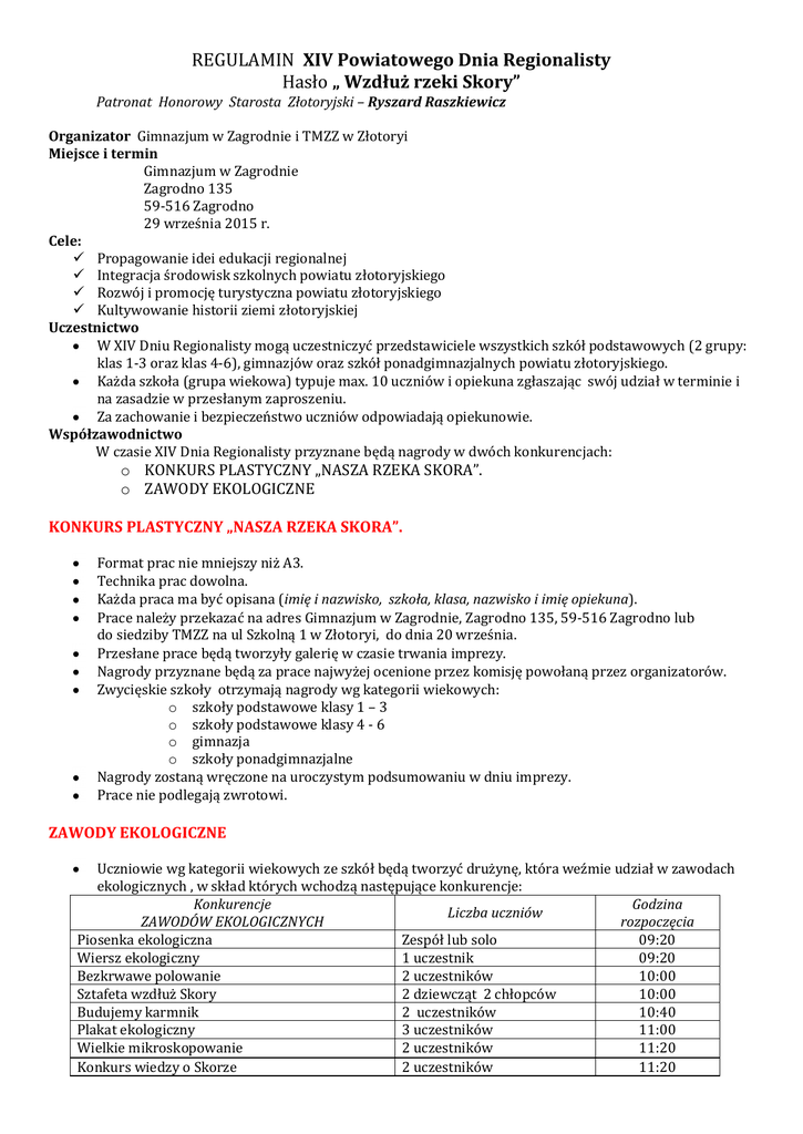 REGULAMIN XIV Powiatowego Dnia Regionalisty Hasło „ Wzdłuż rzeki Skory” Patronat Honorowy Starosta Złotoryjski – Ryszard Raszkiewicz Organizator Gimnazjum w Zagrodnie i TMZZ w Złotoryi Miejsce i termin Gimnazjum w Zagrodnie Zagrodno 135 59-516 Zagrodno 29 września 2015 r. Cele: Propagowanie idei edukacji regionalnej Integracja środowisk szkolnych powiatu złotoryjskiego Rozwój i promocję turystyczna powiatu złotoryjskiego Kultywowanie historii ziemi złotoryjskiej Uczestnictwo W XIV Dniu Regionalisty mogą uczestniczyć przedstawiciele wszystkich szkół podstawowych (2 grupy: klas 1-3 oraz klas 4-6), gimnazjów oraz szkół ponadgimnazjalnych powiatu złotoryjskiego. Każda szkoła (grupa wiekowa) typuje max. 10 uczniów i opiekuna zgłaszając swój udział w terminie i na zasadzie w przesłanym zaproszeniu. Za zachowanie i bezpieczeństwo uczniów odpowiadają opiekunowie. Współzawodnictwo W czasie XIV Dnia Regionalisty przyznane będą nagrody w dwóch konkurencjach: o KONKURS PLASTYCZNY „NASZA RZEKA SKORA”. o ZAWODY EKOLOGICZNE KONKURS PLASTYCZNY „NASZA RZEKA SKORA”. Format prac nie mniejszy niż A3. Technika prac dowolna. Każda praca ma być opisana (imię i nazwisko, szkoła, klasa, nazwisko i imię opiekuna). Prace należy przekazać na adres Gimnazjum w Zagrodnie, Zagrodno 135, 59-516 Zagrodno lub do siedziby TMZZ na ul Szkolną 1 w Złotoryi, do dnia 20 września. Przesłane prace będą tworzyły galerię w czasie trwania imprezy. Nagrody przyznane będą za prace najwyżej ocenione przez komisję powołaną przez organizatorów. Zwycięskie szkoły otrzymają nagrody wg kategorii wiekowych: o szkoły podstawowe klasy 1 – 3 o szkoły podstawowe klasy 4 - 6 o gimnazja o szkoły ponadgimnazjalne Nagrody zostaną wręczone na uroczystym podsumowaniu w dniu imprezy. Prace nie podlegają zwrotowi. ZAWODY EKOLOGICZNE Uczniowie wg kategorii wiekowych ze szkół będą tworzyć drużynę, która weźmie udział w zawodach ekologicznych , w skład których wchodzą następujące konkurencje: Konkurencje Godzina Liczba uczniów ZAWODÓW EKOLOGICZNYCH rozpoczęcia Piosenka ekologiczna Zespół lub solo 09:20 Wiersz ekologiczny 1 uczestnik 09:20 Bezkrwawe polowanie 2 uczestników 10:00 Sztafeta wzdłuż Skory 2 dziewcząt 2 chłopców 10:00 Budujemy karmnik 2 uczestników 10:40 Plakat ekologiczny 3 uczestników 11:00 Wielkie mikroskopowanie 2 uczestników 11:20 Konkurs wiedzy o Skorze 2 uczestników 11:20 Komisje o Komisja do każdej konkurencji składać się będzie z 3 osób. o W skład komisji będą wchodzili nauczyciele prowadzący konkurencję, organizatorzy imprezy i opiekunowie goszczących szkól . Punktacja o Każda drużyna otrzymuje punkty za udział w poszczególnych konkurencjach. o Ostatnie miejsce to 1 punkt. o Każde wyższe miejsce to 1 punkt więcej od poprzedniego. o Brak udziału w danej konkurencji to 0 punktów. o Maksymalna liczba punktów w konkurencji jest zależna od ilości zgłoszonych szkół. Każdy uczestnik może wystąpić w dowolnej liczbie konkursów. Drużyna otrzymuje punkty w każdej konkurencji. Suma punktów ze wszystkich konkurencji decyduje o zajętym przez szkołę miejscu w ZAWODACH EKOLOGICZNYCH. Nagrody Zwycięskie szkoły otrzyma ją nagrody wg kategorii wiekowych: o szkoły podstawowe klasy I – III o szkoły podstawowe klasy IV - VI o gimnazja o szkoły ponadgimnazjalne Nagrody zostaną wręczone na uroczystym podsumowaniu w dniu imprezy. Szczegółowe zasady udziału w konkurencjach ZAWODÓW EKOLOGICZNYCH Piosenka ekologiczna W konkurencji mogą uczestniczyć soliści, duety lub zespoły. Każda placówka (kategorie wiekowe) może zaprezentować 1 utwór. Czas trwania utworu – max.10 minut. Wykonywany utwór ma dotyczyć tematyki ekologicznej. Podkładem muzycznym może być : o nagranie instrumentalne na płycie CD lub Pendriv’a o akompaniament Nagrania podkładu należy opatrzyć imieniem i nazwiskiem (bądź nazwą zespołu) oraz tytułem utworu. Kryteria oceny: o dobór tematyczny repertuaru o interpretację, walory głosowe o ogólny wyraz artystyczny Bliższych informacji udziela: Iwona Musiał, Tel. (76 8773- 376) Wiersz ekologiczny Uczestnicy konkursu prezentują utwór o tematyce ekologicznej - recytacja jednego utworu poetyckiego. Kryteria oceny: o dobór repertuaru (wartości artystyczne utworów, ich dobór do możliwości wykonawczych uczestnika), o interpretację utworu (zaskakująca, oryginalna, konsekwentna), o kultura słowa (dykcja oraz emisja głosu), o ogólny wyraz artystyczny. Bliższych informacji udziela: Barbara Wolska, Tel. (76 8773- 376) Bezkrwawe polowanie Bezkrwawe polowanie to forma konkursu fotograficznego o charakterze przyrodniczym. Każdą szkołę (kategoria wiekowa)reprezentuje 1 uczeń. Pracą konkursową jest zdjęcie wykonane w dowolnej technice swoim aparatem fotograficznym lub telefonem komórkowym posiadającym kartę microSD. Przedmiotem fotografii powinny być przedstawienie różnych gatunków zwierząt i roślin żyjących w nabrzeżu rzeki Skory. W ciągu 30 minut uczestnicy wykonują dowolną liczbę zdjęć, spośród których tylko jedna wybrana przez autora fotografia będzie podlegała ocenie. Oceniana będzie technika wykonania zdjęcia oraz sposób przedstawienia przynajmniej jednego wybranego gatunku zwierząt i/lub roślin żyjących w nabrzeżu rzeki Skory. Bliższych informacji udziela: Magdalena Pluto, Tel. (76 8773- 376) Sztafeta wzdłuż Skory MIEJSCE i DYSTANS : o Gimnazja i szkoły ponadgimnazjalne: dystans biegu wynosi 600 metrów, odbędzie się wzdłuż rzeki Skory. o Szkoły podstawowe: biegi z przeszkodami przeprowadzone na boisku Orlik. o Pozostałe informacje zostaną na przekazane przed rozpoczęciem zawodów. WARUNKI UCZESTNICTWA: o Każda szkoła (kategorie wiekowe)wystawia drużynę 4-osobową, składająca się z 2 chłopców i 2 dziewcząt. o Uczestnicy zobowiązani są dostarczyć organizatorowi pisemną zgodę rodzica lub prawn