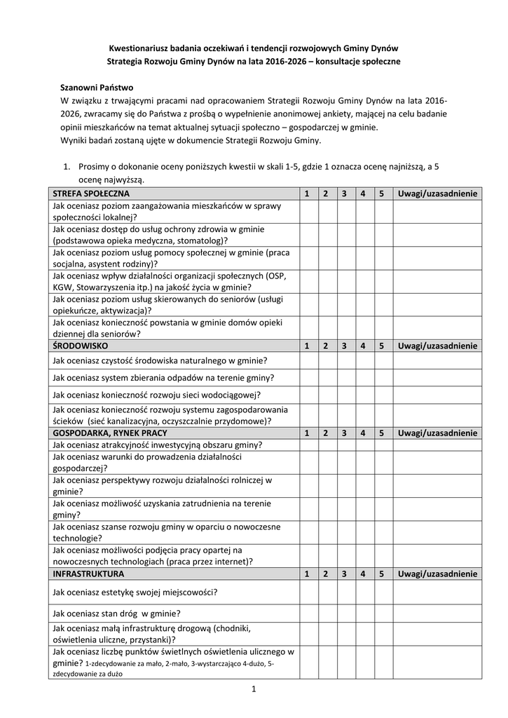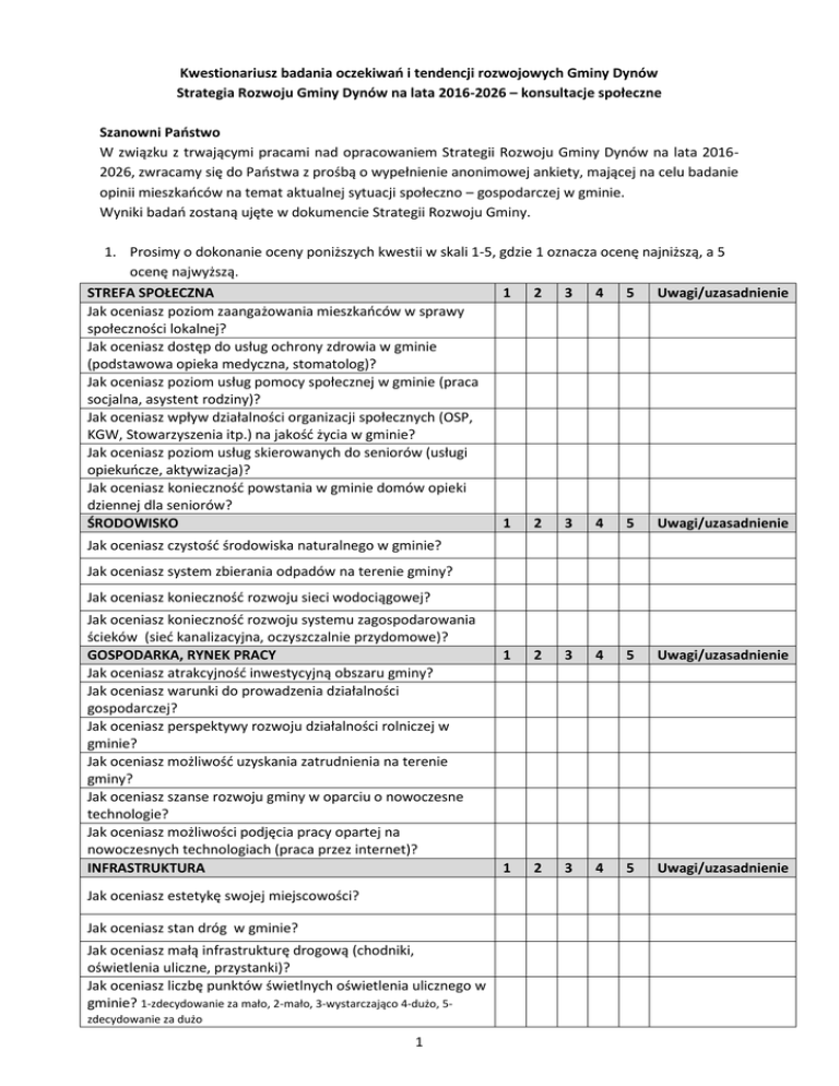 Kwestionariusz badania oczekiwań i tendencji rozwojowych Gminy Dynów Strategia Rozwoju Gminy Dynów na lata 2016-2026 – konsultacje społeczne Szanowni Państwo W związku z trwającymi pracami nad opracowaniem Strategii Rozwoju Gminy Dynów na lata 20162026, zwracamy się do Państwa z prośbą o wypełnienie anonimowej ankiety, mającej na celu badanie opinii mieszkańców na temat aktualnej sytuacji społeczno – gospodarczej w gminie. Wyniki badań zostaną ujęte w dokumencie Strategii Rozwoju Gminy. 1. Prosimy o dokonanie oceny poniższych kwestii w skali 1-5, gdzie 1 oznacza ocenę najniższą, a 5 ocenę najwyższą. STREFA SPOŁECZNA 1 2 3 4 5 Uwagi/uzasadnienie Jak oceniasz poziom zaangażowania mieszkańców w sprawy społeczności lokalnej? Jak oceniasz dostęp do usług ochrony zdrowia w gminie (podstawowa opieka medyczna, stomatolog)? Jak oceniasz poziom usług pomocy społecznej w gminie (praca socjalna, asystent rodziny)? Jak oceniasz wpływ działalności organizacji społecznych (OSP, KGW, Stowarzyszenia itp.) na jakość życia w gminie? Jak oceniasz poziom usług skierowanych do seniorów (usługi opiekuńcze, aktywizacja)? Jak oceniasz konieczność powstania w gminie domów opieki dziennej dla seniorów? ŚRODOWISKO 1 2 3 4 5 Uwagi/uzasadnienie Jak oceniasz czystość środowiska naturalnego w gminie? Jak oceniasz system zbierania odpadów na terenie gminy? Jak oceniasz konieczność rozwoju sieci wodociągowej? Jak oceniasz konieczność rozwoju systemu zagospodarowania ścieków (sieć kanalizacyjna, oczyszczalnie przydomowe)? GOSPODARKA, RYNEK PRACY Jak oceniasz atrakcyjność inwestycyjną obszaru gminy? Jak oceniasz warunki do prowadzenia działalności gospodarczej? Jak oceniasz perspektywy rozwoju działalności rolniczej w gminie? Jak oceniasz możliwość uzyskania zatrudnienia na terenie gminy? Jak oceniasz szanse rozwoju gminy w oparciu o nowoczesne technologie? Jak oceniasz możliwości podjęcia pracy opartej na nowoczesnych technologiach (praca przez internet)? INFRASTRUKTURA Jak oceniasz estetykę swojej miejscowości? Jak oceniasz stan dróg w gminie? Jak oceniasz małą infrastrukturę drogową (chodniki, oświetlenia uliczne, przystanki)? Jak oceniasz liczbę punktów świetlnych oświetlenia ulicznego w gminie? 1-zdecydowanie za mało, 2-mało, 3-wystarczająco 4-dużo, 5zdecydowanie za dużo 1 1 2 3 4 5 Uwagi/uzasadnienie 1 2 3 4 5 Uwagi/uzasadnienie Jak oceniasz dostosowanie czasu świecenia oświetlenia ulicznego do potrzeb mieszkańców? 1-zdecydowanie za krótko, 2krótko, 3-wystarczająco, 4-długo, 5-zdecydowanie za długo Jak oceniasz stan zagospodarowania przestrzeni publicznej w gminie (parkingi, chodniki, ławki itp.)? Jak oceniasz dostęp do Internetu w Twojej miejscowości? Jak oceniasz konieczność rozwoju mieszkalnictwa komunalnego w gminie? TURYSTYKA 1 2 3 4 5 Uwagi/uzasadnienie 1 2 3 4 5 Uwagi/uzasadnienie 1 2 3 4 5 Uwagi/uzasadnienie Jak oceniasz atrakcyjność turystyczną gminy? Jak oceniasz poziom rozwoju bazy noclegowej? Jak oceniasz poziom rozwoju bazy gastronomicznej? Jak oceniasz dostępność produktów turystycznych (szlaki piesze, rowerowe, wydawnictwa promocyjne)? Jak oceniasz poziom rozwoju infrastruktury rekreacyjnosportowej (boiska, place zabaw itp.)? Czy Twoim zdaniem ważne jest inwestowanie w rozwój turystyki? 1-nie ważne, 2-mało ważne, 3-średnio ważne, 4-ważne, 5-bardzo ważne Jak oceniasz promocję gminy, mającą na celu pozyskanie potencjalnych turystów? KULTURA Jak oceniasz dostępność bibliotek w gminie? (godziny i dni otwarcia) 1- zbyt mała, 2-mała, 3-wystarczająca, 4-dobra, 5-bardzo dobra Jak oceniasz jakość usług świadczonych przez obiekty kulturalne na terenie gminy (świetlice, biblioteki)? Jak oceniasz liczbę obiektów kulturalnych w gminie? (świetlic, bibliotek) 1- zbyt mała, 2-mała, 3-wystarczająca, 4-dobra, 5-bardzo dobra Jak często korzysta Pan/Pani z oferty Gminnej Biblioteki? 1-nie korzystam, 2-rzadko, 3-czasami, 4-często, 5-bardzo często Jak oceniasz jakość i różnorodność wydarzeń kulturalno – rozrywkowych odbywających się w gminie? OŚWIATA Jak oceniasz jakość edukacji oddziałów przedszkolnych w gminie? (wyposażenie, pomoce naukowe, księgozbiór, bezpieczeństwo i warunki higieniczne, zajęcia pozalekcyjne, dostępność, współpraca ze środowiskiem lokalnym i inne) Jak oceniasz liczbę oddziałów przedszkolnych w gminie? (1zdecydowanie za mało, 2-mało, 3-wystarczająco 4-dużo, 5-zdecydowanie za dużo) Jak oceniasz jakość edukacji w szkołach podstawowych w gminie? (wyposażenie, pomoce naukowe, księgozbiór, bezpieczeństwo i warunki higieniczne, zajęcia pozalekcyjne, dostępność, współpraca ze środowiskiem lokalnym i inne) Jak oceniasz liczbę szkół podstawowych w gminie? (1zdecydowanie za mało, 2-mało, 3-wystarczająco 4-dużo, 5-zdecydowanie za dużo) Jak oceniasz jakość edukacji w gimnazjach w gminie? (wyposażenie, pomoce naukowe, księgozbiór, bezpieczeństwo i warunki higieniczne, zajęcia pozalekcyjne, dostępność, współpraca ze środowiskiem lokalnym i inne) Jak oceniasz liczbę gimnazjów w gminie? (1-zdecydowanie za mało, 2-mało, 3-wystarczająco 4-dużo, 5-zdecydowanie za dużo) 2 2. Prosimy o zaznaczenie znakiem X, 3-5 działań/obszarów, które są najpilniejsze do realizacji/poprawy w Gminie Dynów w najbliższym czasie. Poprawa infrastruktury drogowej Rozwój turystyki Budowa kanalizacji sanitarnej oraz przydomowych oczyszczalni ścieków Budowa wodociągów Rozwój infrastruktury sportowo-rekreacyjnej Utworzenie centrum integracji społecznej Rozwój nowoczesnych technologii Domy dziennej opieki dla seniorów Inne jakie? …………………………………. Rozwój infrastruktury kulturalnej Zajęcia pozalekcyjne dla dzieci i młodzieży Rozwój mieszkalnictwa komunalnego Promocja gminy Rozwój przedsiębiorczości Ochrona środowiska Poprawa bezpieczeństwa publicznego Edukacja 3. Prosimy wymien