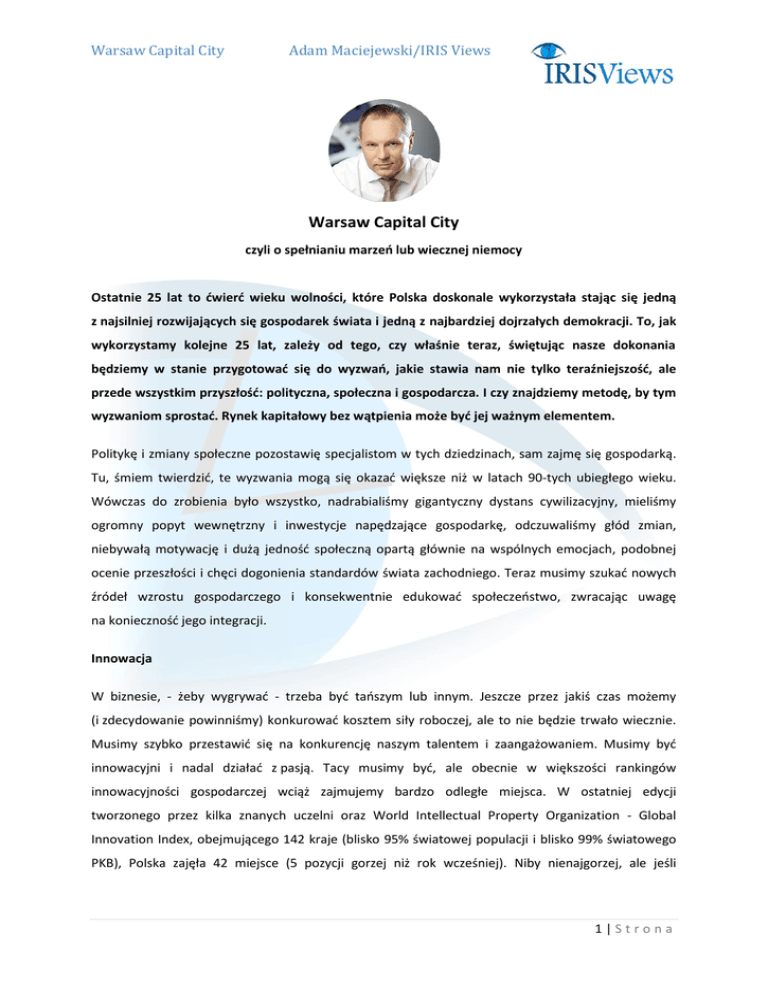 Warsaw Capital City Adam Maciejewski/IRIS Views Warsaw Capital City czyli o spełnianiu marzeń lub wiecznej niemocy Ostatnie 25 lat to ćwierć wieku wolności, które Polska doskonale wykorzystała stając się jedną z najsilniej rozwijających się gospodarek świata i jedną z najbardziej dojrzałych demokracji. To, jak wykorzystamy kolejne 25 lat, zależy od tego, czy właśnie teraz, świętując nasze dokonania będziemy w stanie przygotować się do wyzwań, jakie stawia nam nie tylko teraźniejszość, ale przede wszystkim przyszłość: polityczna, społeczna i gospodarcza. I czy znajdziemy metodę, by tym wyzwaniom sprostać. Rynek kapitałowy bez wątpienia może być jej ważnym elementem. Politykę i zmiany społeczne pozostawię specjalistom w tych dziedzinach, sam zajmę się gospodarką. Tu, śmiem twierdzić, te wyzwania mogą się okazać większe niż w latach 90-tych ubiegłego wieku. Wówczas do zrobienia było wszystko, nadrabialiśmy gigantyczny dystans cywilizacyjny, mieliśmy ogromny popyt wewnętrzny i inwestycje napędzające gospodarkę, odczuwaliśmy głód zmian, niebywałą motywację i dużą jedność społeczną opartą głównie na wspólnych emocjach, podobnej ocenie przeszłości i chęci dogonienia standardów świata zachodniego. Teraz musimy szukać nowych źródeł wzrostu gospodarczego i konsekwentnie edukować społeczeństwo, zwracając uwagę na konieczność jego integracji. Innowacja W biznesie, - żeby wygrywać - trzeba być tańszym lub innym. Jeszcze przez jakiś czas możemy (i zdecydowanie powinniśmy) konkurować kosztem siły roboczej, ale to nie będzie trwało wiecznie. Musimy szybko przestawić się na konkurencję naszym talentem i zaangażowaniem. Musimy być innowacyjni i nadal działać z pasją. Tacy musimy być, ale obecnie w większości rankingów innowacyjności gospodarczej wciąż zajmujemy bardzo odległe miejsca. W ostatniej edycji tworzonego przez kilka znanych uczelni oraz World Intellectual Property Organization - Global Innovation Index, obejmującego 142 kraje (blisko 95% światowej populacji i blisko 99% światowego PKB), Polska zajęła 42 miejsce (5 pozycji gorzej niż rok wcześniej). Niby nienajgorzej, ale jeśli 1|Strona Warsaw Capital City Adam Maciejewski/IRIS Views popatrzymy na efektywność nakładów na innowacje mierzoną wskaźnikiem Innovation Efficiency Ratio, to nasza pozycja już zmienia się drastycznie – spadamy na dalekie 110 miejsce. W rankingu innowacyjności Komisji Europejskiej (Innovation Union Scoreboard 2014) obejmującym, 29 krajów, znaleźliśmy się na czwartym miejscu od końca ze wskaźnikiem innowacyjności na poziomie 50,5% średniej unijnej. Co niepokojące, wskaźnik ten w Unii systematycznie rośnie, w Polsce rośnie tylko minimalnie. Więcej optymizmu dają nam wyniki ostatniego rankingu Bloomberga obejmującego 110 krajów, w którym zajęliśmy zaskakująco wysoką pozycję – 24. Wynika z niego, że aż 96% polskich przedsiębiorców uważa, że innowacja jest dla nich priorytetem strategicznym (średnia globalna 91%). Mamy też dobrą pozycję w zakresie udziału spółek high-tech wśród emitentów giełdowych - wskaźnik high-tech density dał nam aż 13 pozycję w rankingu. Nieźle, czyli powyżej średniej, wypadamy też w kontekście postrzegania znaczenia długoterminowych inwestycji o charakterze innowacyjnym. Warte podkreślenia jest też, że w wielu krajach panuje coraz silniejsze przekonanie, że innowacje mogą pochodzić od firm niezależnie od ich wielkości – w Polsce natomiast ta wiara istotnie ostatnio spadła. Jak widać wiele zależy od metodyki, którą przyjmą badający, ale nam nie o metodykę powinno chodzić. Nie powinniśmy cieszyć się, że znaleźliśmy ranking innowacyjności, w którym wypadamy nieźle. Polacy mają w sobie energię do zmian, są przedsiębiorczy i kreatywni. Musimy tylko znaleźć narzędzia, które pozwolą tak ukierunkować tę energię, że niezależnie od tego kto robi ranking innowacyjność, my będziemy w jego czołówce, bo to na niej będzie się opierać nasza gospodarka przyszłości. Paliwo dla nowych źródeł wzrostu Wzrost PKB nie będzie utrzymywany siłą rozpędu – potrzebne są nowe silniki. Co może je napędzać? Odpowiedzi może być wiele, ale elementem każdej z nich musi być rynek kapitałowy. Model finansowania rozwoju polskiej przedsiębiorczości jest zdominowany przez banki, ze zbyt małą rolą instrumentów rynku kapitałowego. Na koniec roku 2013 wartość kredytów dla przedsiębiorstw wyniosła prawie 245 mld zł. W tym samym czasie zadłużenie z tytułu emisji obligacji przedsiębiorstw wyniosło ok. 38 mld zł, a wartość IPO i SPO w całym roku 2013 ok. 8 mld zł, z czego ok. 55% nie zasiliło spółek, ale akcjonariuszy sprzedających akcje. Model bankowy, generalnie rzecz biorąc, nie sprzyja innowacyjności, bo zasila głównie biznes stabilny i bezpieczny, czyli w fazie dojrzałej lub 2|Strona Warsaw Capital City Adam Maciejewski/IRIS Views nawet poprzedzającej przekwitanie przedsiębiorstwa. Oczywiście w tym obszarze jest też wiele bardzo dobrych programów, które wychodzą naprzeciw małej i średniej przedsiębiorczości. Przykładem jest program gwarancji de minimis, który wprowadzony w Polsce wiosną ubiegłego roku okazał się wielkim sukcesem. Skorzystało z niego ok. 45 tys. przedsiębiorców, a wartość kredytów dzięki udzielonym gwarancjom (8,4 mld zł) wyniosła ok. 15 mld zł. Choć programy tego typu są formą pomocy publicznej, a nie rozwiązaniem czysto rynkowym, to jednak są bardzo cennym rozwiązaniem z punktu widzenia stymulowania rozwoju gospodarczego wśród MŚP. Generalnie jednak model bankowy nie zasila w wystarczający sposób młodych, innowacyjnych, dynamicznych, ale przez to bardziej ryzykownych przedsięwzięć. Do tego potrzeba kapitału, który lubi ryzyko, czasami mniejsze, innym razem większe, ale jest na nie gotów. To wła