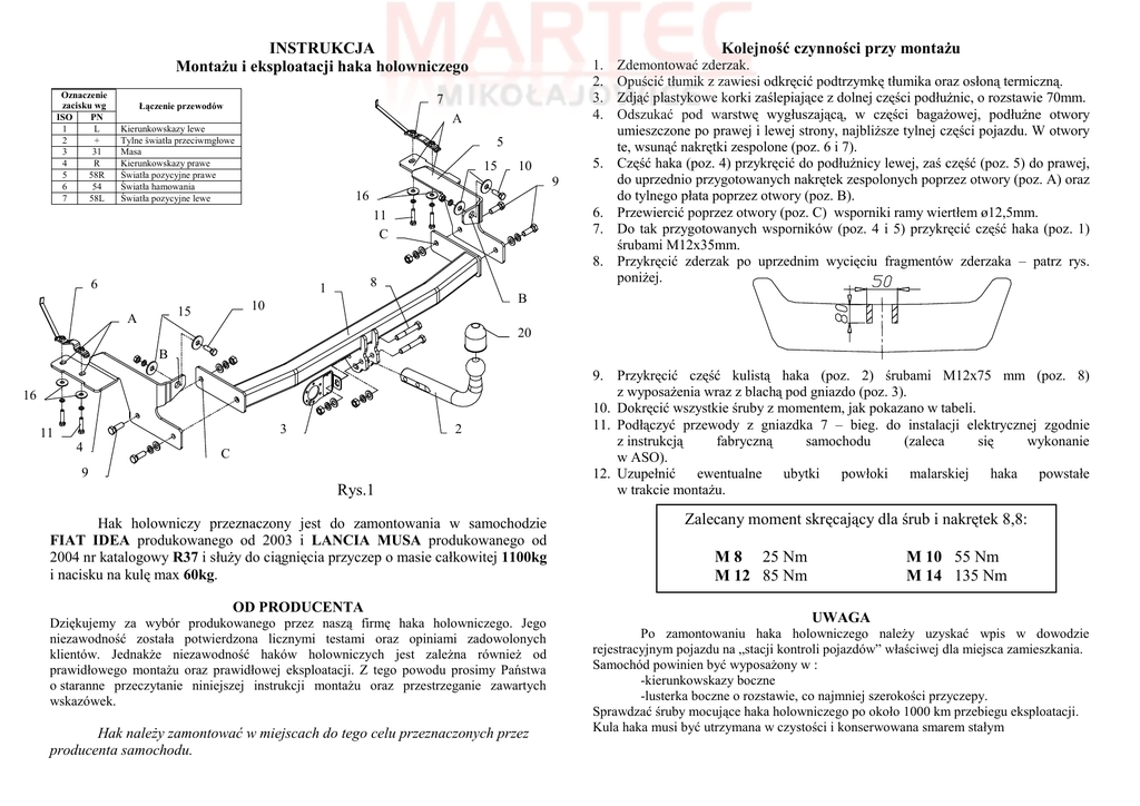 Kolejność czynności przy montażu INSTRUKCJA Montażu i eksploatacji haka holowniczego Oznaczenie zacisku wg ISO PN 1 L 2 + 3 31 4 R 5 58R 6 54 7 58L 1. 2. 3. 4. 7 Łączenie przewodów A Kierunkowskazy lewe Tylne światła przeciwmgłowe Masa Kierunkowskazy prawe Światła pozycyjne prawe Światła hamowania Światła pozycyjne lewe 5 15 5. 10 9 16 6. 7. 11 C 8. 6 8 1 A B 10 15 Zdemontować zderzak. Opuścić tłumik z zawiesi odkręcić podtrzymkę tłumika oraz osłoną termiczną. Zdjąć plastykowe korki zaślepiające z dolnej części podłużnic, o rozstawie 70mm. Odszukać pod warstwę wygłuszającą, w części bagażowej, podłużne otwory umieszczone po prawej i lewej strony, najbliższe tylnej części pojazdu. W otwory te, wsunąć nakrętki zespolone (poz. 6 i 7). Część haka (poz. 4) przykręcić do podłużnicy lewej, zaś część (poz. 5) do prawej, do uprzednio przygotowanych nakrętek zespolonych poprzez otwory (poz. A) oraz do tylnego płata poprzez otwory (poz. B). Przewiercić poprzez otwory (poz. C) wsporniki ramy wiertłem ø12,5mm. Do tak przygotowanych wsporników (poz. 4 i 5) przykręcić część haka (poz. 1) śrubami M12x35mm. Przykręcić zderzak po uprzednim wycięciu fragmentów zderzaka – patrz rys. poniżej. 20 B 16 2 3 11 4 C 9 Rys.1 Hak holowniczy przeznaczony jest do zamontowania w samochodzie FIAT IDEA produkowanego od 2003 i LANCIA MUSA produkowanego od 2004 nr katalogowy R37 i służy do ciągnięcia przyczep o masie całkowitej 1100kg i nacisku na kulę max 60kg. OD PRODUCENTA Dziękujemy za wybór produkowanego przez naszą firmę haka holowniczego. Jego niezawodność została potwierdzona licznymi testami oraz opiniami zadowolonych klientów. Jednakże niezawodność haków holowniczych jest zależna również od prawidłowego montażu oraz prawidłowej eksploatacji. Z tego powodu prosimy Państwa o staranne przeczytanie niniejszej instrukcji montażu oraz przestrzeganie zawartych wskazówek. Hak należy zamontować w miejscach do tego celu przeznaczonych przez producenta samochodu. 9. Przykręcić część kulistą haka (poz. 2) śrubami M12x75 mm (poz. 8) z wyposażenia wraz z blachą pod gniazdo (poz. 3). 10. Dokręcić wszystkie śruby z momentem, jak pokazano w tabeli. 11. Podłączyć przewody z gniazdka 7 – bieg. do instalacji elektrycznej zgodnie z instrukcją fabryczną samochodu (zaleca się wykonanie w ASO). 12. Uzupełnić ewentualne ubytki powłoki malarskiej haka powstałe w trakcie montażu. Zalecany moment skręcający dla śrub i nakrętek 8,8: M 8 25 Nm M 12 85 Nm M 10 55 Nm M 14 135 Nm UWAGA Po zamontowaniu haka holowniczego należy uzyskać wpis w dowodzie rejestracyjnym pojazdu na „stacji kontroli pojazdów” właściwej dla miejsca zamieszkania. Samochód powinien być wyposażony w : -kierunkowskazy boczne -lusterka boczne o rozstawie, co najmniej szerokości przyczepy. Sprawdzać śruby mocujące haka holowniczego po około 1000 km przebiegu eksploatacji. Kula haka musi być utrzymana w czystości i konserwowana smarem stałym PPUH AUTO-HAK S. J. Wyposażenie haka: Produkcja Haków Holowniczych Henryk & Zbigniew Nejman 76-200 SŁUPSK ul. Słoneczna 16K tel/fax (059) 8-414-414; 8-414-413 E-mail: [email protected] www.autohak.com.pl Hak holowniczy bez wyposażenia elektrycznego Klasa: A50-X Nr kat. R37 Przeznaczony do zamontowania w samochodzie: Producent: FIAT Model: IDEA produkowanego od 2003 r. Model: LANCIA MUSA produkowanego od 2004 r. Dane techniczne: Wartość siły D : 6,8 kN maksymalna masa przyczepy: 1100 kg maksymalny nacisk na kulę: 60 kg Numer homologacji zgodnie z wytycznymi regulaminu EKG/ONZ 55.01: E20-55R-01 1772 KARTA GWARANCYJNA Producent udziela gwarancji niniejszą kartą gwarancyjną na okres 24 miesięcy licząc od dnia zakupu haka holowniczego do samochodu: INFORMACJA WSTĘPNA FIAT IDEA produkowanego od 2003 r. LANCIA MUSA produkowanego od 2004 r. Data produkcji .............................. Data zakupu.................................. Zakres gwarancji obejmuje wyłącznie wady jakościowe wynikające z winy producenta. Gwarancja nie obejmuje natomiast uszkodzeń zawinionych przez nabywcę, wynikających z niewłaściwego montażu, użytkowania lub konserwacji, uszkodzeń mechanicznych, normalnego zużycia podczas eksploatacji itp. Gwarancja udzielona na zakupiony towar nie wyłącza, nie ogranicza ani nie zawiesza uprawnień kupującego wynikających z niezgodności towaru z umową. Reklamacje należy zgłaszać w punkcie sprzedaży, składając jednocześnie kartę gwarancyjną. Usunięcie "wady" następuje po stwierdzeniu przez punkt sprzedaży wspólnie z producentem słuszności złożonej reklamacji. Reklamacja powinna być załatwiona w ciągu czternastu dni od dnia uznania reklamacji. Karta gwarancyjna jest nieważna jeżeli nie jest wypełniona i podpisana. Data zgłoszenia reklamacji: ................................................................... Hak holowniczy jest skonstruowany zgodnie z zasadami bezpieczeństwa ruchu drogowego. Hak holowniczy jest elementem wpływającym na bezpieczeństwo jazdy i może zostać zainstalowany wyłącznie przez personel wyspecjalizowany. Niedopuszczalne jest dokonywanie jakichkolwiek zmian w konstrukcji haka. Powoduje to wygaśniecie dopuszczenia do stosowania. W przypadku obecności masy izolacyjnej lub osłony podwozia w miejscu przylegania haka, należy ją usunąć. Nieosłonięte miejsca karoserii oraz wywiercone otwory należy pomalować farbą antykorozyjną. Informacjami wiążącymi odnośnie wartości obciążeń są dane podawane przez producenta samochodu, względnie wartości maksymalnej masy przyczepy oraz maksymalnego nacisku na kulę, przy czym wartości parametrów haka holowniczego nie mogą być przekroczone. Wzór do obliczania wartości siły D: Maks. masa przyczepy [kg] x Masa całkowita samochodu [kg] 9,81 = X + 1000 Masa całkowita samochodu [kg] Maks. masa przyczepy [kg] + + D [kN]