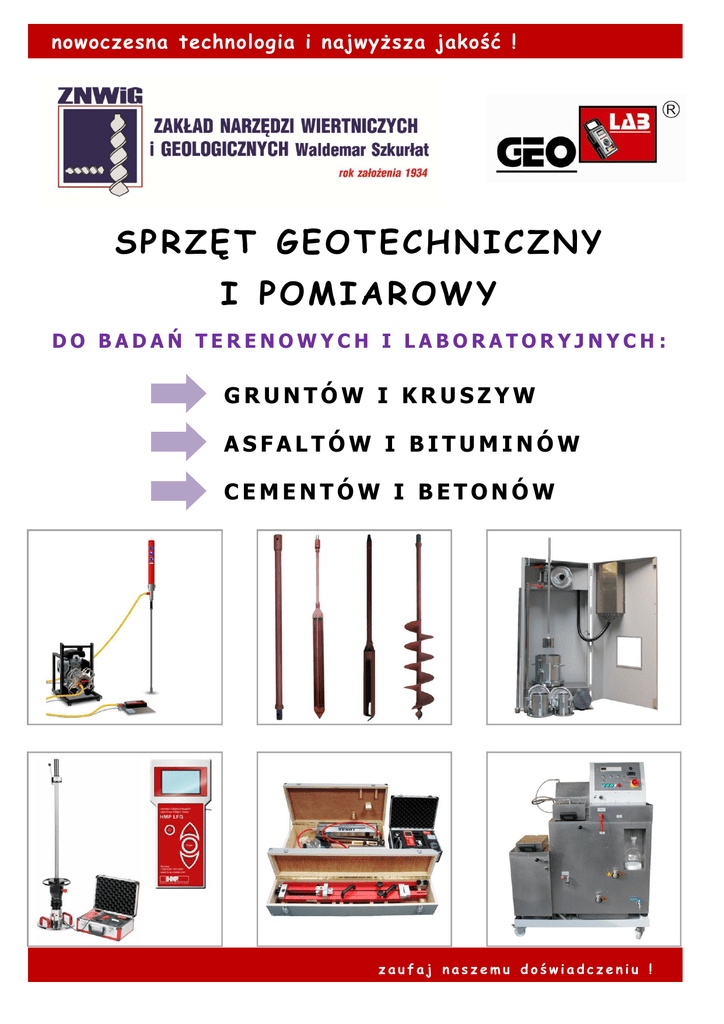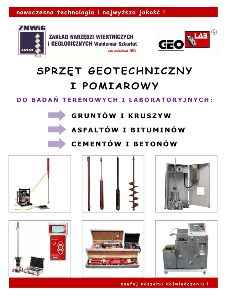 nowoczesna technologia i najwyższa jakość ! SPRZĘT GEOTECHNICZNY I POMIAROWY DO BADAŃ TERENOWYCH I LABORATORYJNYCH: GRUNTÓW I KRUSZYW ASFALTÓW I BITUMINÓW CEMENTÓW I BETONÓW zaufaj naszemu doświadczeniu ! Spis treści GRUNTY I KRUSZYWA – SPRZĘT DO BADAŃ TERENOWYCH 3 GRUNTY I KRUSZYWA – SPRZĘT DO BADAŃ LABORATORYJNYCH 18 ASFALTY I BITUMINY 27 BETONY I CEMENTY 33 BADANIE WODY 38 NASI PARTNERZY: T DO NAS KONTAKT DO NAS: ul. Szosa Lubelska 4, 05 – 077 WARSZAWA, POLSKA [email protected] [email protected] tel.: +48 22 428 13 89 tel.:/fax.: +48 22 773 37 78 www.geolab.com.pl tel.:/fax.: +48 22 773 39 32 www. szkurlat.pl fax: +48 22 773 39 33 zaufaj naszemu doświadczeniu ! GRUNTY I KRUSZYWA – SPRZĘT DO BADAŃ TERENOWYCH www.geolab.com.pl www.szkurlat.pl LEKKA PŁYTA DYNAMICZNA HMP LFG Niezawodna, inteligentna, precyzyjna Zgodna z Niemieckimi “Technicznymi zasadami stosowania płyty do badań dynamicznych podłoża gruntowego w budownictwie drogowym i kolejowym TP BF – StB część B 8.3/wydanie 2012” Kontrola zagęszczenia gruntu w ciągu 2 minut ! Niezawodne, szybkie i tanie urządzenie do określania dynamicznego modułu odkształcenia Evd ! Pomiar wartości osiadania gruntu s1, s2, s3 Automatyczne obliczanie prędkości osiadania s/v Automatyczne obliczanie dynamicznego modułu odkształcenia Evd Prezentacja wyników badania na wyświetlaczu rejestratora lub wydruku WSZYSTKIE MODELE PŁYTY DYNAMICZNEJ HMP LFG POSIADAJĄ CERTYFIKAT JAKOŚCI PRODUKCJI, ZARZĄDZANIA, ROZWOJU TECHNOLOGII ORAZ SERWISU DIN EN ISO 9001 :2008 PRODUCENTA HMP MAGDEBURGER Prufgeratebau GmbH Specyfikacja techniczna: Masa obciążnika: 10 kg [opcjonalnie wersja z obciążnikiem 15 kg] Średnica płyty obciążeniowej: Ø300 mm Max. siła uderzeniowa: 7,07 kN Czas trwania uderzenia: 17,0±1,5 ms Dopuszczalna temp. otoczenia: 0ºC - +40ºC Pamięć wewnętrzna: 500-1000 pomiarów; pamięć zewnętrzna: pamięć USB 2GB Menu w języku polskim [14 innych języków do wyboru] Zakres badań: Grunty grubo- i różnoziarniste o maksymalnym rozmiarze ziarna 63 mm Określanie dynamicznego modułu odkształcenia w zakresie E vd = 5...70 MN/m² Dla wersji z obciążnikiem 15 kg optymalny zakres 70…120 MN/m2 [max. 225 MN/m2] Wielorakie obszary zastosowania: kontrola jakościowa podczas budowy dróg samochodowych kontrola jakościowa podczas budowy nasypów kolejowych zapewnienie jakości podczas prac ziemnych kontrola zagęszczenia w wykopach sprawdzenie jakości prac przy instalacji rurociągów sprawdzenie jakości prac przy instalacji sieci wodociągowych sprawdzenie jakości prac przy instalacji sieci elektrycznych testowanie nośności podsypek i podbudów określanie nośności podłoża w pracach brukarskich … d o ś wi ad cz e ni e , j ak ość i pro f e s jo n ali z m … Port USB Port GPS Port Drukarki 3 GRUNTY I KRUSZYWA – SPRZĘT DO BADAŃ TERENOWYCH www.geolab.com.pl 4 www.szkurlat.pl Dostępne wersje Lekkiej Płyty Dynamicznej: HMP LFG wersja podstawowa HMP LFG-PC wersja z oprogramowaniem komputerowym HMP LFG-D wersja z drukarką HMP LFG-D/PC wersja z drukarką oraz oprogramowaniem komputerowym HMP LFG-D/PC+GPS wersja ALL INCLUSIVE zawierająca drukarkę, oprogramowanie komputerowe oraz zewnętrzny odbiornik GPS W każdej chwili można też zakupioną płytę doposażyć w dodatkowe akcesoria w zależności od aktualnych potrzeb Klienta ! Każda Lekka Płyta Dynamiczna HMP LFG posiada: 24 MIESIĄCE GWARANCJI ZAPEWNIONĄ DOSTĘPNOŚĆ CZĘŚCI ZAMIENNYCH PRZEZ 10 LAT CERTYFIKAT KALIBRACJI [ŚWIADECTWO WZORCOWANIA] DOKONANEJ W AKREDYTOWANYM STANOWISKU W NIEMCZECH WAŻNY 12 MIESIĘCY CERTYFIKAT JAKOŚCI WG MIĘDZYNARODOWEJ NORMY DIN EN ISO 9001: 2008 DEKLARACJĘ ZGODNOŚCI Z DYREKTYWAMI BEZPIECZEŃSTWA EEC I ODPOWIEDNIMI NORMAMI TECHNICZNYMI DIN EN ISO KARTONY TRANSPORTOWE WIELOKTROTNEGO UŻYTKU Ponadto zapewniamy: BEZPŁATNE SZKOLENIA Z OBSŁUGI URZĄDZENIA BEZPŁATNE KONSULTACJE TELEFONICZNE PEŁEN SERWIS GWARANCYJNY I POGWARANCYJNY URZĄDZENIE ZASTĘPCZE NA CZAS SERWISU MOŻLIWOŚĆ WYPOŻYCZENIA DODATKOWEGO URZĄDZENIA Certyfikowane stanowisko kalibracji: AUTORYZOWANE PRZEZ FEDERALNY INSTYTUT BADAŃ DROGOWYCH KAŻDE URZĄDZENIE POSIADA ŚWIADECTWO KALIBRACJI URZĄDZENIA POWINNY BYĆ KALIBROWANE CO 12 MIESIĘCY ZAPEWNIONY SERWIS, PRZEGLĄD I KONSERWACJA OBSŁUGA LOGISTYCZNA DOOR-TO-DOOR AKCESORIA DO LEKKIEJ PŁYTY DYNAMICZNEJ HMP LFG Oprogramowanie w języku polskim do analizy oraz wydruku protokołów Transfer danych z rejestratora/pamięci USB do komputera Możliwość kreowania profesjonalnych protokołów z wykresami krzywej osiadania Nieograniczona ilość licencji – możliwość zapisu na kilku komputerach Drukarka termiczna AP 1300 – graficzna Mała, szybka – natychmiastowe wyniki oraz wykres osiadania Wbudowany zestaw akumulatorów Dołączona ładowarka samochodowa Bezprzewodowy system GPS Umożliwia zapis współrzędnych w pamięci rejestratora oraz ich wydruk na protokole Wózek do transportu do bezpiecznego transportu HMP LFG na miejscu badania gumowe koła, z uchwytami na płytę dynamiczną oraz jej akcesoria Podstawa spoczynkowa z magnesem Do bezpiecznego i szybkiego odkładania mechanizmu obciążającego w czasie badań Skrzynia drewniana do transportu Wzmocniona dla bezpiecznego przechowywania HMP LFG w pojeździe, magazynie lub na potrzeby wszelkiego rodzaju transportu Mata gumowa do samokontroli poprawności pomiarów Dodatkowa prowadnica z obciążnikiem 15 kg Pozwala na przeprowadzanie testów obciążania dynamicznego dla frakcji o większej średnicy, może być stosowana z każdą standardową Płytą Dynamiczną HMP LFG … d o ś wi ad cz e ni e , j ak o ść i pro f e s jo n ali z m … GRUNTY I KRUSZYWA – SPRZĘT DO BADAŃ TERENOWYCH www.geolab.com.pl www.szkurlat.pl PŁYTA STATYCZNA VSS TRÓJPUNKTOWA 3F [2.340] WG NORMY PN-S-02205 oraz BN -64/8931-02 Płyta przeznaczona jest do oznaczania pierwotnego i wtórnego modułu odkształcenia nawierzchni