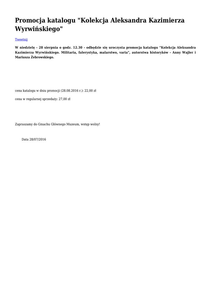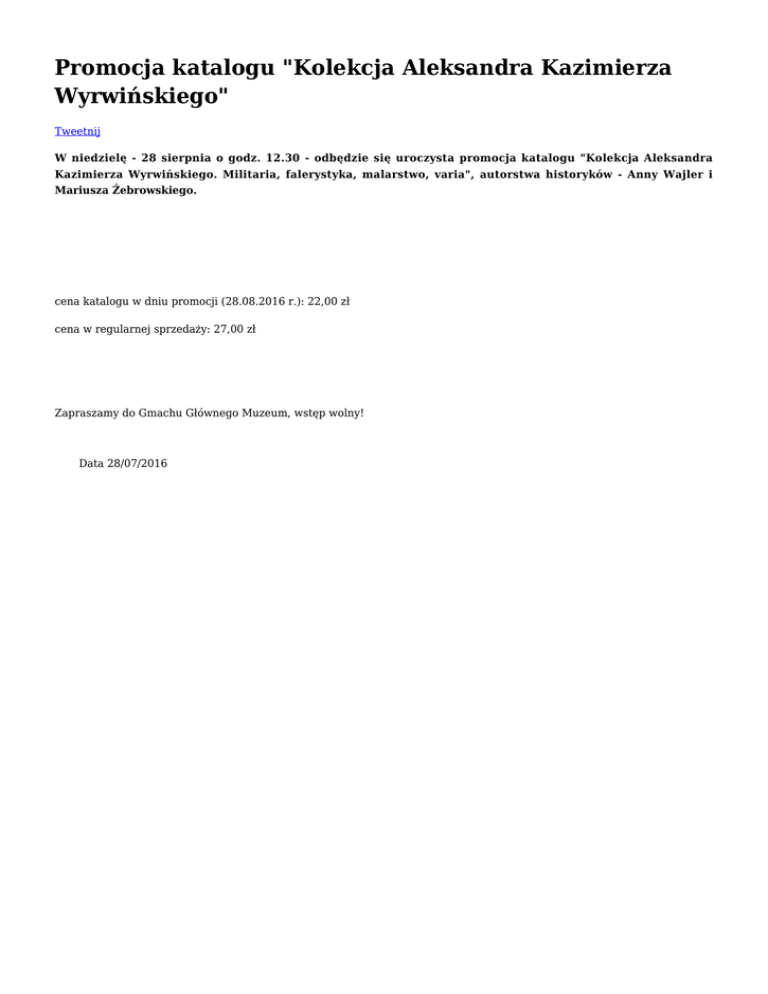 Promocja katalogu "Kolekcja Aleksandra Kazimierza Wyrwińskiego" Tweetnij W niedzielę - 28 sierpnia o godz. 12.30 - odbędzie się uroczysta promocja katalogu "Kolekcja Aleksandra Kazimierza Wyrwińskiego. Militaria, falerystyka, malarstwo, varia", autorstwa historyków - Anny Wajler i Mariusza Żebrowskiego. cena katalogu w dniu promocji (28.08.2016 r.): 22,00 zł cena w regularnej sprzedaży: 27,00 zł Zapraszamy do Gmachu Głównego Muzeum, wstęp wolny! Data 28/07/2016