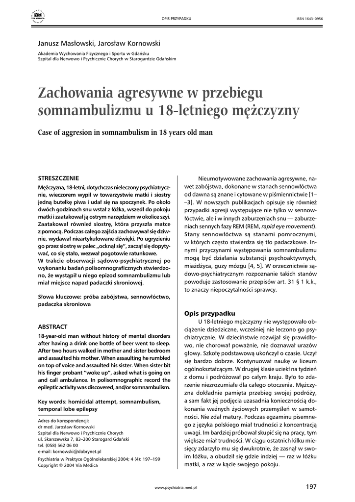 OPIS PRZYPADKU ISSN 1643–0956 Janusz Masłowski, Jarosław Kornowski Akademia Wychowania Fizycznego i Sportu w Gdańsku Szpital dla Nerwowo i Psychicznie Chorych w Starogardzie Gdańskim Zachowania agresywne w przebiegu somnambulizmu u 18-letniego mężczyzny Case of aggresion in somnambulism in 18 years old man STRESZCZENIE Mężczyzna, 18-letni, dotychczas nieleczony psychiatrycznie, wieczorem wypił w towarzystwie matki i siostry jedną butelkę piwa i udał się na spoczynek. Po około dwóch godzinach snu wstał z łóżka, wszedł do pokoju matki i zaatakował ją ostrym narzędziem w okolice szyi. Zaatakował również siostrę, która przyszła matce z pomocą. Podczas całego zajścia zachowywał się dziwnie, wydawał nieartykułowane dźwięki. Po ugryzieniu go przez siostrę w palec „ocknął się”, zaczął się dopytywać, co się stało, wezwał pogotowie ratunkowe. W trakcie obserwacji sądowo-psychiatrycznej po wykonaniu badań polisomnograficznych stwierdzono, że wystąpił u niego epizod somnambulizmu lub miał miejsce napad padaczki skroniowej. Nieumotywowane zachowania agresywne, nawet zabójstwa, dokonane w stanach sennowłóctwa od dawna są znane i cytowane w piśmiennictwie [1– –3]. W nowszych publikacjach opisuje się również przypadki agresji występujące nie tylko w sennowłóctwie, ale i w innych zaburzeniach snu — zaburzeniach sennych fazy REM (REM, rapid eye movement). Stany sennowłóctwa są stanami pomrocznymi, w których często stwierdza się tło padaczkowe. Innymi przyczynami występowania somnambulizmu mogą być działania substancji psychoaktywnych, miażdżyca, guzy mózgu [4, 5]. W orzecznictwie sądowo-psychiatrycznym rozpoznanie takich stanów powoduje zastosowanie przepisów art. 31 § 1 k.k., to znaczy niepoczytalności sprawcy. Słowa kluczowe: próba zabójstwa, sennowłóctwo, padaczka skroniowa Opis przypadku ABSTRACT 18-year-old man without history of mental disorders after having a drink one bottle of beer went to sleep. After two hours walked in mother and sister bedroom and assaulted his mother. When assaulting he rumbled on top of voice and assaulted his sister. When sister bit his finger probant “woke up”, asked what is going on and call ambulance. In polisomnographic record the epileptic activity was discovered, and/or somnambulism. Key words: homicidal attempt, somnambulism, temporal lobe epilepsy Adres do korespondencji: dr med. Jarosław Kornowski Szpital dla Nerwowo i Psychicznie Chorych ul. Skarszewska 7, 83–200 Starogard Gdański tel. (058) 562 06 00 e-mail: [email protected] Psychiatria w Praktyce Ogólnolekarskiej 2004; 4 (4): 197–199 Copyright © 2004 Via Medica U 18-letniego mężczyzny nie występowało obciążenie dziedziczne, wcześniej nie leczono go psychiatrycznie. W dzieciństwie rozwijał się prawidłowo, nie chorował poważnie, nie doznawał urazów głowy. Szkołę podstawową ukończył o czasie. Uczył się bardzo dobrze. Kontynuował naukę w liceum ogólnokształcącym. W drugiej klasie uciekł na tydzień z domu i podróżował po całym kraju. Było to zdarzenie niezrozumiałe dla całego otoczenia. Mężczyzna dokładnie pamięta przebieg swojej podróży, a sam fakt jej podjęcia uzasadnia koniecznością dokonania ważnych życiowych przemyśleń w samotności. Nie zdał matury. Podczas egzaminu pisemnego z języka polskiego miał trudności z koncentracją uwagi. Im bardziej próbował skupić się na pracy, tym większe miał trudności. W ciągu ostatnich kilku miesięcy zdarzyło mu się dwukrotnie, że zasnął w swoim łóżku, a obudził się gdzie indziej — raz w łóżku matki, a raz w kącie swojego pokoju. www.psychiatria.med.pl 197 Psychiatria w Praktyce Ogólnolekarskiej 2004, tom 4, nr 4 Wieczorem w krytycznym dniu siedział wraz z siostrą i matką przy kolacji. Rozmawiali na różne tematy, między innymi, co będzie dalej robił. Wypił jedno piwo. Około północy położył się spać. Następna rzecz, jaką mężczyzna pamięta, to moment, kiedy siostra ugryzła go w palec. Zobaczył wtedy, że matka i siostra są zakrwawione. Matka powiedziała, że ma zatelefonować na pogotowie. Początkowo nie wiedział, co się stało. Później dowiedział się, że zaatakował nożem matkę i siostrę. Według relacji matki przyszedł w nocy do jej pokoju, obudził ją. Powiedział, że słyszy jakieś głosy u sąsiadów. Po chwili zaczął atakować matkę nożem. Atakował głównie szyję. Wydawał przy tym dziwne dźwięki. Miał błędny wzrok. Na pomoc przybiegła jego siostra, wtedy ją też zaczął atakować. Na jakiś czas matka straciła przytomność. Kiedy ją odzyskała, chłopak dalej szarpał się z siostrą. W pewnym momencie siostra ugryzła go w palec. Wtedy odzyskał świadomość. Matka kazała mu wezwać pogotowie, co też uczynił. Zaczął także tamować matce krew. Podczas obserwacji sądowo-psychiatrycznej stwierdzono następujące odchylenia od normy: — W badaniu RTG przeglądowym czaszki: czaszka zwiększona w swoim wymiarze przednio-tylnym i wysoka w wyniku przedwczesnego zamknięcia szwów, głównie strzałkowego. Również szew wieńcowy w większej części niewidoczny, zarośnięty. Kości pokrywy czaszki przeciętnej grubości z nieco pogłębionymi wyciskami palczastymi okolic ciemieniowych. Siodło tureckie małe, o masywnym grzbiecie. Wyrostki pochyłe przednie z tylnymi łączą się mostkiem kostnym. Nie stwierdzono patologicznych zwapnień wewnątrzczaszkowych. Wnioski: dolicho-scaphocephalia; — W badaniu tomografii komputerowej głowy: wariant anatomiczny budowy czaszki w postaci czaszki wieżowatej i łódkowatej. Nie stwierdzono zmian ogniskowych w zakresie struktur mózgowia. Nie ujawniono znaczących zaników korowych. Układ komorowy prawidłowy; — Badanie EEG wykazało zapis rozsianych zmian czynności podstawowej. Występuje podejrzenie czynności napadowej. W stanie psychicznym nie obserwowano zaburzeń psy