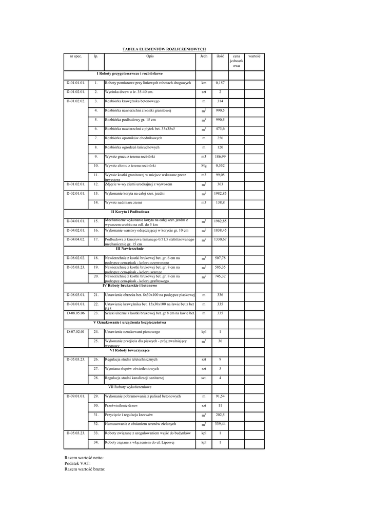 TABELA ELEMENTÓW ROZLICZENIOWYCH nr spec. lp. Opis Jedn ilość 0,157 I Roboty przygotowawcze i rozbiórkowe D-01.01.01. 1. Roboty pomiarowe przy liniowych robotach drogowych km D-01.02.01. 2. Wycinka drzew o śr. 35-40 cm. szt 2 D-01.02.02. 3. Rozbiórka krawężnika betonowego m 314 4. Rozbiórka nawierzchni z kostki granitowej m2 990,5 5. Rozbiórka podbudowy gr. 15 cm m 2 990,5 6. Rozbiórka nawierzchni z płytek bet. 35x35x5 m 2 473,6 7. Rozbiórka oporników chodnikowych m 256 8. Rozbiórka ogrodzeń łańcuchowych m 120 9. Wywóz gruzu z terenu rozbiórki m3 186,99 10. Wywóz złomu z terenu rozbiórki Mg 0,552 11. m3 99,05 D-01.02.01. 12. Wywóz kostki granitowej w miejsce wskazane przez inwestora Zdjęcie w-wy ziemi urodzajnej z wywozem m 2 D-02.01.01. 13. Wykonanie koryta na całej szer. jezdni m 2 14. Wywóz nadmiaru ziemi m3 138,8 m2 1982,85 m2 1838,45 2 1330,67 363 1982,85 II Koryto i Podbudowa D-04.01.01. 15. D-04.02.01. 16. D-04.04.02. 17. D-08.02.02. 18. D-05.03.23. 19. 20. Mechaniczne wykonanie koryta na całej szer. jezdni z wywozem urobku na odl. do 5 km Wykonanie warstwy odsączającej w korycie gr. 10 cm Podbudowa z kruszywa łamanego 0/31,5 stabilizowanego mechanicznie gr. 15 cm III Nawierzchnie Nawierzchnie z kostki brukowej bet. gr. 6 cm na podsypce cem-piask - koloru czerwonego Nawierzchnie z kostki brukowej bet. gr. 8 cm na podsypce cem-piask - koloru szarego Nawierzchnie z kostki brukowej bet. gr. 8 cm na podsypce cem-piask - koloru grafitowego IV Roboty brukarskie i betonowe m m2 507,78 m 2 585,35 m 2 745,32 D-08.03.01. 21. Ustawienie obrzeża bet. 8x30x100 na podsypce piaskowej m 336 D-08.01.01. 22. 335 23. Ustawienie krawężnika bet. 15x30x100 na ławie bet z bet B15 Ścieki uliczne z kostki brukowej bet. gr 8 cm na ławie bet. m D-08.05.06 m 335 V Oznakowanie i urządzenia bezpieczeństwa D-07.02.01 D-05.03.23. 24. Ustawienie oznakowani pionowego 25. Wykonanie przejścia dla pieszych - próg zwalniający wyspowy VI Roboty towarzyszące kpl m 26. Regulacja studni teletechnicznych szt 9 27. Wymiana słupów oświetleniowych szt 5 28. Regulacja studni kanalizacji sanitarnej szt. 4 2 1 36 VII Roboty wykończeniowe D-09.01.01. D-05.03.23. 29. Wykonanie pobramowania z palisad betonowych m 91,54 30. Prześwietlenie drzew szt 11 31. Przycięcie i regulacja krzewów m2 202,5 32. Humusowanie z obsianiem terenów zielonych m 33. Roboty związane z uregulowaniem wejść do budynków kpl 1 34. Roboty ziązane z włączeniem do ul. Lipowej kpl 1 Razem wartość netto: Podatek VAT: Razem wartość brutto: 2 339,44 cena jednostk owa wartość