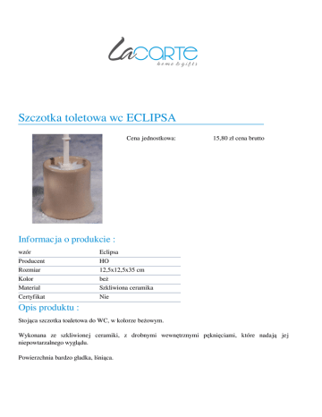 Szczotka toletowa wc ECLIPSA Cena jednostkowa: 15,80 zł cena brutto Informacja o produkcie : wzór Producent Rozmiar Kolor Material Certyfikat Eclipsa HO 12,5x12,5x35 cm beż Szkliwiona ceramika Nie Opis produktu : Stojąca szczotka toaletowa do WC, w kolorze beżowym. Wykonana ze szkliwionej ceramiki, z drobnymi wewnętrznymi pęknięciami, które nadają jej niepowtarzalnego wyglądu. Powierzchnia bardzo gładka, lśniąca. Oryginalny kształt, lekko rozszerzony u dołu. Praktyczna ozdoba toalety, pasuje do wnętrza urządzonego w stylu Art-Deco. Wymiary Długość: 12,5 cm Szerokość: 12,5 cm Wysokość: 35,5 cm Powered by TCPDF (www.tcpdf.org)