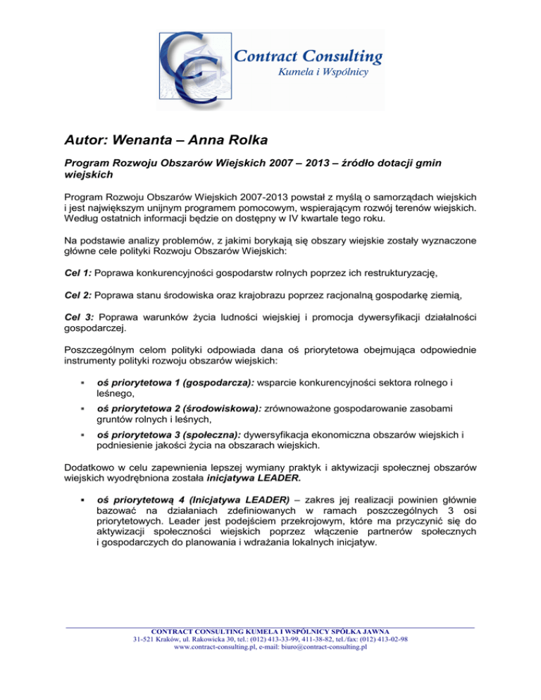 Autor: Wenanta – Anna Rolka Program Rozwoju Obszarów Wiejskich 2007 – 2013 – źródło dotacji gmin wiejskich Program Rozwoju Obszarów Wiejskich 2007-2013 powstał z myślą o samorządach wiejskich i jest największym unijnym programem pomocowym, wspierającym rozwój terenów wiejskich. Według ostatnich informacji będzie on dostępny w IV kwartale tego roku. Na podstawie analizy problemów, z jakimi borykają się obszary wiejskie zostały wyznaczone główne cele polityki Rozwoju Obszarów Wiejskich: Cel 1: Poprawa konkurencyjności gospodarstw rolnych poprzez ich restrukturyzację, Cel 2: Poprawa stanu środowiska oraz krajobrazu poprzez racjonalną gospodarkę ziemią, Cel 3: Poprawa warunków Ŝycia ludności wiejskiej i promocja dywersyfikacji działalności gospodarczej. Poszczególnym celom polityki odpowiada dana oś priorytetowa obejmująca odpowiednie instrumenty polityki rozwoju obszarów wiejskich: oś priorytetowa 1 (gospodarcza): wsparcie konkurencyjności sektora rolnego i leśnego, oś priorytetowa 2 (środowiskowa): zrównowaŜone gospodarowanie zasobami gruntów rolnych i leśnych, oś priorytetowa 3 (społeczna): dywersyfikacja ekonomiczna obszarów wiejskich i podniesienie jakości Ŝycia na obszarach wiejskich. Dodatkowo w celu zapewnienia lepszej wymiany praktyk i aktywizacji społecznej obszarów wiejskich wyodrębniona została inicjatywa LEADER. oś priorytetową 4 (Inicjatywa LEADER) – zakres jej realizacji powinien głównie bazować na działaniach zdefiniowanych w ramach poszczególnych 3 osi priorytetowych. Leader jest podejściem przekrojowym, które ma przyczynić się do aktywizacji społeczności wiejskich poprzez włączenie partnerów społecznych i gospodarczych do planowania i wdraŜania lokalnych inicjatyw. CONTRACT CONSULTING KUMELA I WSPÓLNICY SPÓŁKA JAWNA 31-521 Kraków, ul. Rakowicka 30, tel.: (012) 413-33-99, 411-38-82, tel./fax: (012) 413-02-98 www.contract-consulting.pl, e-mail: [email protected] oś priorytetow a 4 [LEADER]; 7% oś priorytetow a 1; 15% oś priorytetow a 3; 15% oś priorytetow a 2; 25% Wykres 1 Schemat procentowy minimalnego udziału środków z budŜetu UE jakie państwo członkowskie musi przeznaczyć na poszczególne osie priorytetowe Osiom priorytetowym przyporządkowano poszczególne instrumenty wdraŜania działań. Jedynym instrumentem obowiązkowym do wdroŜenia przez wszystkie kraje jest wspieranie przedsięwzięć rolnośrodowiskowych i poprawy dobrostanu zwierząt. W ramach Osi priorytetowej 1 przewidziane są następujące działania: 1. szkolenia zawodowe i akcje informacyjne dla osób zatrudnionych w rolnictwie i leśnictwie, 2. ułatwienie startu młodym rolnikom, 3. renty strukturalne, 4. wykorzystanie usług doradczych przez rolników oraz zarządców lasów, 5. organizacja usług doradczych w zakresie rolnictwa i leśnictwa; 6. modernizacja gospodarstw rolnych, 7. zwiększenie wartości gospodarczej lasów, 8. zwiększenie wartości dodanej podstawowej produkcji rolnej i leśnej, 9. infrastruktura związana z rozwojem i dostosowaniem rolnictwa i leśnictwa, 10. odtworzenie potencjału produkcji rolnej zniszczonego w wyniku klęsk Ŝywiołowych i wprowadzenie instrumentów zapobiegawczych; 11. wdraŜanie programów jakości Ŝywności, 12. wspieranie grup producentów w zakresie działalności informacyjnej i promocyjnej dla produktów objętych programami jakości Ŝywności; 13. wspieranie grup producentów rolnych. CONTRACT CONSULTING KUMELA I WSPÓLNICY SPÓŁKA JAWNA 31-521 Kraków, ul. Rakowicka 30, tel.: (012) 413-33-99, 411-38-82, tel./fax: (012) 413-02-98 www.contract-consulting.pl, e-mail: [email protected] W ramach Osi priorytetowej 2 przewidziane są następujące działania: 1. wspieranie gospodarstw na obszarach o niekorzystnych warunkach gospodarowania na obszarach górskich, 2. wspieranie gospodarstw na innych obszarach o niekorzystnych warunkach gospodarowania, 3. dopłaty do gruntów rolnych na obszarach sieci NATURA 2000, 4. wspieranie przedsięwzięć rolnośrodowiskowych i poprawy dobrostanu zwierząt, 5. inwestycje nie powiązane z produkcją rolniczą; 6. zalesianie gruntów rolnych, 7. zakładanie systemów rolno-leśnych na gruntach rolnych, 8. zalesianie gruntów innych niŜ grunty rolne, 9. dopłaty do gruntów leśnych na obszarach sieci NATURA 2000, 10. przedsięwzięcia leśno- środowiskowe, 11. odtwarzanie potencjału produkcji leśnej i wprowadzanie odpowiednich instrumentów zapobiegawczych, 12. inwestycje nie powiązane z produkcją leśną. W ramach Osi priorytetowej 3 przewidziane są następujące działania: 1. przejście do działalności pozarolniczej, 2. wspieranie tworzenia i rozwoju mikro-przedsiębiorstw w celu promocji przedsiębiorczości i rozwijania ekonomicznych podstaw regionu, 3. promocja turystyki, 4. ochrona, podnoszenie jakości i zarządzanie dziedzictwem kulturowym; 5. podstawowe usługi na rzecz gospodarki i ludności wiejskiej, 6. odnowa wsi i rozwój, ochrona i podniesienie jakości wiejskiego dziedzictwa kulturowego, 7. system szkoleń zawodowych dla podmiotów gospodarczych działających w obszarach objętych osią priorytetową 3, 8. system zdobywania kwalifikacji i aktywizacji w celu przygotowania i wdroŜenia lokalnej strategii rozwoju. Gmina, która ma zamiar starać się o pomoc w ramach PROW, musi wykorzystać czas, jaki pozostał do ogłoszenia terminów naboru do stworzenia aktualnego miejscowy plan zagospodarowania przestrzennego lub co najmniej studium uwarunkowań i kierunków zagospodarowania przestrzennego. Plan taki powinien obejmować całą gminę, takŜe tereny typowo rolnicze. Musi on przede wszystkim wskazać tereny, gdzie mogą być prowadzone inwestycje. Aplikując o środki dany samorząd powinien wziąć pod uwagę to, Ŝe PROW działa w oparciu o zasadę refundacji poniesionych kosztów. Gmina musi, więc zarezerwować środki w budŜecie lub pozyskać kredyt bankowy, a dopiero po zrealizowaniu przedsięwzi