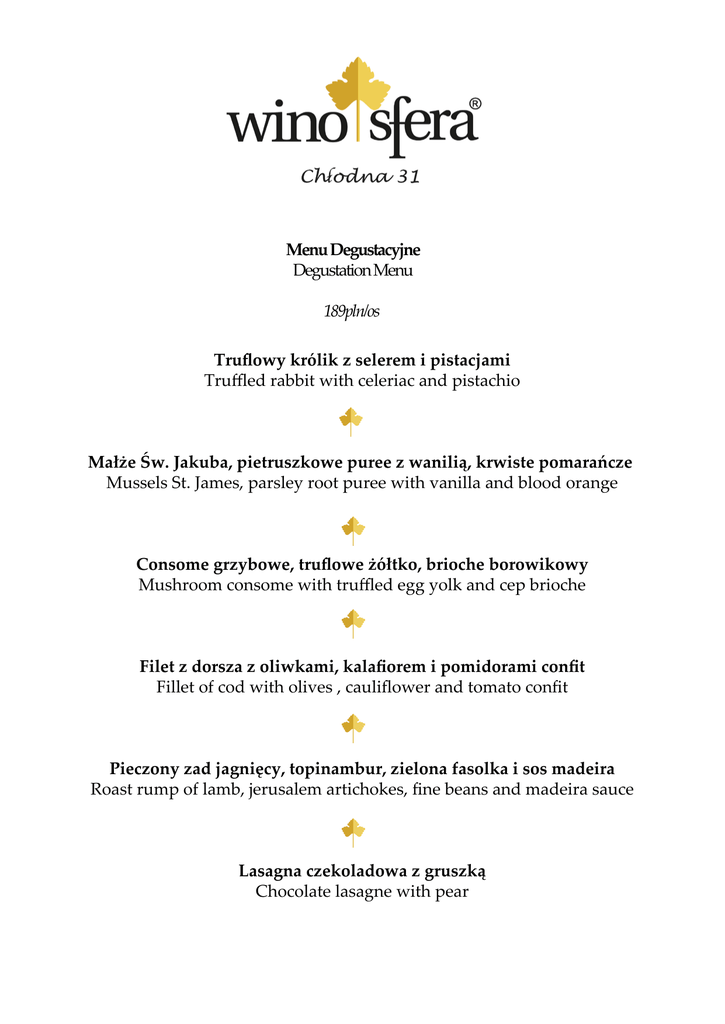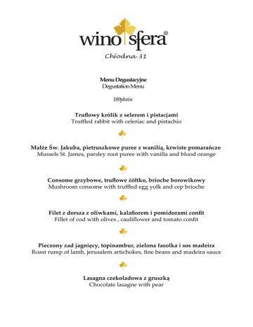 Menu Degustacyjne Degustation Menu 189pln/os Truflowy królik z selerem i pistacjami Truffled rabbit with celeriac and pistachio Małże Św. Jakuba, pietruszkowe puree z wanilią, krwiste pomarańcze Mussels St. James, parsley root puree with vanilla and blood orange Consome grzybowe, truflowe żółtko, brioche borowikowy Mushroom consome with truffled egg yolk and cep brioche Filet z dorsza z oliwkami, kalafiorem i pomidorami confit Fillet of cod with olives , cauliflower and tomato confit Pieczony zad jagnięcy, topinambur, zielona fasolka i sos madeira Roast rump of lamb, jerusalem artichokes, fine beans and madeira sauce Lasagna czekoladowa z gruszką Chocolate lasagne with pear