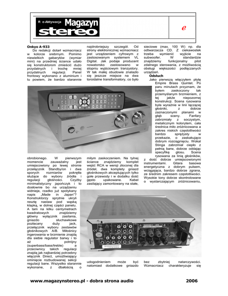 e Onkyo A-933 Do redakcji dotarł wzmacniacz w kolorze srebrnym. Pomimo niewielkich gabarytów (wymiar mini) na przedniej ściance udało się konstruktorom zmieścić duŜo przydatnych i trochę mniej przydatnych regulacji. Panel frontowy wykonano z aluminium i tu powiem, Ŝe bardzo starannie najdrobniejszy szczegół. Od strony elektronicznej wzmacniacz jest urządzeniem cyfrowym z zastosowanym systemem VL Digital. Jak podaje producent nowatorsko zastosowano w stopniu wyjściowym tranzystory. W tak małej obudowie znalazło się jeszcze miejsce na dwa toroidalne transformatory, co było obrobionego. W pierwszym momencie zauwaŜalny jest umiejscowiony po lewej stronie przełącznik Standby/on i dwa sporych rozmiarów pokrętła słuŜące do wyboru źródła i regulacji głośności. CzyŜby minimalistyczny japończyk i to dosłownie bo na urządzeniu widnieje, rzadko juŜ spotykany napis „Made in Japan”? Konstruktorzy sprytnie ukryli resztę nastaw pod wąską klapką, w dolnej części panelu. A tam na kilku centymetrach kwadratowych znajdziemy główny wyłącznik zasilania, gniazdo słuchawkowe pozłacany duŜy jack, przełącznik wyboru zestawów głośnikowych A/B. Miłośnicy ingerowania w brzmienie znajdą dla siebie regulator barwy i to aŜ potrójny (superbass/bass/treble) a przeciwnicy takich regulacji znajdą jak najbardziej potrzebny włącznik Direct, umoŜliwiający ominięcie rozbudowanej sekcji regulacji barw. Wszystko starannie wykonane, z dbałością o miłym zaskoczeniem. Na tylnej ściance znajdziemy komplet wejść RCA w wersji złoconej dla źródeł, dwa komplety gniazd głośnikowych akceptujących tylko gołe przewody i w dodatku dość gęsto upakowane. Kabel zasilający zamontowany na stałe, udogodnieniem moŜe być natomiast dodatkowe gniazdo www.magazynstereo.pl - dobra strona audio sieciowe (max. 100 W) np. dla odtwarzacza CD. Z ciekawostek trzeba wymienić wyjście na subwoofer. W standardzie znajdziemy funkcjonalny pilot zdalnego sterowania, z moŜliwością obsługi większości podłączanych urządzeń. Odsłuch Jako pierwszą włączyłem płytę Empire Brass Quintet. Po paru minutach przyznam, Ŝe byłem zaskoczony tak przemyślanym brzmieniem, z tej jakŜe niepozornej konstrukcji. Scena rysowana była wyraźnie w linii łączącej głośniki, z dobrze zaznaczonymi planami w głąb sceny. Fanfary zabrzmiały z soczystym, metalicznym kolorytem, cała średnica miło zróŜnicowana a zakres niskich częstotliwości bardzo spręŜysty w przekazie, o zaskakująco dobrym rozciągnięciu. Wokal Stinga zabrzmiał ciepło z pełnią barw, dobrze oddając specyfikę głosu. Scena rysowana za linią głośników, z dość dobrze umiejscowionymi instrumentami. Gitara basowa energetyczna z dobrym pulsem, wciągająca, bardzo dobrze zgrana, ze średnim zakresem częstotliwości. Wysokie tony dobrze skontrolowane o wystarczającym zróŜnicowaniu, bez zbytniej natarczywości. Wzmacniacz charakteryzuje się 2006 e przyjemnym, energicznym i duŜym dźwiękiem, o bardzo dobrym zróŜnicowaniu tonalnym. Björk ukazuje w pełni niuanse swojego głosu, zapisane na płycie. Ten „maluch” nic sobie nie robi z niskich częstotliwości, bardzo dobrze radząc sobie z przekazaniem wszelkich skoków dynamiki i to bez efekciarstwa, co w tym zakresie cenowym jest rzadko spotykane. Dokładnie zarysowane pozorne źródła dźwięku przypadną wielu słuchaczom do gustu. Skala mikrodynamiki prezentowana przez Onkyo jest bardzo dobra, natomiast skala makro ... jest jeszcze lepsza. Blask trąbki, dźwięczny a zarazem nie męczący. Budowa sceny bez problemu umoŜliwia lokalizację w trzech wymiarach, z zachowaniem bardzo realistycznego brzmienia instrumentów. Na szczególne słowa uznania zasługuje realistyczny sposób w jaki przedstawia werble i blaszane instrumenty dęte. Przyznam, Ŝe Onkyo zaskoczyło mnie swoim brzmieniem. Od pierwszych chwil słychać, Ŝe konstruktor poza zaprojektowaniem wnętrza brał udział w modyfikacji układu, aby otrzymać aktualne brzmienie. Wysokie tony, o bardzo dobrej rozdzielczości, z bardzo nisko schodzącym basem i w dodatku z rewelacyjnie wypełnionym średnim zakresem częstotliwości robi wraŜenie. Nelly Furtado udało się zaśpiewać bardzo dobrze zogniskowanym, stabilnym tonalnie głosem. Rys momentami, zwłaszcza przy wyŜszych rejestrach otrzymywał pewien cień przybrudzenia, ale był to na granicy percepcji. Wzmacniacz, poza bardzo wyraźnym przedstawianiem planów na scenie zaczyna bawić się równieŜ w przekazywanie zróŜnicowanej wysokości obrazu dźwiękowego, co nie często jest spotykane w tej klasie urządzeń. Przyznam, Ŝe za dobrze mi ten wzmacniacz się prezentuje w notatkach... (Przerwa...) Po kilku dniowej przerwie wracamy do odsłuchu Onkyo w identycznej konfiguracji jak poprzednio. Próba generalna do odtwarzacza wędruje (moŜe nie dosłownie) płyta Nine Inch Nails i ... moŜe nie będę porównywał do innych wzmacniaczy, będących w tym teście ale Onkyo staje na wysokości zadania i to bez specjalnego problemu. Nawet przy duŜych poziomach głośności doskonale radzi sobie z oddaniem najdrobniejszych szczegółów. Nie ma mowy o jakiejkolwiek kompresji zlewaniu się dźwięku. Wysokie tony są dość wyostrzone, przez co wzmacniacz zyskuje na szczegółowości, ale jeszcze na nie męczącym poziomie. Bardzo dobrze zróŜnicowany zakres średnich częstotliwości. Bas z bardzo dobrym pulsem. Całość brzmienia bardzo spójna, z rewelacyjnym w tym zakresie ogniskowaniem pozornych źródeł dźwięku na scenie. Płyta Davida Beckera potwierdziła tylko moje przypuszczenia, scena dobrze rozciągnięta między zestawami o zachowanej odpowiedniej głębokości, ze stabilnie rysowanymi planami. Bas ze swoją spręŜystością momentami wydaje się być trochę poluzowany, ale z tym mają problem i duŜo droŜsze konstrukcje. Analityczność na odpowiednim, nie przeszkadzającym w odbiorze muzyki pozio