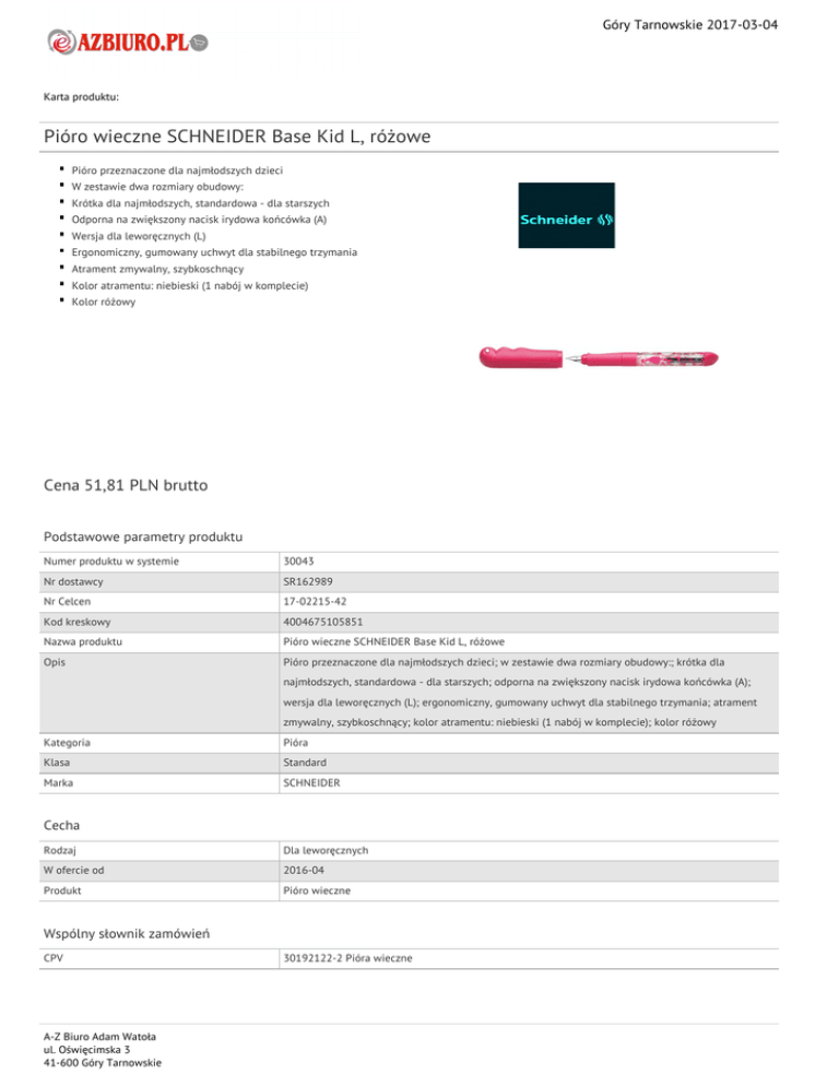 Góry Tarnowskie 2017-03-04 Karta produktu: Pióro wieczne SCHNEIDER Base Kid L, różowe Pióro przeznaczone dla najmłodszych dzieci W zestawie dwa rozmiary obudowy: Krótka dla najmłodszych, standardowa - dla starszych Odporna na zwiększony nacisk irydowa końcówka (A) Wersja dla leworęcznych (L) Ergonomiczny, gumowany uchwyt dla stabilnego trzymania Atrament zmywalny, szybkoschnący Kolor atramentu: niebieski (1 nabój w komplecie) Kolor różowy Cena 51,81 PLN brutto Podstawowe parametry produktu Numer produktu w systemie 30043 Nr dostawcy SR162989 Nr Celcen 17-02215-42 Kod kreskowy 4004675105851 Nazwa produktu Pióro wieczne SCHNEIDER Base Kid L, różowe Opis Pióro przeznaczone dla najmłodszych dzieci; w zestawie dwa rozmiary obudowy:; krótka dla najmłodszych, standardowa - dla starszych; odporna na zwiększony nacisk irydowa końcówka (A); wersja dla leworęcznych (L); ergonomiczny, gumowany uchwyt dla stabilnego trzymania; atrament zmywalny, szybkoschnący; kolor atramentu: niebieski (1 nabój w komplecie); kolor różowy Kategoria Pióra Klasa Standard Marka SCHNEIDER Cecha Rodzaj Dla leworęcznych W ofercie od 2016-04 Produkt Pióro wieczne Wspólny słownik zamówień CPV A-Z Biuro Adam Watoła ul. Oświęcimska 3 41-600 Góry Tarnowskie 30192122-2 Pióra wieczne Góry Tarnowskie 2017-03-04 Karta katalogowa produktu cd. Pióro wieczne SCHNEIDER Base Kid L, różowe Certyfikaty Nowy produkt w ofercie Standard Hit Standard Kolor Kolor Serdecznie zapraszamy do współpracy A-Z Biuro Adam Watoła zespół. A-Z Biuro Adam Watoła ul. Oświęcimska 3 41-600 Góry Tarnowskie Różowy