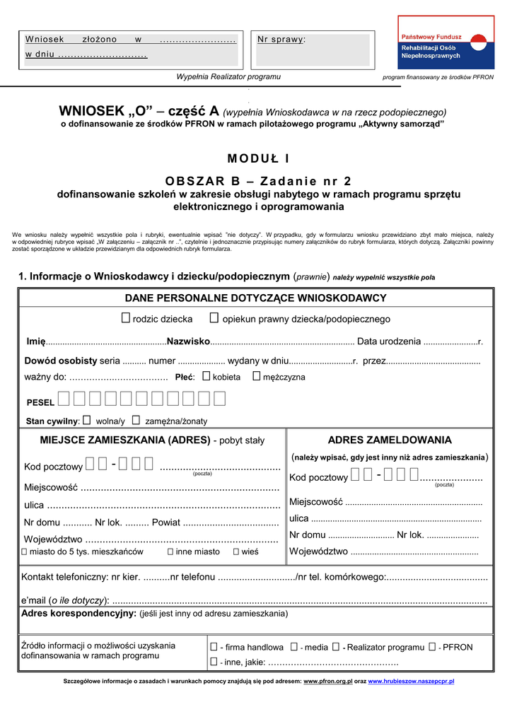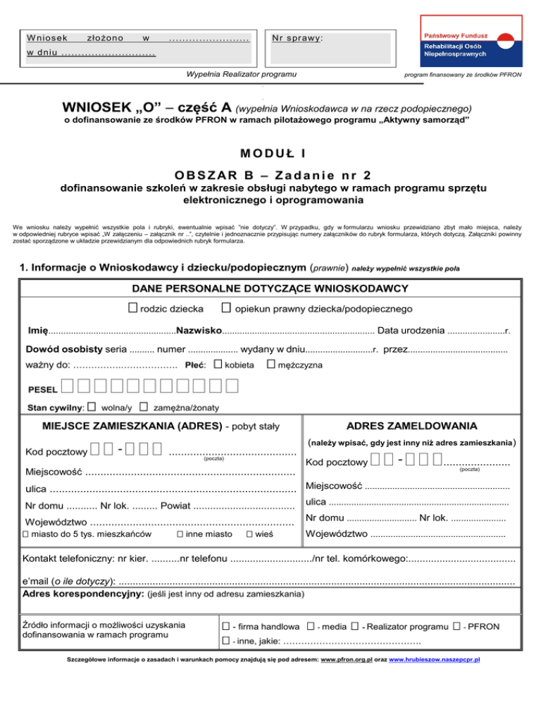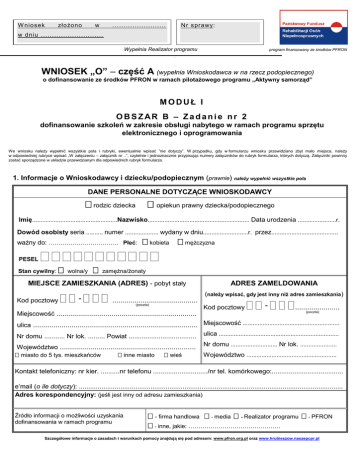 W nios ek złożono w ........................ Nr s prawy: w dniu ............................ Wypełnia Realizator programu program finansowany ze środków PFRON WNIOSEK „O” – część A (wypełnia Wnioskodawca w na rzecz podopiecznego) o dofinansowanie ze środków PFRON w ramach pilotażowego programu „Aktywny samorząd” MODUŁ I OBSZAR B – Zadanie nr 2 dofinansowanie szkoleń w zakresie obsługi nabytego w ramach programu sprzętu elektronicznego i oprogramowania We wniosku należy wypełnić wszystkie pola i rubryki, ewentualnie wpisać ”nie dotyczy”. W przypadku, gdy w formularzu wniosku przewidziano zbyt mało miejsca, należy w odpowiedniej rubryce wpisać „W załączeniu – załącznik nr ..”, czytelnie i jednoznacznie przypisując numery załączników do rubryk formularza, których dotyczą. Załączniki powinny zostać sporządzone w układzie przewidzianym dla odpowiednich rubryk formularza. 1. Informacje o Wnioskodawcy i dziecku/podopiecznym (prawnie) należy wypełnić wszystkie pola DANE PERSONALNE DOTYCZĄCE WNIOSKODAWCY rodzic dziecka opiekun prawny dziecka/podopiecznego Imię...................................................Nazwisko............................................................. Data urodzenia .......................r. Dowód osobisty seria .......... numer .................... wydany w dniu...........................r. przez........................................ ważny do: …………….………………. Płeć: PESEL kobieta mężczyzna Stan cywilny: wolna/y zamężna/żonaty MIEJSCE ZAMIESZKANIA (ADRES) - pobyt stały Kod pocztowy - .......................................... (poczta) Miejscowość ..................................................................... ADRES ZAMELDOWANIA (należy wpisać, gdy jest inny niż adres zamieszkania) Kod pocztowy - ...................... (poczta) ulica ................................................................................. Miejscowość .......................................................... Nr domu ........... Nr lok. ......... Powiat .................................... ulica ........................................................................ Województwo ................................................................... miasto do 5 tys. mieszkańców inne miasto wieś Nr domu ............................ Nr lok. ...................... Województwo ...................................................... Kontakt telefoniczny: nr kier. ..........nr telefonu ............................./nr tel. komórkowego:...................................... e’mail (o ile dotyczy): ............................................................................................................................................ Adres korespondencyjny: (jeśli jest inny od adresu zamieszkania) Źródło informacji o możliwości uzyskania dofinansowania w ramach programu - firma handlowa - media - Realizator programu - PFRON - inne, jakie: ………………………………………. Szczegółowe informacje o zasadach i warunkach pomocy znajdują się pod adresem: www.pfron.org.pl oraz www.hrubieszow.naszepcpr.pl W n i o s e k „O ” d o t y c zą c y d o f i n a n s o w a n i a w r a ma c h p i l o t a żo w e g o p r o g r a mu „A k t y w n y s a mo r zą d ” STRONA 2 DANE DOTYCZĄCE DZIECKA/PODOPIECZNEGO, zwanego dalej „podopiecznym” DANE PERSONALNE MIEJSCE ZAMIESZKANIA (ADRES) (jeśli inny niż Wnioskodawcy – pobyt stały) Imię .................................................................... Kod pocztowy Nazwisko ............................................................ - ............................................ (poczta) Miejscowość ................................................................. Data urodzenia:................................................. r. Ulica ............................................................................ PESEL Pełnoletni: Płeć: tak kobieta Nr domu ........................... Nr lok. ................................ Powiat .......................................................................... nie mężczyzna Województwo ............................................................... miasto do 5 tys. mieszkańców inne miasto wieś STAN PRAWNY DOT. NIEPEŁNOSPRAWNOŚCI PODOPIECZNEGO całkowita niezdolność do pracy i do samodzielnej egzystencji lub znaczny stopień całkowita niezdolność do samodzielnej egzystencji I grupa inwalidzka całkowita niezdolność do pracy umiarkowany stopień II grupa inwalidzka częściowa niezdolność do pracy lekki stopień III grupa inwalidzka orzeczenie o niepełnosprawności – w przypadku osób do 16 roku życia Orzeczenie dot. niepełnosprawności ważne jest: okresowo do dnia: .................................................. bezterminowo RODZAJ NIEPEŁNOSPRAWNOŚCI PODOPIECZNEGO NARZĄD RUCHU 05-R, w zakresie: obu kończyn dolnych obu kończyn górnych jednej kończyny dolnej jednej kończyny górnej innym Podopieczny porusza się samodzielnie przy pomocy wózka inwalidzkiego: Podopieczny porusza się niesamodzielnie przy pomocy wózka inwalidzkiego: Podopieczny nie porusza się przy pomocy wózka inwalidzkiego: NARZĄD WZROKU 04-O Lewe oko: Prawe oko: Ostrość wzoru (w korekcji):.............................. Ostrość wzoru (w korekcji):................................... osoba niewidoma Zwężenie pola widzenia: ....................... stopni Zwężenie pola widzenia: ............................ stopni osoba głuchoniewidoma INNE PRZYCZYNY niepełnosprawności wynikające z orzeczenia (proszę zaznaczyć właściwy kod/symbol ): 01-U upośledzenie 03-L zaburzenia głosu, 07-S choroby układu 09-M choroby układu 11-I inne umysłowe mowy i choroby słuchu oddechowego i krążenia 02-P - OSOBA GŁUCHA 06-E epilepsja 08-T choroby układu 10-N choroby psychiczne . pokarmowego moczowo - płciowego choroby neurologiczne 12-C całościowe zaburzenia rozwojowe W n 