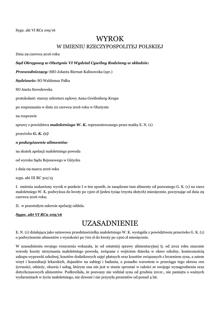 Sygn. akt VI RCa 109/16 WYROK W IMIENIU RZECZYPOSPOLITEJ POLSKIEJ Dnia 29 czerwca 2016 roku Sąd Okręgowy w Olsztynie VI Wydział Cywilny Rodzinny w składzie: Przewodniczący: SSO Jolanta Biernat-Kalinowska (spr.) Sędziowie: SO Waldemar Pałka SO Aneta Szwedowska protokolant: starszy sekretarz sądowy Anna Greifenberg-Krupa po rozpoznaniu w dniu 22 czerwca 2016 roku w Olsztynie na rozprawie sprawy z powództwa małoletniego W. K. reprezentowanego przez matkę E. N. (1) przeciwko G. K. (1) o podwyższenie alimentów na skutek apelacji małoletniego powoda od wyroku Sądu Rejonowego w Giżycku z dnia 09 marca 2016 roku sygn. akt III RC 312/15 I. zmienia zaskarżony wyrok w punkcie I w ten sposób, że zasądzone tam alimenty od pozwanego G. K. (1) na rzecz małoletniego W. K. podwyższa do kwoty po 1300 zł (jeden tysiąc trzysta złotych) miesięcznie, poczynając od dnia 29 czerwca 2016 roku; II. w pozostałym zakresie apelację oddala. Sygn. akt VI RCa 109/16 UZASADNIENIE E. N. (1) działająca jako ustawowa przedstawicielka małoletniego W. K. wystąpiła z powództwem przeciwko G. K. (1) o podwyższenie alimentów z wysokości po 700 zł do kwoty po 1300 zł miesięcznie. W uzasadnieniu swojego roszczenia wskazała, że od ostatniej sprawy alimentacyjnej tj. od 2012 roku znacznie wzrosły koszty utrzymania małoletniego powoda, związane z wejściem dziecka w okres szkolny, koniecznością zakupu wyprawki szkolnej, kosztów dodatkowych zajęć płatnych oraz kosztów związanych z leczeniem syna, a zatem wizyt i konsultacji lekarskich, dojazdów na zabiegi i badania, a ponadto wzrostem w przeciągu tego okresu cen żywności, odzieży, obuwia i usług, którym ona nie jest w stanie sprostać w całości ze swojego wynagrodzenia oraz dotychczasowych alimentów. Podkreślała, że pozwany nie widział syna od grudnia 2011r., nie pamięta o ważnych wydarzeniach w życiu małoletniego, nie dzwoni i nie przysyła prezentów od ponad 4 lat. Pozwany G. K. (1) ostatecznie uznał powództwo do kwoty po 900 zł miesięcznie. Sąd Rejonowy w Giżycku wyrokiem z dnia 9 marca 2016 r. podwyższył alimenty ustalone od pozwanego G. K. (1) na rzecz małoletniego W. K. ustalone wyrokiem Sądu Rejonowego w Giżycku z dnia 27 września 2011 r. z kwoty po 700 złotych miesięcznie do kwoty po 1000 złotych miesięcznie, płatne z góry do 10 dnia każdego miesiąca, z ustawowymi odsetkami na wypadek zwłoki w płatności każdej z rat, płatne do rąk matki małoletniego E. N. (1) poczynając od dnia 28 sierpnia 2015 r.; w pozostałym zakresie powództwo oddalił; zwolnił pozwanego od opłaty sądowej od której powódka była zwolniona z mocy ustawy; wyrokowi w punkcie zasądzającym podwyższone alimenty nadał rygor natychmiastowej wykonalności. Sąd ten ustalił, że wyrokiem Sądu Rejonowego w Giżycku z 27 stycznia 2012 r. w sprawie III RC 552/11 pozwany G. K. (1) został zobowiązany do uiszczania podwyższonych alimentów w kwocie po 700 zł miesięcznie na rzecz małoletniego W. K.. W wyroku rozwodowym Sądu Okręgowego w Olsztynie w sprawie VI RC 826/12 z 27 maja 2013 r. zostały utrzymane dotychczasowe alimenty na małoletniego powoda tj. po 700 zł miesięcznie. Matka małoletniego E. N. (1), zamieszkuje wraz z synem w mieszkaniu własnościowym o powierzchni 41 m2, na zakup którego zaciągnęła kredyt w wysokości 46.600 zł na 30 lat, a miesięczna rata wynosi ok. 500 zł., za które czynsz wynosi 460 zł miesięcznie, opłata za wodę jest wliczona w czynsz, za energię ok. 80 zł miesięcznie, za gaz ok.100 zł miesięcznie oraz z multimedia – 98 zł miesięcznie. Z wykształcenia jest technikiem (...) i zatrudniona jest w (...)w W. jako (...) i zarabia 2411 zł netto. Z wynagrodzenia za pracę oraz dotychczasowych alimentów tj. łącznej kwoty w wysokości ok. 3100 zł miesięcznie, po uiszczeniu kosztów utrzymania mieszkania, które oscylują w wysokości ok. 800 zł, oraz raty kredytu za mieszkanie w wysokości ok. 500 zł miesięcznie pozostaje powódce kwota ok. 1800 zł miesięcznie, która nie pozwala na zaspokojenie wszystkich usprawiedliwionych potrzeb związanych z utrzymaniem prawie (...)syna. Małoletni korzysta z dodatkowych zajęć z języka angielskiego, których miesięczny koszt to 50 zł a roczny koszt zakupu książek i ćwiczeń to ok. 100 zł. Ponadto małoletni korzysta z basenu i wyjazdów do kina, co miesięcznie wynosi ok. 80 zł. Ponadto matka musi zakupić dziecku odpowiednie akcesoria ochronne do jazdy na rowerze z uwagi na jego chorobę krwi, jak również ponieść koszty wizyt w poradniach: hematologicznej z uwagi na zaburzenia krzepnięcia krwi i chirurgiczno- ortopedycznej z powodu wady stopy: płaskostopia i koślawości i dojazdów do nich jak również zakupu specjalnego obuwia, wkładek ortopedycznych a nadto maści na krwiaki, odpowiednich witamin podnoszących odporność, gąbek tamujących krwawienie, środków opatrunkowych. Pozwany G. K. (1) oprócz małoletniego powoda posiada na utrzymaniu ponad roczną córkę z aktualnego związku małżeńskiego. Zamieszkuje on z żoną i dzieckiem w K. w mieszkaniu Spółki (...) o powierzchni 90 m2, w której posiada 30% udziałów. Czynsz za mieszkanie wynosi 550 zł miesięcznie, opłata za energię – ok. 300 zł miesięcznie. Pozwany G. K. (1) z wykształcenia jest inżynierem(...), a ponadto ukończył zorganizowany przez PUP kurs operatora koparko-ładowarki i aktualnie zatrudniony jest jako (...) w firmie swojego brata za wynagrodzeniem ok. 3000 zł w sezonie letnim i ok.2500 zł w pozostałym okresie. Posiada on gospodarstwo rolne o pow. 4,0800 ha użytków rolnych na terenie Gminy R.. W 2015 r. zostały wypłacone mu płatności (...) w kwocie 730,32 zł, zaś w zakresie płatności obszarowych proces weryfikacji kwalifikowalności wniosku nie został jeszcze zakończony. Dotychczas otrzymywał on kwotę ok.3100 zł rocznie, z której opłacał podatek rolny kwartalny w kwocie 164 zł