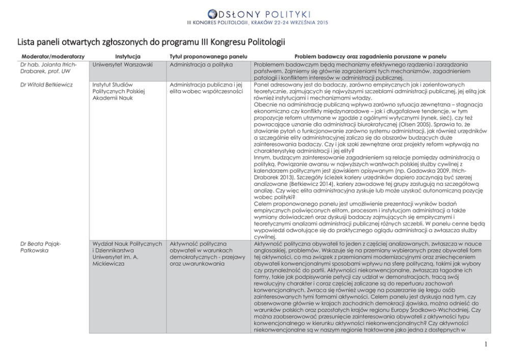 Lista paneli otwartych zgųoszonych do programu III Kongresu Politologii