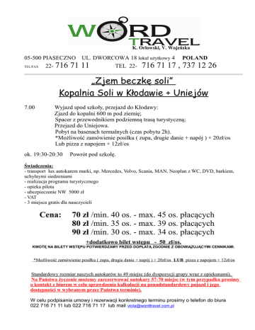 K. Orłowski, V. Wojeńska 05-500 PIASECZNO UL. DWORCOWA 18 lokal użytkowy 4 TEL/FAX 22- 716 71 11 TEL 22- 716 71 17 POLAND , 737 12 26 „Zjem beczkę soli” Kopalnia Soli w Kłodawie + Uniejów 7.00 Wyjazd spod szkoły, przejazd do Kłodawy: Zjazd do kopalni 600 m pod ziemię; Spacer z przewodnikiem podziemną trasą turystyczną; Przejazd do Uniejowa. Pobyt na basenach termalnych (czas pobytu 2h). *Możliwość zamówienie posiłku ( zupa, drugie danie + napój ) + 20zł/os Lub pizza z napojem + 12zł/os ok. 19:30-20:30 Powrót pod szkołę. Świadczenia: - transport lux autokarem marki, np. Mercedes, Volvo, Scania, MAN, Neoplan z WC, DVD, barkiem, uchylnymi siedzeniami - realizacja programu turystycznego - opieka pilota - ubezpieczenie NW 5000 zł - VAT - 3 miejsca gratis dla nauczycieli Cena: 70 zł /min. 40 os. - max. 45 os. płacących 80 zł /min. 35 os. - max. 39 os. płacących 90 zł /min. 30 os. - max. 34 os. płacących +dodatkowo bilet wstępu - 50 zł/os. KWOTĘ NA BILETY WSTĘPU POTWIERDZAMY PRZED DOPŁATĄ ZGODNIE Z OBOWIĄZUJĄCYMI CENNIKAMI. *Możliwość zamówienie posiłku ( zupa, drugie danie + napój ) + 20zł/os LUB pizza z napojem + 12zł/os Standardowy rozmiar naszych autokarów to 49 miejsc (do dyspozycji grupy wraz z opiekunami). Na Państwa życzenie możemy zarezerwować autokary 57-70 miejsc (w tym przypadku prosimy o kontakt z biurem w celu sprawdzenia kalkulacji na ponadstandardowy pojazd i jego dostępności w wybranym przez Państwa terminie). W celu podpisania umowy i rezerwacji konkretnego terminu prosimy o telefon do biura 022 716 71 11 lub 022 716 71 17 lub mail [email protected] Ze względu na szczyt sezonu wycieczek szkolnych w miesiącach maj-czerwiec sugerujemy dokonanie rez. wstępnej na czas zebrania zaliczek! Wyciąg z warunków uczestnictwa imprez turystycznych organizowanych przez B.P. Word Travel (pełna wersja warunków uczestnictwa dostępna jest u nauczyciela organizującego wycieczkę) : 13. W przypadku rezygnacji lub nie uczestniczenia Uczestnika w wykupionej imprezie Organizator uprawniony jest do potrącenia RZECZYWIŚCIE PONIESIONYCH KOSZTÓW. 14. Zmiana uczestnika nie pociąga za sobą kosztów finansowych. 18. Uczestnik odpowiada za wszelkie szkody materialne wyrządzone w trakcie trwania imprezy (zniszczenia w hotelu, autokarze) 15. Jeżeli w programie jest wyjazd poza granicę Polski - uczestnik winien posiadać na miejscu zbiórki aktualnie obowiązujące dokumenty uprawniające do przekroczenia granic krajów objętych programem imprezy (wyłącznie dowód osobisty lub paszport ważny min. 6 m-cy od daty powrotu). 9 B. W przypadku chorób uznawanych za przewlekłe uczestnik winien na własny koszt wykupić dodatkowe ubezpieczenie ! ( dotyczy wycieczek zagranicznych) Klient przez dokonanie wpłaty (całkowitej lub częściowej) akceptuje program wycieczki i warunki uczestnictwa.