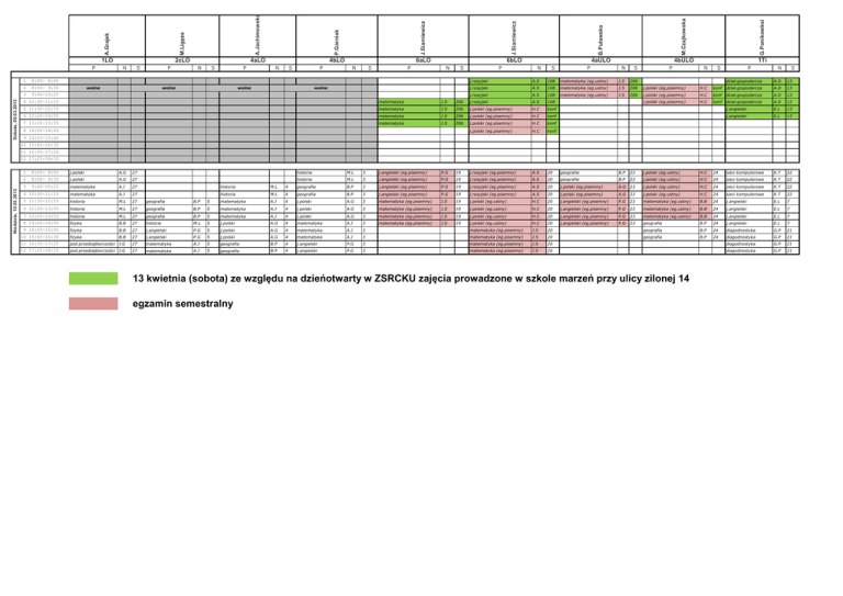 Sobota, 09.03.2013 1 8:00- 8:45 2 8:50- 9:35 3 9:40-10:25 2cLO N S P wolne 4aLO N S P wolne 4bLO N S P wolne 6aLO N S P 6bLO N S wolne P 4aULO N S P G.Ponikowksi M.Czajkowska B.Puławska J.Siarniewicz J.Siarniewicz P.Górniak A.Jachimowska M.Ligęza A.Grajek 1LO P 4bULO N S P 1Ti N S P N S j.rosyjski A.S 108 matematyka (eg.ustny) J.S 206 dział.gospodarcza A.D 13 j.rosyjski A.S 108 matematyka (eg.ustny) J.S 206 j.polski (eg.pisemny) H.C konf dział.gospodarcza A.D 13 j.rosyjski A.S 108 matematyka (eg.ustny) J.S 206 j.polski (eg.pisemny) H.C konf dział.gospodarcza A.D 13 j.polski (eg.pisemny) H.C konf dział.gospodarcza A.D 13 4 10:30-11:15 matematyka J.S 206 j.rosyjski A.S 108 5 11:30-12:15 matematyka J.S 206 j.polski (eg.pisemny) H.C konf j.angielski E.L 13 6 12:20-13:05 matematyka J.S 206 j.polski (eg.pisemny) H.C konf j.angielski E.L 13 7 13:10-13:55 matematyka J.S 206 j.polski (eg.pisemny) H.C konf j.polski (eg.pisemny) H.C konf 8 14:00-14:45 9 14:55-15:40 10 15:45-16:30 11 16:35-17:20 Niedziela, 10.03.2013 12 17:25-18:10 1 2 8:00- 8:45 8:50- 9:35 j.polski A.G 27 historia M.L 3 j.angielski (eg.pisemny) P.G 19 j.rosyjski (eg.pisemny) A.S 20 geografia B.P 23 j.polski (eg.ustny) H.C 24 sieci komputerowe K.T 22 j.polski A.G 27 historia M.L 3 j.angielski (eg.pisemny) P.G 19 j.rosyjski (eg.pisemny) A.S 20 geografia B.P 23 j.polski (eg.ustny) H.C 24 sieci komputerowe K.T 22 3 9:40-10:25 matematyka A.J 27 historia M.L 4 geografia B.P 3 j.angielski (eg.pisemny) P.G 19 j.rosyjski (eg.pisemny) A.S 20 j.polski (eg.pisemny) A.G 23 j.polski (eg.ustny) H.C 24 sieci komputerowe K.T 22 4 10:30-11:15 matematyka A.J 27 historia M.L 4 geografia B.P 3 j.angielski (eg.pisemny) P.G 19 j.rosyjski (eg.pisemny) A.S 20 j.polski (eg.pisemny) A.G 23 j.polski (eg.ustny) H.C 24 sieci komputerowe K.T 22 5 11:30-12:15 historia M.L 27 geografia B.P 5 matematyka A.J 4 j.polski A.G 3 matematyka (eg.pisemny) J.S 19 j.polski (eg.ustny) H.C 20 j.angielski (eg.pisemny) P.G 23 matematyka (eg.ustny) B.B 24 j.angielski E.L 7 6 12:20-13:05 historia M.L 27 geografia B.P 5 matematyka A.J 4 j.polski A.G 3 matematyka (eg.pisemny) J.S 19 j.polski (eg.ustny) H.C 20 j.angielski (eg.pisemny) P.G 23 matematyka (eg.ustny) B.B 24 j.angielski E.L 7 7 13:10-13:55 historia M.L 27 geografia B.P 5 matematyka A.J 4 j.polski A.G 3 matematyka (eg.pisemny) J.S 19 j.polski (eg.ustny) H.C 20 j.angielski (eg.pisemny) P.G 23 matematyka (eg.ustny) B.B 24 j.angielski E.L 7 8 14:00-14:45 fizyka B.B 27 historia M.L 5 j.polski A.G 4 matematyka A.J 3 matematyka (eg.pisemny) J.S 19 j.polski (eg.ustny) H.C 20 j.angielski (eg.pisemny) P.G 23 geografia B.P 24 j.angielski E.L 7 9 14:55-15:40 fizyka B.B 27 j.angielski P.G 5 j.polski A.G 4 matematyka A.J 3 matematyka (eg.pisemny) J.S 20 geografia B.P 24 diagodnostyka G.P 21 10 15:45-16:30 fizyka B.B 27 j.angielski P.G 5 j.polski A.G 4 matematyka A.J 3 matematyka (eg.pisemny) J.S 20 geografia B.P 24 diagodnostyka G.P 21 11 16:35-17:20 pod.przedsiębiorczości J.G 27 matematyka A.J 5 geografia B.P 4 j.angielski P.G 3 matematyka (eg.pisemny) J.S 20 diagodnostyka G.P 21 12 17:25-18:10 pod.przedsiębiorczości J.G 27 matematyka A.J 5 geografia B.P 4 j.angielski P.G 3 matematyka (eg.pisemny) J.S 20 diagodnostyka G.P 21 13 kwietnia (sobota) ze względu na dzieńotwarty w ZSRCKU zajęcia prowadzone w szkole marzeń przy ulicy zilonej 14 egzamin semestralny 4Ti N S P 1TR N S P sys.operacyjne K.T 110 dział.gospodarcza sys.operacyjne K.T 110 dział.gospodarcza sys.operacyjne K.T 110 sys.operacyjne K.T 110 4TR N 1TBHP N S P 2TBHP N S P 4TAK S P N S J.C 208 rachunkowość M.O 14 tech.bezp.pracy I.B 103 J.C 208 rachunkowość M.O 14 tech.bezp.pracy I.B 103 dział.gospodarcza J.C 208 rachunkowość M.O 14 us.przyczyn i wypadków J.G dział.gospodarcza J.C 208 rachunkowość M.O 14 tech.bezp.pracy I.B 104 us.przyczyn i wypadków P R.Koperska M.Bajkowska - Zawa L.Jabłońska G.Fehler G.Fehler M.Olszewska Z.Kisiel K.Talarek G.Ponikowksi 2Ti P 2OPŚ 4TUK N S P N S specjalizacjia S.N 105 specjalizacjia S.N 105 103 specjalizacjia S.N J.G 103 specjalizacjia P N S j.angielski E.L 107 j.angielski E.L 107 105 j.angielski E.L 107 S.N 105 j.angielski E.L 107 sieci komputerowe K.T 110 dział.gospodarcza A.D 208 finanse J.C 14 tech.bezp.pracy I.B 104 us.przyczyn i wypadków J.G 103 kosmetologia S.N 150 trening um.społecznych M.A 107 sieci komputerowe K.T 110 dział.gospodarcza A.D 208 finanse J.C 14 tech.bezp.pracy I.B 104 zarządz.sys.bhp J.G 103 kosmetologia S.N 105 trening um.społecznych M.A 107 sieci komputerowe K.T 110 dział.gospodarcza A.D 208 finanse J.C 14 tech.bezp.pracy I.B 104 zarządz.sys.bhp J.G 103 psychologia M.A 105 sieci komputerowe K.T 110 dział.gospodarcza A.D 208 finanse J.C 14 zarządz.sys.bhp J.G 103 eksp.maszyn I.B 13 psychologia M.A 105 sys.operacyjne K.T 110 dział.gospodarcza A.D 208 finanse J.C 14 zarządz.sys.bhp J.G 103 eksp.maszyn I.B 13 sys.operacyjne K.T 110 zarządz.sys.bhp J.G 103 eksp.maszyn I.B 13 sys.operacyjne K.T 110 zarządz.sys.bhp J.G 103 eksp.maszyn I.B 13 sys.operacyjne K.T 110 zarządz.sys.bhp J.G 103 pr.strukturalne G.P 21 j.angielski E.L 206 tech.bezp.pracy I.B 104 zarządz.sys.bhp J.G 103 pr.kosmetyki 2gr salon pr.strukturalne G.P 21 j.angielski E.L 206 tech.bezp.pracy I.B 104 zarządz.sys.bhp J.G 103 pr.kosmetyki 2gr salon multimedia G.P 21 j.angielski E.L 206 tech.bezp.pracy I.B 104 zarządz.sys.bhp J.G 103 pr.kosmetyki 2gr salon opieka i pielęgnacaja czł R.K 107 multimedia G.P 21 j.angielski E.L 206 rachunkowość M.O 14 tech.bezp.pracy I.B 104 zarządz.sys.bhp J.G 103 pr.kosmetyki 2gr salon opieka i pielęgnacaja czł R.K 107 diagodnostyka G.P 21 sys.operacyjne K.T 22 rachunkowość Z.K 206 rachunkowość M.O 14 prawo pracy T.J 104 zarządz.sys.bhp J.G 103 eksp.maszyn I.B 104 pr.kosmetyki 2gr salon opieka i pielęgnacaja czł R.K 107 diagodnostyka G.P 21 sys.operacyjne K.T 22 rachunkowość Z.K 206 rachunkowość M.O 14 prawo pracy T.J 104 zarządz.sys.bhp J.G 103 eksp.maszyn I.B 10