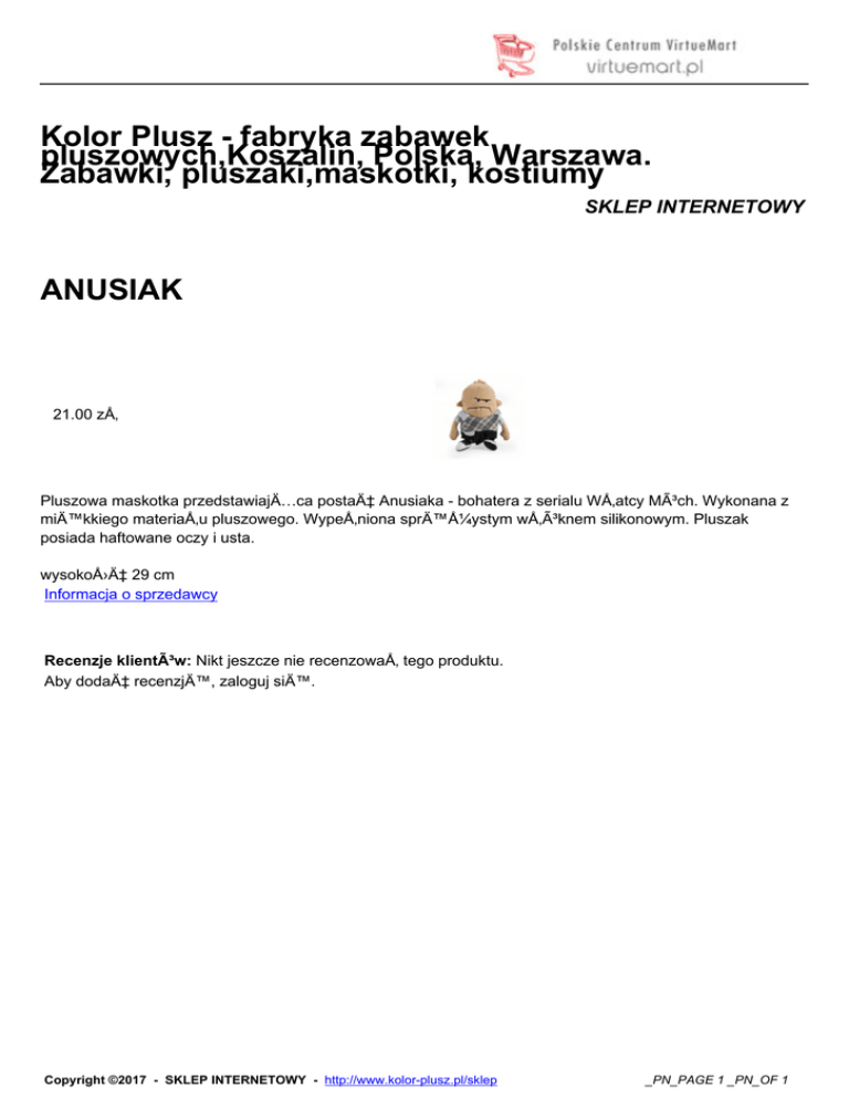 Kolor Plusz - fabryka zabawek pluszowych,Koszalin, Polska, Warszawa. Zabawki, pluszaki,maskotki, kostiumy SKLEP INTERNETOWY ANUSIAK 21.00 zÅ‚ Pluszowa maskotka przedstawiajÄ…ca postać Anusiaka - bohatera z serialu WÅ‚atcy Móch. Wykonana z miÄ™kkiego materiaÅ‚u pluszowego. WypeÅ‚niona sprężystym włóknem silikonowym. Pluszak posiada haftowane oczy i usta. wysokość 29 cm Informacja o sprzedawcy Recenzje klientów: Nikt jeszcze nie recenzowaÅ‚ tego produktu. Aby dodać recenzjÄ™, zaloguj siÄ™. Copyright ©2017 - SKLEP INTERNETOWY - http://www.kolor-plusz.pl/sklep _PN_PAGE 1 _PN_OF 1