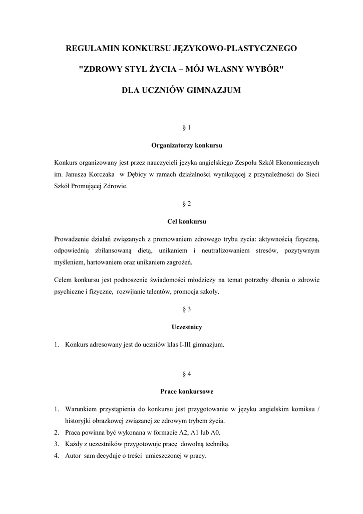 REGULAMIN KONKURSU JĘZYKOWO-PLASTYCZNEGO "ZDROWY STYL ŻYCIA – MÓJ WŁASNY WYBÓR" DLA UCZNIÓW GIMNAZJUM §1 Organizatorzy konkursu Konkurs organizowany jest przez nauczycieli języka angielskiego Zespołu Szkół Ekonomicznych im. Janusza Korczaka w Dębicy w ramach działalności wynikającej z przynależności do Sieci Szkół Promującej Zdrowie. §2 Cel konkursu Prowadzenie działań związanych z promowaniem zdrowego trybu życia: aktywnością fizyczną, odpowiednią zbilansowaną dietą, unikaniem i neutralizowaniem stresów, pozytywnym myśleniem, hartowaniem oraz unikaniem zagrożeń. Celem konkursu jest podnoszenie świadomości młodzieży na temat potrzeby dbania o zdrowie psychiczne i fizyczne, rozwijanie talentów, promocja szkoły. §3 Uczestnicy 1. Konkurs adresowany jest do uczniów klas I-III gimnazjum. §4 Prace konkursowe 1. Warunkiem przystąpienia do konkursu jest przygotowanie w języku angielskim komiksu / historyjki obrazkowej związanej ze zdrowym trybem życia. 2. Praca powinna być wykonana w formacie A2, A1 lub A0. 3. Każdy z uczestników przygotowuje pracę dowolną techniką. 4. Autor sam decyduje o treści umieszczonej w pracy. 5. Do konkursu zakwalifikowane zostaną tylko prace własnego autorstwa uczestników. Do każdej pracy powinna być załączony formularz zgłoszenia zawierający następujące dane: tytuł pracy, imię i nazwisko ucznia oraz nauczyciela opiekuna, nazwa i adres szkoły, numer kontaktowy. 6. Prace należy wysyłać w terminie do 31.03.2017 r. na adres Zespołu Szkół Ekonomicznych w Dębicy (ul. Ogrodowa 20 39-200 Dębica) bądź złożyć je w sekretariacie szkoły z dopiskiem Konkurs Językowo-Plastyczny „Zdrowy Styl Zycia”. 7. Każda szkoła może przysłać maksymalnie 5 prac. §5 Przebieg konkursu 1. Prace konkursowe ocenią członkowie Komisji Konkursowej. 2. Komisja oceniać będzie: poprawność i bogactwo językowe tekstu, kreatywność, oryginalność i pomysłowość, formę estetyczną pracy. 3. Nagrody przyznane zostaną za zajęcie I, II, III miejsca oraz w kategorii wyróżnienia. 4. Konkurs zostanie rozstrzygnięty do 10.04.2017r. Protokół z prac jury zostanie opublikowany na stronie internetowej Zespołu Szkół Ekonomicznych w Dębicy (www.ekonomik.debica.pl). Zwycięzcy oraz osoby wyróżnione będą poinformowane o wynikach konkursu oraz terminie i miejscu wręczenia nagród telefonicznie. §6 Uwagi końcowe 1. Biorąc udział w konkursie uczestnik akceptuje treść niniejszego Regulaminu. 2. Prace zgłoszone na konkurs nie będą zwracane, mogą zostać wykorzystane w działaniach informacyjno - edukacyjnych na terenie szkoły. 3. Szczegółowych informacji o konkursie udzielać będzie p. Katarzyna Hajduk (tel.: 694644488, e-mail: [email protected])