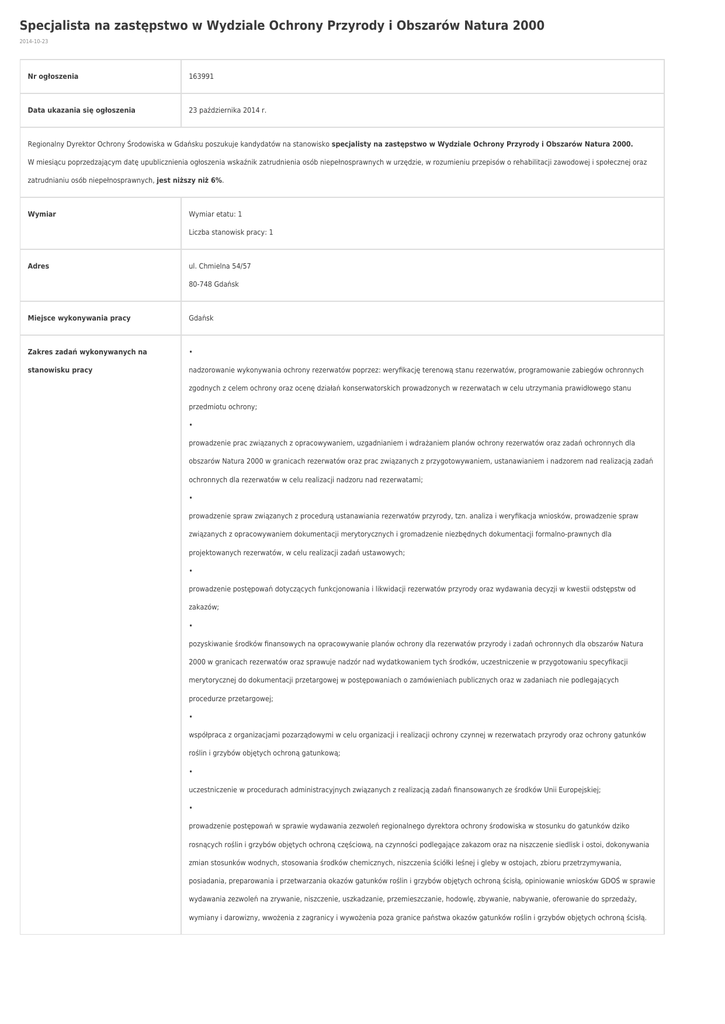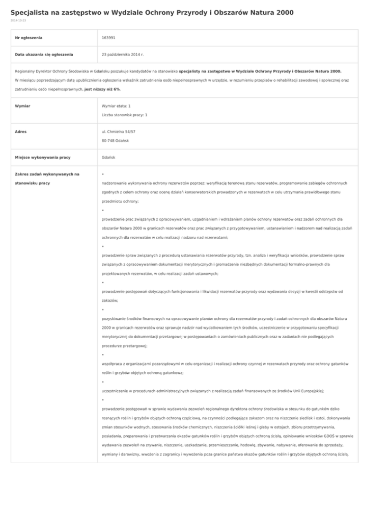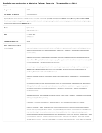 Specjalista na zastępstwo w Wydziale Ochrony Przyrody i Obszarów Natura 2000 2014-10-23 Nr ogłoszenia 163991 Data ukazania się ogłoszenia 23 października 2014 r. Regionalny Dyrektor Ochrony Środowiska w Gdańsku poszukuje kandydatów na stanowisko specjalisty na zastępstwo w Wydziale Ochrony Przyrody i Obszarów Natura 2000. W miesiącu poprzedzającym datę upublicznienia ogłoszenia wskaźnik zatrudnienia osób niepełnosprawnych w urzędzie, w rozumieniu przepisów o rehabilitacji zawodowej i społecznej oraz zatrudnianiu osób niepełnosprawnych, jest niższy niż 6%. Wymiar Wymiar etatu: 1 Liczba stanowisk pracy: 1 Adres ul. Chmielna 54/57 80-748 Gdańsk Miejsce wykonywania pracy Gdańsk Zakres zadań wykonywanych na • stanowisku pracy nadzorowanie wykonywania ochrony rezerwatów poprzez: weryfikację terenową stanu rezerwatów, programowanie zabiegów ochronnych zgodnych z celem ochrony oraz ocenę działań konserwatorskich prowadzonych w rezerwatach w celu utrzymania prawidłowego stanu przedmiotu ochrony; • prowadzenie prac związanych z opracowywaniem, uzgadnianiem i wdrażaniem planów ochrony rezerwatów oraz zadań ochronnych dla obszarów Natura 2000 w granicach rezerwatów oraz prac związanych z przygotowywaniem, ustanawianiem i nadzorem nad realizacją zadań ochronnych dla rezerwatów w celu realizacji nadzoru nad rezerwatami; • prowadzenie spraw związanych z procedurą ustanawiania rezerwatów przyrody, tzn. analiza i weryfikacja wniosków, prowadzenie spraw związanych z opracowywaniem dokumentacji merytorycznych i gromadzenie niezbędnych dokumentacji formalno-prawnych dla projektowanych rezerwatów, w celu realizacji zadań ustawowych; • prowadzenie postępowań dotyczących funkcjonowania i likwidacji rezerwatów przyrody oraz wydawania decyzji w kwestii odstępstw od zakazów; • pozyskiwanie środków finansowych na opracowywanie planów ochrony dla rezerwatów przyrody i zadań ochronnych dla obszarów Natura 2000 w granicach rezerwatów oraz sprawuje nadzór nad wydatkowaniem tych środków, uczestniczenie w przygotowaniu specyfikacji merytorycznej do dokumentacji przetargowej w postępowaniach o zamówieniach publicznych oraz w zadaniach nie podlegających procedurze przetargowej; • współpraca z organizacjami pozarządowymi w celu organizacji i realizacji ochrony czynnej w rezerwatach przyrody oraz ochrony gatunków roślin i grzybów objętych ochroną gatunkową; • uczestniczenie w procedurach administracyjnych związanych z realizacją zadań finansowanych ze środków Unii Europejskiej; • prowadzenie postępowań w sprawie wydawania zezwoleń regionalnego dyrektora ochrony środowiska w stosunku do gatunków dziko rosnących roślin i grzybów objętych ochroną częściową, na czynności podlegające zakazom oraz na niszczenie siedlisk i ostoi, dokonywania zmian stosunków wodnych, stosowania środków chemicznych, niszczenia ściółki leśnej i gleby w ostojach, zbioru przetrzymywania, posiadania, preparowania i przetwarzania okazów gatunków roślin i grzybów objętych ochroną ścisłą, opiniowanie wniosków GDOŚ w sprawie wydawania zezwoleń na zrywanie, niszczenie, uszkadzanie, przemieszczanie, hodowlę, zbywanie, nabywanie, oferowanie do sprzedaży, wymiany i darowizny, wwożenia z zagranicy i wywożenia poza granice państwa okazów gatunków roślin i grzybów objętych ochroną ścisłą. Warunki pracy Warunki dotyczące charakteru pracy na stanowisku i sposobu wykonywanie zadań: • praca w siedzibie Urzędu oraz w terenie; • częste kontakty z klientem zewnętrznym; • wykonywanie zadań pod presją czasu. Miejsce i otoczenie organizacyjno-techniczne stanowiska pracy warunki dotyczące charakteru pracy na stanowisku i sposobu wykonywanie zadań: • praca przy komputerze powyżej 4 godzin dziennie; • praca na II piętrze w budynku bez windy; • praca przy naturalnym i sztucznym oświetleniu; • przed budynkiem podjazd dla wózków inwalidzkich. Wymagania związane ze stanowiskiem niezbędne pracy - wykształcenie: wyższe: biologia, ochrona środowiska leśnictwo lub pokrewne; - doświadczenie: 1 rok doświadczenia zawodowego w obszarze ochrony środowiska lub administracji publicznej; - znajomość przepisów z zakresu: • Ustawa o udostępnianiu informacji o środowisku i jego ochronie, udziale społeczeństwa w ochronie środowiska oraz o ocenach oddziaływania na środowisko; • Ustawa z dnia 16 kwietnia 2004 r. o ochronie przyrody; • Kodeksu postępowania administracyjnego; • Służby Cywilnej; • prawa wodnego; • ustawy o odpadach; • prawa geologicznego; - umiejętność komunikowania się i pracy w zespole; - umiejętność nawiązywania kontaktów interpersonalnych; - zdolność analitycznego myślenia; - odpowiedzialność; - umiejętność obsługi komputera (środowisko Windows). dodatkowe: - przeszkolenie z zakresu finansów publicznych; - umiejętność pracy z systemami GIS; - znajomość języka angielskiego w stopniu komunikatywnym; - asertywność; - kreatywność w działaniu; - umiejętność prowadzenia rozmów i negocjacji; - znajomość: dyrektywy Rady w sprawie oceny skutków wywieranych przez niektóre przedsięwzięcia publiczne i prywatne na środowisko naturalne; Ramowej Dyrektywy Wodnej; Dyrektywy Parlamentu Europejskiego Rady nr 2009/147/WE z dnia 30 listopada 2009 r. w sprawie ochrony dzikich ptaków; dyrektywy Rady 92/43/EWG z 21 maja 1992 roku w sprawie ochrony siedlisk przyrodniczych oraz dzikiej fauny i flory; Wymagane dokumenty i oświadczenia • życiorys i list motywacyjny; • oświadczenie kandydata o wyrażeniu zgody na przetwarzanie danych osobowych do celów rekrutacji; • oświadczenie kandydata o korzystaniu z pełni praw publicznych; • oświadczenie kandydata o nieskazaniu prawomocnym wyrokiem za umyślne przestępstwo lub umyślne przestępstwo skarbowe; • kopie dokumentów potwierdzających wykształcenie; • kopia dokumentu potwierdzające