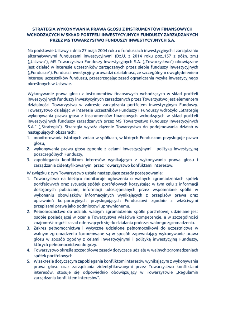 STRATEGIA WYKONYWANIA PRAWA GŁOSU Z INSTRUMENTÓW FINANSOWYCH WCHODZĄCYCH W SKŁAD PORTFELI INWESTYCYJNYCH FUNDUSZY ZARZĄDZANYCH PRZEZ MS TOWARZYSTWO FUNDUSZY INWESTYCYJNYCH S.A. Na podstawie Ustawy z dnia 27 maja 2004 roku o funduszach inwestycyjnych i zarządzaniu alternatywnymi funduszami inwestycyjnymi (Dz.U. z 2014 roku poz..157 z późn. zm.) („Ustawa”), MS Towarzystwo Funduszy Inwestycyjnych S.A. („Towarzystwo”) obowiązane jest działać w interesie uczestników zarządzanych przez siebie funduszy inwestycyjnych („Fundusze”). Fundusz inwestycyjny prowadzi działalność, ze szczególnym uwzględnieniem interesu uczestników funduszu, przestrzegając zasad ograniczania ryzyka inwestycyjnego określonych w Ustawie. Wykonywanie prawa głosu z instrumentów finansowych wchodzących w skład portfeli inwestycyjnych funduszy inwestycyjnych zarządzanych przez Towarzystwo jest elementem działalności Towarzystwa w zakresie zarządzania portfelem inwestycyjnym Funduszy. Towarzystwo działając w interesie uczestników Funduszy i Funduszy wdrożyło „Strategię wykonywania prawa głosu z instrumentów finansowych wchodzących w skład portfeli inwestycyjnych funduszy zarządzanych przez MS Towarzystwo Funduszy Inwestycyjnych S.A." („Strategia”). Strategia wyraża dążenie Towarzystwa do podejmowania działań w następujących obszarach: 1. monitorowania istotnych zmian w spółkach, w których Funduszom przysługuje prawo głosu, 2. wykonywania prawa głosu zgodnie z celami inwestycyjnymi i polityką inwestycyjną poszczególnych Funduszy, 3. zapobiegania konfliktom interesów wynikającym z wykonywania prawa głosu i zarządzania zidentyfikowanymi przez Towarzystwo konfliktami interesów. W związku z tym Towarzystwo ustala następujące zasady postępowania: 1. Towarzystwo na bieżąco monitoruje ogłoszenia o walnych zgromadzeniach spółek portfelowych oraz sytuację spółek portfelowych korzystając w tym celu z informacji dostępnych publicznie, informacji udostępnianych przez wspomniane spółki w wykonaniu obowiązków informacyjnych wynikających z przepisów prawa oraz uprawnień korporacyjnych przysługujących Funduszowi zgodnie z właściwymi przepisami prawa jako podmiotowi uprawnionemu. 2. Pełnomocnictwo do udziału walnym zgromadzeniu spółki portfelowej udzielane jest osobie posiadającej w ocenie Towarzystwa właściwe kompetencje, a w szczególności znajomość reguł i zasad odnoszących się do działania podczas walnego zgromadzenia. 3. Zakres pełnomocnictwa i wytyczne udzielone pełnomocnikowi do uczestnictwa w walnym zgromadzeniu formułowane są w sposób zapewniający wykonywanie prawa głosu w sposób zgodny z celami inwestycyjnymi i polityką inwestycyjną Funduszy, których pełnomocnictwo dotyczy. 4. Towarzystwo określa szczegółowe zasady dotyczące udziału w walnych zgromadzeniach spółek portfelowych. 5. W zakresie dotyczącym zapobiegania konfliktom interesów wynikającym z wykonywania prawa głosu oraz zarządzania zidentyfikowanymi przez Towarzystwo konfliktami interesów, stosuje się odpowiednio obowiązujący w Towarzystwie „Regulamin zarządzania konfliktem interesów”.