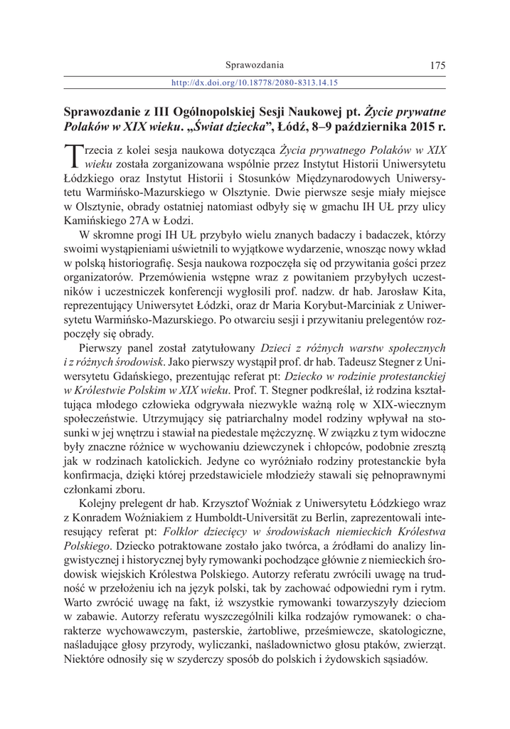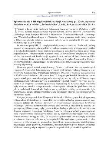 Sprawozdania 175 http://dx.doi.org/10.18778/2080-8313.14.15 Sprawozdanie z III Ogólnopolskiej Sesji Naukowej pt. Życie prywatne Polaków w XIX wieku. „Świat dziecka”, Łódź, 8–9 października 2015 r. T rzecia z kolei sesja naukowa dotycząca Życia prywatnego Polaków w XIX wieku została zorganizowana wspólnie przez Instytut Historii Uniwersytetu Łódzkiego oraz Instytut Historii i Stosunków Międzynarodowych Uniwersytetu Warmińsko-Mazurskiego w Olsztynie. Dwie pierwsze sesje miały miejsce w Olsztynie, obrady ostatniej natomiast odbyły się w gmachu IH UŁ przy ulicy Kamińskiego 27A w Łodzi. W skromne progi IH UŁ przybyło wielu znanych badaczy i badaczek, którzy swoimi wystąpieniami uświetnili to wyjątkowe wydarzenie, wnosząc nowy wkład w polską historiografię. Sesja naukowa rozpoczęła się od przywitania gości przez organizatorów. Przemówienia wstępne wraz z powitaniem przybyłych uczestników i uczestniczek konferencji wygłosili prof. nadzw. dr hab. Jarosław Kita, reprezentujący Uniwersytet Łódzki, oraz dr Maria Korybut-Marciniak z Uniwersytetu Warmińsko-Mazurskiego. Po otwarciu sesji i przywitaniu prelegentów rozpoczęły się obrady. Pierwszy panel został zatytułowany Dzieci z różnych warstw społecznych i z różnych środowisk. Jako pierwszy wystąpił prof. dr hab. Tadeusz Stegner z Uniwersytetu Gdańskiego, prezentując referat pt: Dziecko w rodzinie protestanckiej w Królestwie Polskim w XIX wieku. Prof. T. Stegner podkreślał, iż rodzina kształtująca młodego człowieka odgrywała niezwykle ważną rolę w XIX-wiecznym społeczeństwie. Utrzymujący się patriarchalny model rodziny wpływał na stosunki w jej wnętrzu i stawiał na piedestale mężczyznę. W związku z tym widoczne były znaczne różnice w wychowaniu dziewczynek i chłopców, podobnie zresztą jak w rodzinach katolickich. Jedyne co wyróżniało rodziny protestanckie była konfirmacja, dzięki której przedstawiciele młodzieży stawali się pełnoprawnymi członkami zboru. Kolejny prelegent dr hab. Krzysztof Woźniak z Uniwersytetu Łódzkiego wraz z Konradem Woźniakiem z Humboldt-Universität zu Berlin, zaprezentowali interesujący referat pt: Folklor dziecięcy w środowiskach niemieckich Królestwa Polskiego. Dziecko potraktowane zostało jako twórca, a źródłami do analizy lingwistycznej i historycznej były rymowanki pochodzące głównie z niemieckich środowisk wiejskich Królestwa Polskiego. Autorzy referatu zwrócili uwagę na trudność w przełożeniu ich na język polski, tak by zachować odpowiedni rym i rytm. Warto zwrócić uwagę na fakt, iż wszystkie rymowanki towarzyszyły dzieciom w zabawie. Autorzy referatu wyszczególnili kilka rodzajów rymowanek: o charakterze wychowawczym, pasterskie, żartobliwe, prześmiewcze, skatologiczne, naśladujące głosy przyrody, wyliczanki, naśladownictwo głosu ptaków, zwierząt. Niektóre odnosiły się w szyderczy sposób do polskich i żydowskich sąsiadów. 176 Sprawozdania Jako trzeci wystąpił profesor Uniwersytetu Łódzkiego dr hab. Jarosław Kita, prezentując artykuł pt: Peregrynacje dzieci do dziewiętnastowiecznych kurortów. Profesor podkreślił, iż do uzdrowisk na Zachodzie Europy wyjeżdżały tylko dzieci z elit społeczno-majątkowych – bogatej inteligencji, burżuazji, ziemiaństwa i arystokracji. Towarzyszyły najczęściej swoim rodzicom. Z drugiej strony zauważyć dawały się działania społeczników, którzy pomagali i finansowali wyjazdy dla dzieci niezamożnych. W drugiej połowie XIX w. coraz większą rolę pełnić zaczynały kurorty nadmorskie, gdzie dzieci miały dużo miejsc do zabawy. Nie wszystkie dzieci dobrze wspominały picie uzdrowiskowych wód, czy kąpiele w bardzo zimnej wodzie dla zahartowania organizmu czy owijanie w mokre prześcieradła. Dzieci miały także wpływ na inwestycje w sanatoriach, o czym traktowała druga część referatu. W trzeciej natomiast prof. J. Kita omawiał wyjazdy dzieci z „niezamożnych” rodzin. Po trzech referatach wnoszących nowe spojrzenie na dziecko i jego rolę w rodzinie, nastąpiła przerwa kawowa, która pozwoliła na wymianę poglądów w kuluarach. Jako pierwsza po krótkiej przerwie wystąpiła współorganizatorka konferencji dr Maria Korybut-Marciniak z Uniwersytetu Warmińsko-Mazurskiego w Olsztynie z referatem zatytułowanym Dziecko w rodzinie urzędniczej w świetle materiałów Artura Dolińskiego. Autorka zaprezentowała postać Artura Dolińskiego – urzędnika wileńskiego – oraz jego rodzinę. W szczegółowy i dogłębny sposób doktor M. Korybut-Marciniak omówiła stosunek do córek, przygotowany dla nich osobiście przez Dolińskiego program nauczania w duchu narodowym i katolickim, obejmującym bardzo wiele dziedzin m. in. arytmetykę, fizykę, mineraologię, naukę języków obcych, historię i wiele innych, po zajęcia praktyczne typu kapelusznictwo czy rysunek. Doliński szczególnie dbał o córki i nie szczędził pieniędzy na toalety dla nich. Jednakże, jak podkreśliła prelegentka, badania pokazują, iż nie każdy urzędnik mógł sobie na to pozwolić, abstrahując od tego, iż nie każdy decydował się ze względów finansowych na założenie rodziny. Niektórych przewyższało sfinansowanie edukacji swoich dzieci. W rodzinach urzędniczych ojciec często był poza domem i wychowywał pociechy poprzez listy, zachowując przy tym zasady obowiązujące w rodzinach ziemiańskich. Kolejna prelegentka wystąpiła z tematem Trudne dzieciństwo. O losach dzieci w Łodzi przełomu wieku XIX i XX. Dr Marzena Iwańska z Uniwersytetu Łódzkiego rozpoczęła swój referat od psychologicznego ukazania problemu trudnego dzieciństwa. Analiza psychologiczna pozwoliła na pogłębione przeniknięcie do świata dzieci z Łodzi, których dzieciństwo Autorka uznała za ciężkie, spędzone często w warunkach urągających człowieczeństwu. Dzieci w Łodzi na co dzień stykały się z problem