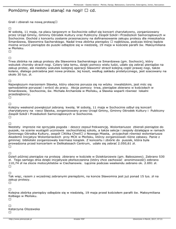 Płońszczak - Gazeta lokalna - Płońsk, Raciąż, Baboszewo, Czerwińsk, Dzierzążnia, Joniec, Naruszewo Pomóżmy Sławkowi stanąć na nogi! cd. Grali i zbierali na nową protezę W sobotę, 11 maja, na placu targowym w Sochocinie odbył się koncert charytatywny, zorganizowany przez Urząd Gminy, Gminny Ośrodek Kultury oraz Publiczny Zespół Szkół i Przedszkoli Samorządowych w Sochocinie. Dochód z koncertu zostanie przeznaczony na dofinansowanie zakupu protezy dla mieszkańca Smardzewa, Sławomira Sacherskiego. Nadal trwa zbiórka pieniędzy najbliższa, podczas której będzie można wrzucić pieniądze do puszki odbędzie się w niedzielę, 19 maja w kościele parafii św. Maksymiliana w Płońsku. Trwa zbiórka na zakup protezy dla Sławomira Sacherskiego ze Smardzewa (gm. Sochocin), który wskutek choroby stracił nogi. Cztery lata temu, dzięki pomocy wielu ludzi, udało się zebrać pieniądze na zakup protez, ale niestety wskutek kolejnej operacji Sławomir stracił kolejną część prawej nogi, także kolano, dlatego potrzebna jest nowa proteza. Jej koszt, według zakładu protetycznego, jest szacowany na około 30 tys. zł. Największym marzeniem Sławka, który obecnie porusza się na wózku inwalidzkim, jest móc się samodzielnie poruszać i wrócić do pracy. Akcja pomocy trwa, pieniądze zbierano w kościołach w Smardzewie, Sochocinie, św. Michała Archanioła w Płońsku, a Sławka wsparli również lokalni przedsiębiorcy. Kolejny weekend powiększył zebraną kwotę. W sobotę, 11 maja w Sochocinie odbył się koncert charytatywny na rzecz Sławka, zorganizowany przez Urząd Gminy, Gminny Ośrodek Kultury i Publiczny Zespół Szkół i Przedszkoli Samorządowych w Sochocinie. Niestety imprezie nie sprzyjała pogoda - deszcz zepsuł frekwencję. Wolontariusze zbierali pieniądze do puszek, na scenie wystąpili uczniowie sochocińskiej szkoły, a także sekcje i zespoły działające w ramach Gminnego Ośrodka Kultury, zespół Kilka Chwil z Nowego Miasta, przyjechali również wolontariusze Akademii Inicjatyw Wolontariackich przy MCK w Płońsku, którzy zorganizowali różne zabawy. Panie z gminnej biblioteki zorganizowały kiermasz książek. Z koncertu i zbiórki do puszek, która była prowadzona przed koncertem w Delikatesach Centrum, udało się zebrać 2.050,61 zł. Dzień później pieniądze na protezę zbierano w kościele w Dziektarzewie (gm. Baboszewo). Zebrano 530 zł. Tego samego dnia dzięki inicjatywie płońszczanina (który chce zachować anonimowość) zebrano 110,74 zł na zlocie motocyklistów w Ciechanowie. Łącznie podczas weekendu zebrano ok. 2.691 zł. Tak więc, razem z wcześniej zebranymi pieniędzmi, na koncie Sławomira jest już ponad 15 tys. zł na zakup protezy. Kolejna zbiórka pieniędzy odbędzie się w niedzielę, 19 maja przed kościołem parafii św. Maksymiliana Kolbego w Płońsku. Katarzyna Olszewska http://www.plonszczak.pl Kreator PDF Utworzono 4 March, 2017, 07:21 Płońszczak - Gazeta lokalna - Płońsk, Raciąż, Baboszewo, Czerwińsk, Dzierzążnia, Joniec, Naruszewo PS. Apelujemy o pomoc. Liczy się każda złotówka. Jeśli ktoś chce pomóc Sławkowi, może wpłacić pieniądze na jego konto: 33 8241 1019 3002 0001 4775 0001. Wolontariusze: Weronika Andruchewicz, Weronika Gizińska, Kinga Karpińska, Maria Kozłowska, Dorota Pisarzak, Iwona Śledź, Paulina Witulska, Maria Włodarska. Wystąpili: zespół muzyczny z ZSIPS w Sochocinie (Julia Adamkiewicz, Aleksandra Gajewska, Natalia Gajewska, Dorota Pisarzak, Marta Przetacka); zespół Corso (Mateusz Michalski, Jakub Piątkowski, Wiktoria Wrońska) z GOK Sochocinie; zespół Kilka Chwil (Przemysław Jonka, Angelika Michalska, Michał Wiktorowicz) z Nowego Miasta; Kapela Folkowa (Igor Andrusiewicz, Paweł Czyżewski, Marietta Duklanowska, Zbigniew Kłoszewski, Piotr Morański, Robert Widacki) z GOK Sochocin; grupa wolontariuszy Iskierka (Martyna Bujakowska, Piotr Marzęcki, Paulina Wielechowska - wolontariuszy wsparli Katarzyna i Tomasz Ornarowiczowie), działająca przy MCK Płońsk. Zbiórkę wspomagały firmy: PPHUMACZEK i Delikatesy Centrum państwa Makowskich, Sklep EDEN państwa Szabrańskich, Firma SAR-TRANS Jana Jabłońskiego. Organizatorzy dziękują OSP Sochocin oraz państwu Kopcińskim za udostępnienie energii elektrycznej. foto: Katarzyna Olszewska Więcej w Galerii http://www.plonszczak.pl Kreator PDF Utworzono 4 March, 2017, 07:21