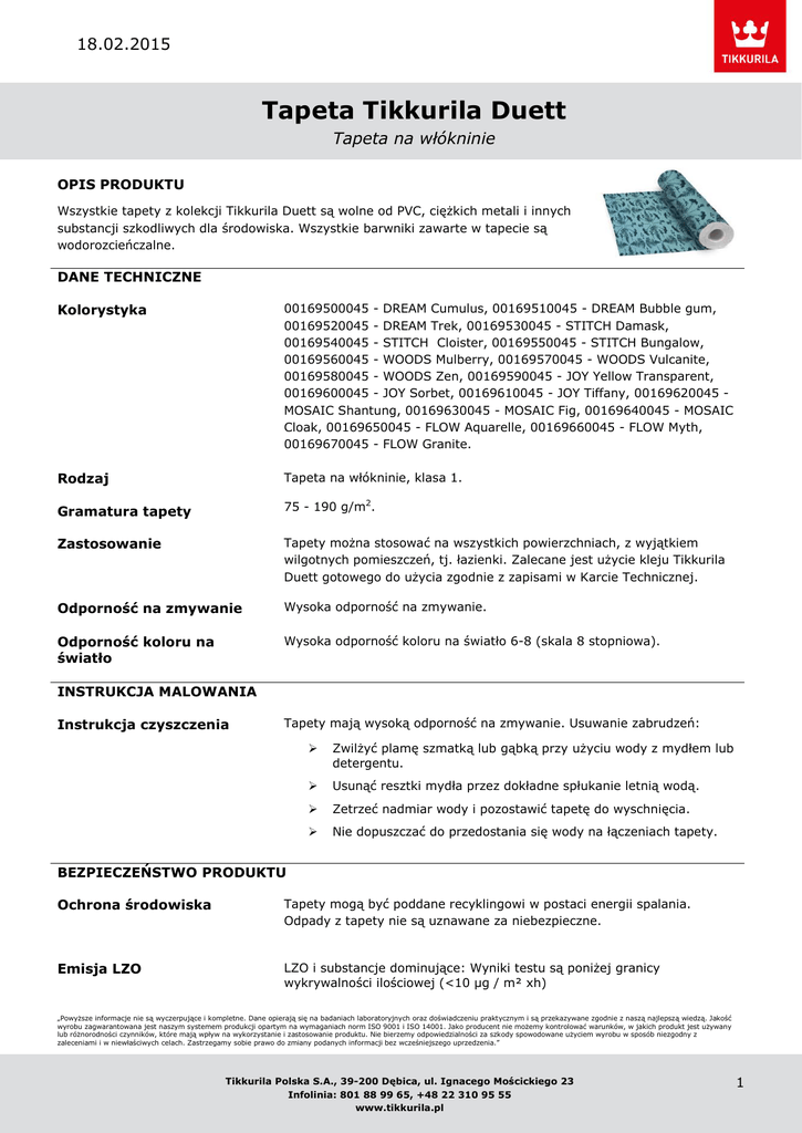18.02.2015 Tapeta Tikkurila Duett Tapeta na włókninie OPIS PRODUKTU Wszystkie tapety z kolekcji Tikkurila Duett są wolne od PVC, ciężkich metali i innych substancji szkodliwych dla środowiska. Wszystkie barwniki zawarte w tapecie są wodorozcieńczalne. DANE TECHNICZNE Kolorystyka 00169500045 - DREAM Cumulus, 00169510045 - DREAM Bubble gum, 00169520045 - DREAM Trek, 00169530045 - STITCH Damask, 00169540045 - STITCH Cloister, 00169550045 - STITCH Bungalow, 00169560045 - WOODS Mulberry, 00169570045 - WOODS Vulcanite, 00169580045 - WOODS Zen, 00169590045 - JOY Yellow Transparent, 00169600045 - JOY Sorbet, 00169610045 - JOY Tiffany, 00169620045 MOSAIC Shantung, 00169630045 - MOSAIC Fig, 00169640045 - MOSAIC Cloak, 00169650045 - FLOW Aquarelle, 00169660045 - FLOW Myth, 00169670045 - FLOW Granite. Rodzaj Tapeta na włókninie, klasa 1. Gramatura tapety 75 - 190 g/m2. Zastosowanie Tapety można stosować na wszystkich powierzchniach, z wyjątkiem wilgotnych pomieszczeń, tj. łazienki. Zalecane jest użycie kleju Tikkurila Duett gotowego do użycia zgodnie z zapisami w Karcie Technicznej. Odporność na zmywanie Wysoka odporność na zmywanie. Odporność koloru na światło Wysoka odporność koloru na światło 6-8 (skala 8 stopniowa). INSTRUKCJA MALOWANIA Instrukcja czyszczenia Tapety mają wysoką odporność na zmywanie. Usuwanie zabrudzeń: Zwilżyć plamę szmatką lub gąbką przy użyciu wody z mydłem lub detergentu. Usunąć resztki mydła przez dokładne spłukanie letnią wodą. Zetrzeć nadmiar wody i pozostawić tapetę do wyschnięcia. Nie dopuszczać do przedostania się wody na łączeniach tapety. BEZPIECZEŃSTWO PRODUKTU Ochrona środowiska Tapety mogą być poddane recyklingowi w postaci energii spalania. Odpady z tapety nie są uznawane za niebezpieczne. Emisja LZO LZO i substancje dominujące: Wyniki testu są poniżej granicy wykrywalności ilościowej (<10 µg / m² xh) „Powyższe informacje nie są wyczerpujące i kompletne. Dane opierają się na badaniach laboratoryjnych oraz doświadczeniu praktycznym i są przekazywane zgodnie z naszą najlepszą wiedzą. Jakość wyrobu zagwarantowana jest naszym systemem produkcji opartym na wymaganiach norm ISO 9001 i ISO 14001. Jako producent nie możemy kontrolować warunków, w jakich produkt jest używany lub różnorodności czynników, które mają wpływ na wykorzystanie i zastosowanie produktu. Nie bierzemy odpowiedzialności za szkody spowodowane użyciem wyrobu w sposób niezgodny z zaleceniami i w niewłaściwych celach. Zastrzegamy sobie prawo do zmiany podanych informacji bez wcześniejszego uprzedzenia.” Tikkurila Polska S.A., 39-200 Dębica, ul. Ignacego Mościckiego 23 Infolinia: 801 88 99 65, +48 22 310 95 55 www.tikkurila.pl 1