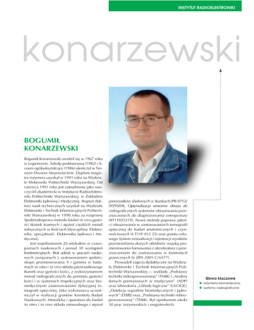 INSTYTUT RADIOELEKTRONIKI konarzewski BOGUMIŁ KONARZEWSKI Bogumił Konarzewski urodził się w 1967 roku w Legionowie. Szkołę podstawową (1982) i liceum ogólnokształcące (1986) ukończył w Nowym Dworze Mazowieckim. Dyplom magistra inżyniera uzyskał w 1991 roku na Wydziale Elektroniki Politechniki Warszawskiej. Od czerwca 1991 roku jest zatrudniony jako nauczyciel akademicki w Instytucie Radioelektroniki Politechniki Warszawskiej, w Zakładzie Elektroniki Jądrowej i Medycznej. Stopień doktora nauk technicznych uzyskał na Wydziale Elektroniki i Technik Informacyjnych Politechniki Warszawskiej w 1998 roku za rozprawę Spektroskopowa metoda badań in vivo gęstości tkanek kostnych i stężeń ciężkich metali toksycznych w kościach (dyscyplina: Elektronika, specjalność: Elektronika Jądrowa i Medyczna). Jest współautorem 20 artykułów w czasopismach naukowych i ponad 30 wystąpień konferencyjnych. Brał udział w pracach naukowych związanych z zastosowaniem spektroskopii promieniowania X i gamma w badaniach in vitro i in vivo składu pierwiastkowego tkanek oraz gęstości kości, z wykorzystaniem metod radiograficznych do pomiaru gęstości kości i w systemach inspekcyjnych oraz biomedycznymi zastosowaniami dyfuzyjnej tomografii optycznej. Jako wykonawca uczestniczył w realizacji grantów Komitetu Badań Naukowych: Metodyka i aparatura do badań in vitro i in vivo składu mineralnego i stężeń pierwiastków śladowych w tkankach (PB 0752/ /95/93/04), Optymalizacja sensorów obrazu do radiograficznych systemów obrazowania przeznaczonych do diagnozowania osteoporozy (8T11E03319), Nowe metody poprawy jakości obrazowania w zastosowaniach tomografii optycznej do badań anatomicznych i czynnościowych (4 T11E 012 25) oraz grantu celowego System wizualizacji i rejestracji wyników prześwietlania dużych obiektów wiązką promieniowania hamowania z akceleratora z przeznaczeniem do zastosowania w kontrolach granicznych (6 ZR9 2005 C/ 6577). Prowadził zajęcia dydaktyczne na Wydziale Elektroniki i Technik Informacyjnych Politechniki Warszawskiej — wykłady „Podstawy techniki mikroprocesorowej” (TMIK) i „Analiza danych pomiarowych w medycynie” (ADP) oraz laboratoria „Układy logiczne” (ULOGE), „Detekcja sygnałów biomedycznych i jądrowych” (DSBJ) oraz „Podstawy techniki mikroprocesorowej” (TMIK). Był opiekunem około 30 prac inżynierskich i magisterskich. Słowa kluczowe n inżynieria biomedyczna n systemy radiograficzne